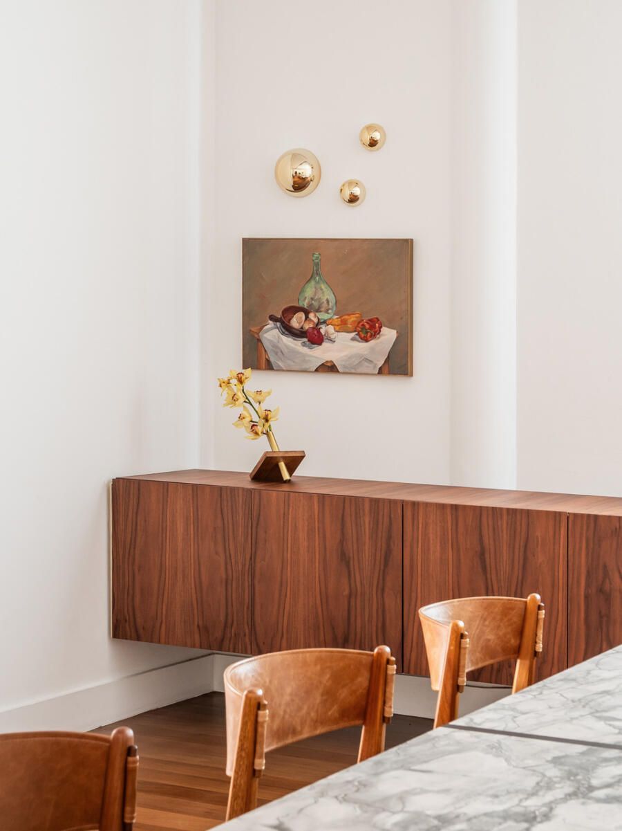A área social, no pavimento térreo, concentra alguns dos momentos mais expressivos da casa. O hall de entrada impressiona pela obra artesanal da Cornicci, instalada em uma parede de pé-direito duplo inundada de luz natural. No living, o mobiliário divide a cena com a mesa de centro Litoral, de Jacqueline Terpins, enquanto as paredes recebem a arte vibrante de Will Sampaio e a fotografia de Lucas Ferraz, que destaca a textura do serrado brasileiro. No jantar, o pendente Mush, de Jader Almeida, flutua sobre a mesa com poesia, acompanhado de um aparador em nogueira desenhado pelo escritório, que parece suspenso sobre o piso.