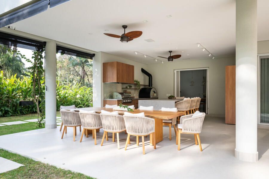 A área gourmet, último ambiente a ser executado, sintetiza o espírito do projeto. Antes fria e pouco convidativa, ela foi transformada com a ampliação do piso, um pergolado metálico com forro ripado e uma marcenaria minuciosamente desenhada para acomodar todos os equipamentos necessários para receber bem, da churrasqueira ao forno de pizza. A mesa em tora maciça e os puffs com tecidos trazidos do Peru completam um espaço pensado para encontros longos, uso descomplicado e uma relação direta com o jardim. Um final à altura de uma casa que, em cada detalhe, revela o fio condutor elegante e afetivo que torna este projeto tão especial, como revelam os próprios moradores: