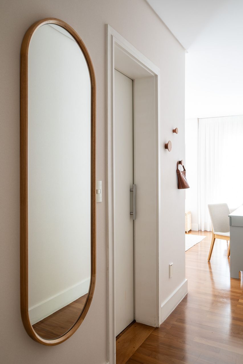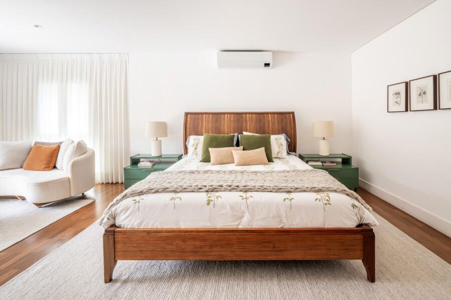 No pavimento superior, os quartos seguem a mesma lógica de aconchego e identidade. A suíte master se organiza a partir de um mobiliário delicado e funcional, com aparador desenhado pelo escritório. A suíte de hóspedes revela um olhar atento ao reaproveitamento: móveis originais foram mantidos, ganharam novos tecidos e se somaram a quadros novos e a um cabideiro feito com madeira de demolição da antiga casa da família. No quarto da filha, a cama com cabeceira em bouclé define o tom contemporâneo e delicado, enquanto a arte em fio de aço dourado, escolhida pela própria adolescente, imprime personalidade ao espaço.