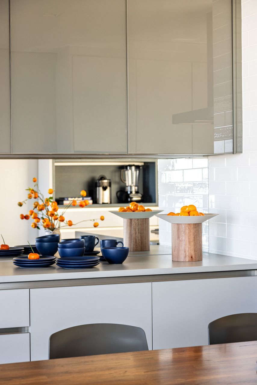 Durante a primeira reforma, a cozinha e a marcenaria de toda a casa foram completamente renovadas. Por isso, não sofreram muitas mudanças na repaginação deste ano, apenas eventuais manutenções dos acabamentos. Já as cores das paredes e tetos, armários e gabinetes foram repensados para atender a família.