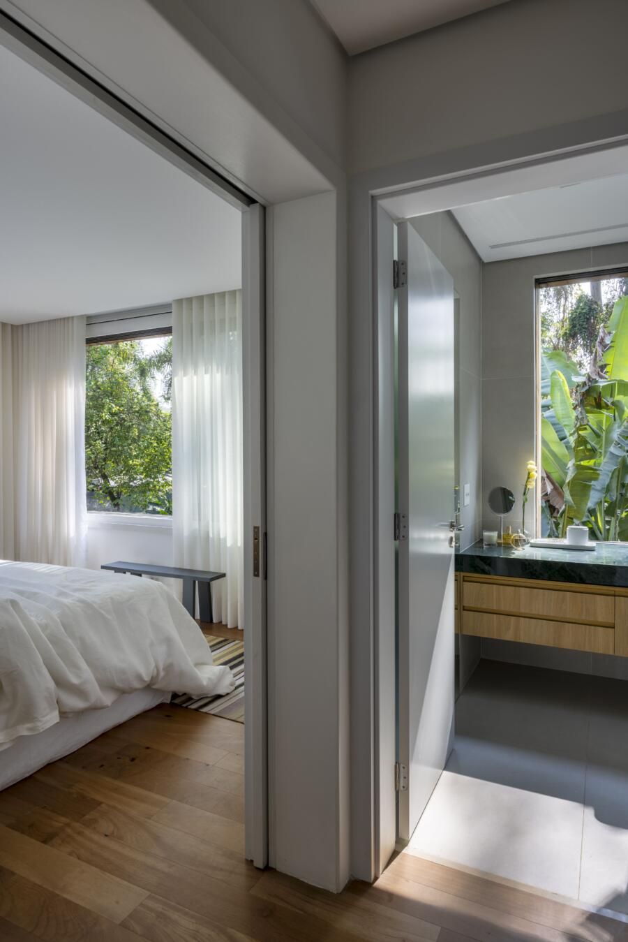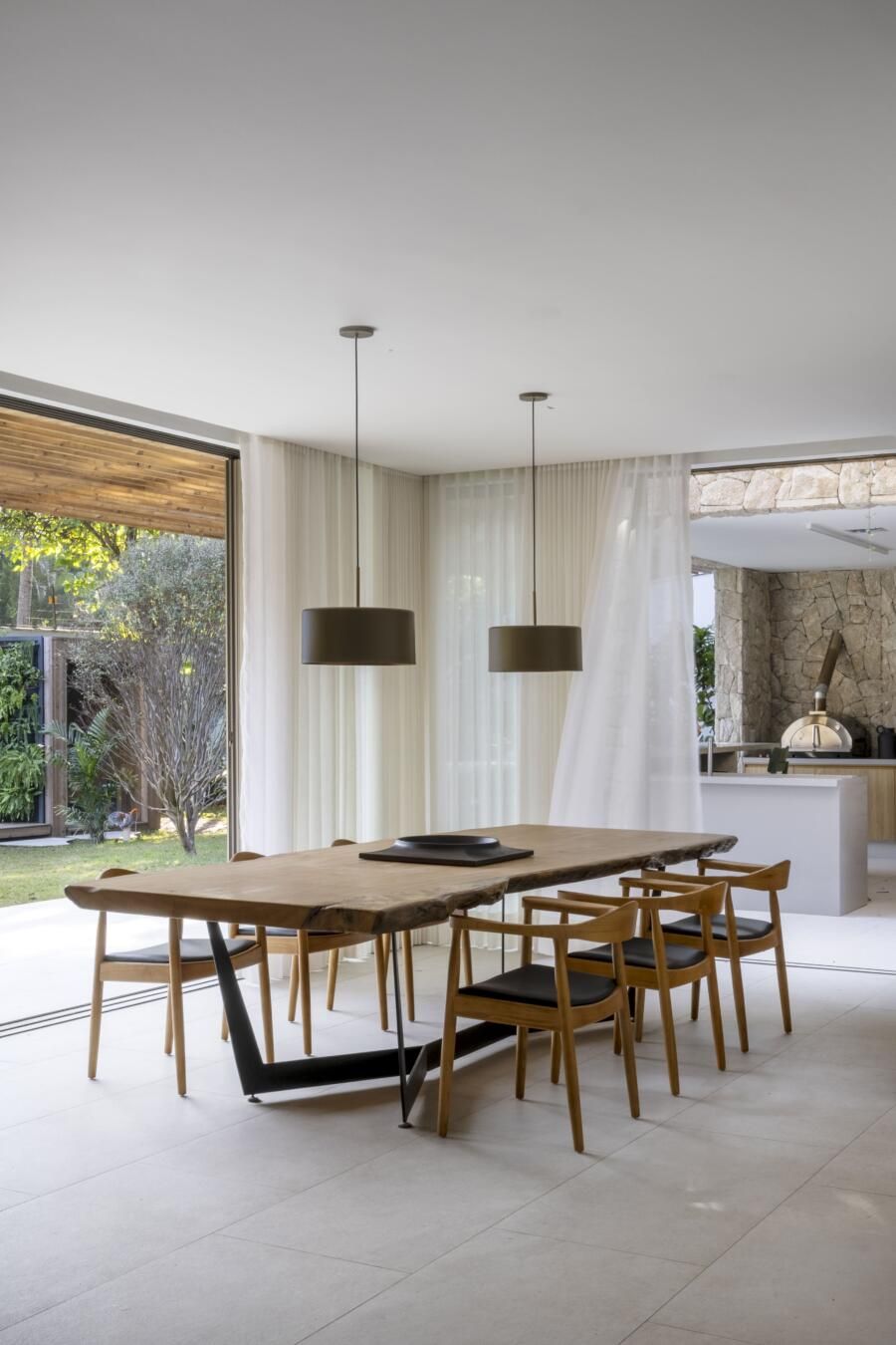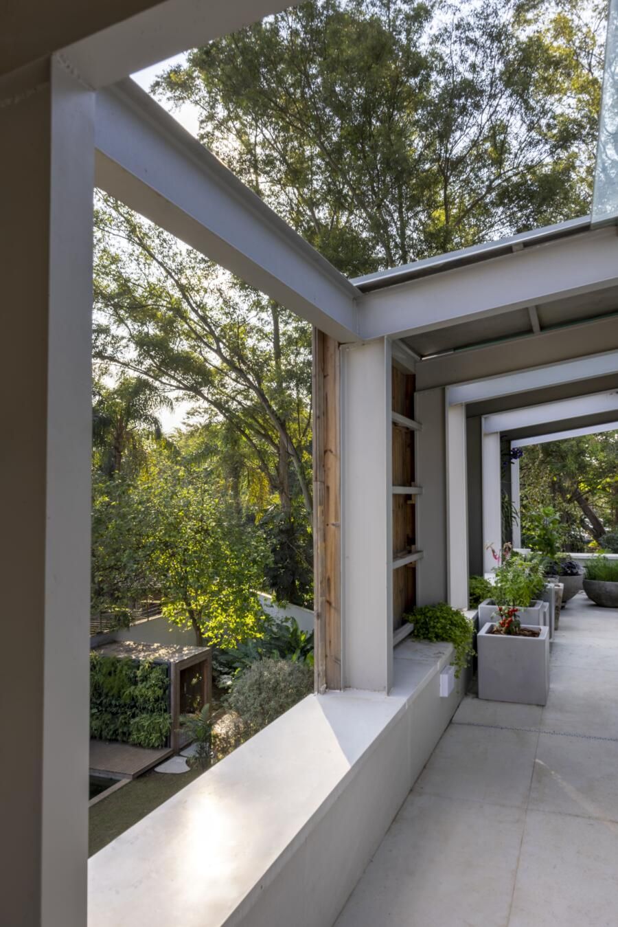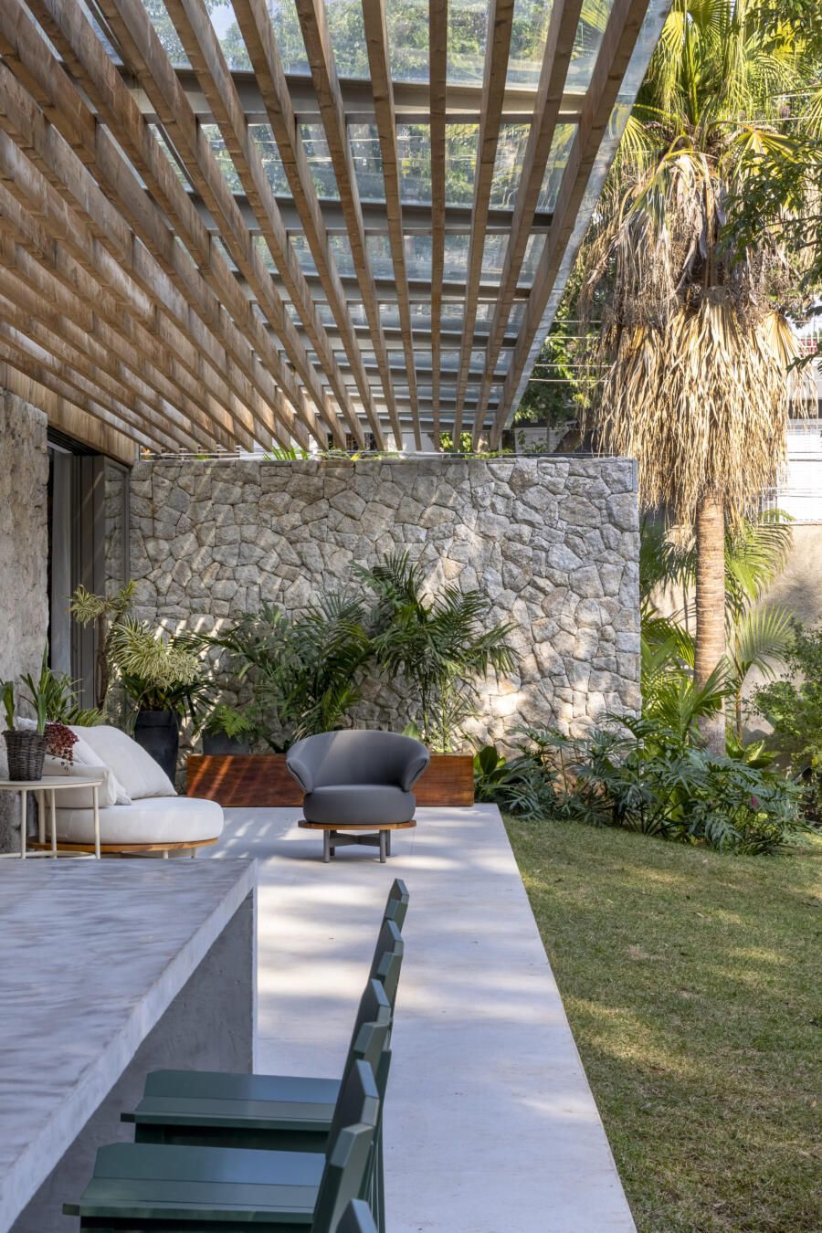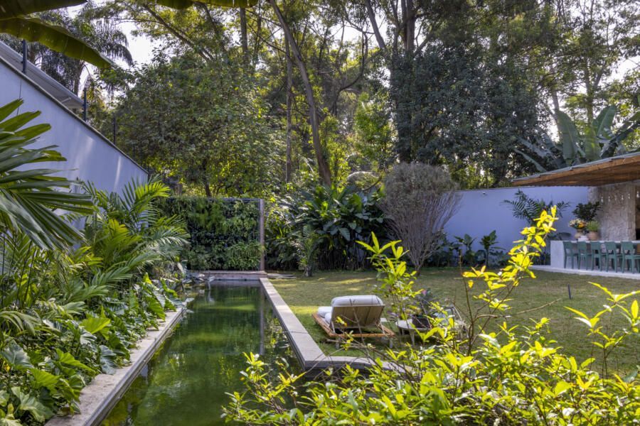 O que torna essa residência verdadeiramente única é a relação fluida com o parque. A casa foi pensada como uma continuação da vegetação local, criando uma experiência residencial rara em áreas urbanas densas: uma piscina biológica que abriga peixes e plantas, além de espaços onde se respira tranquilidade e equilíbrio.