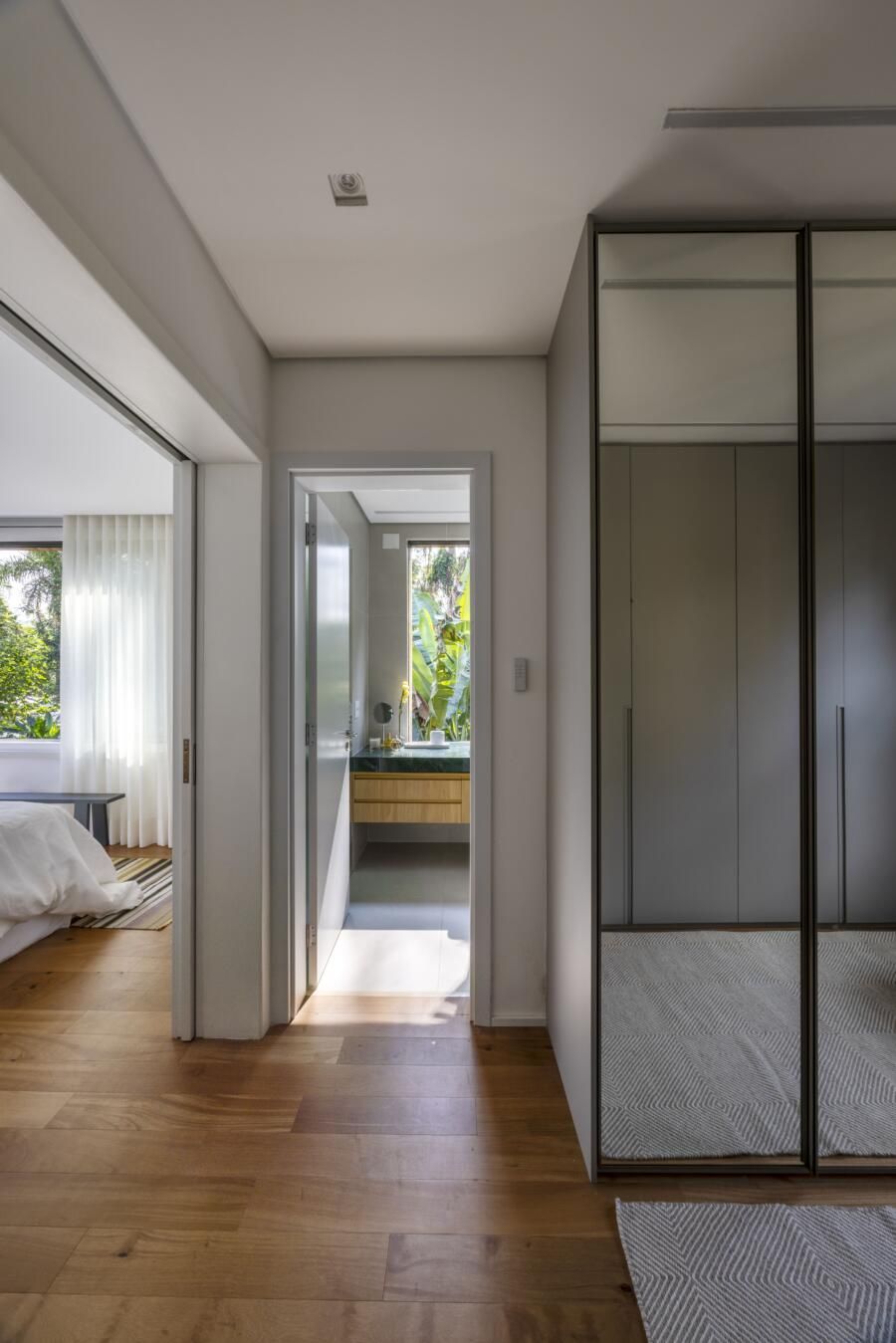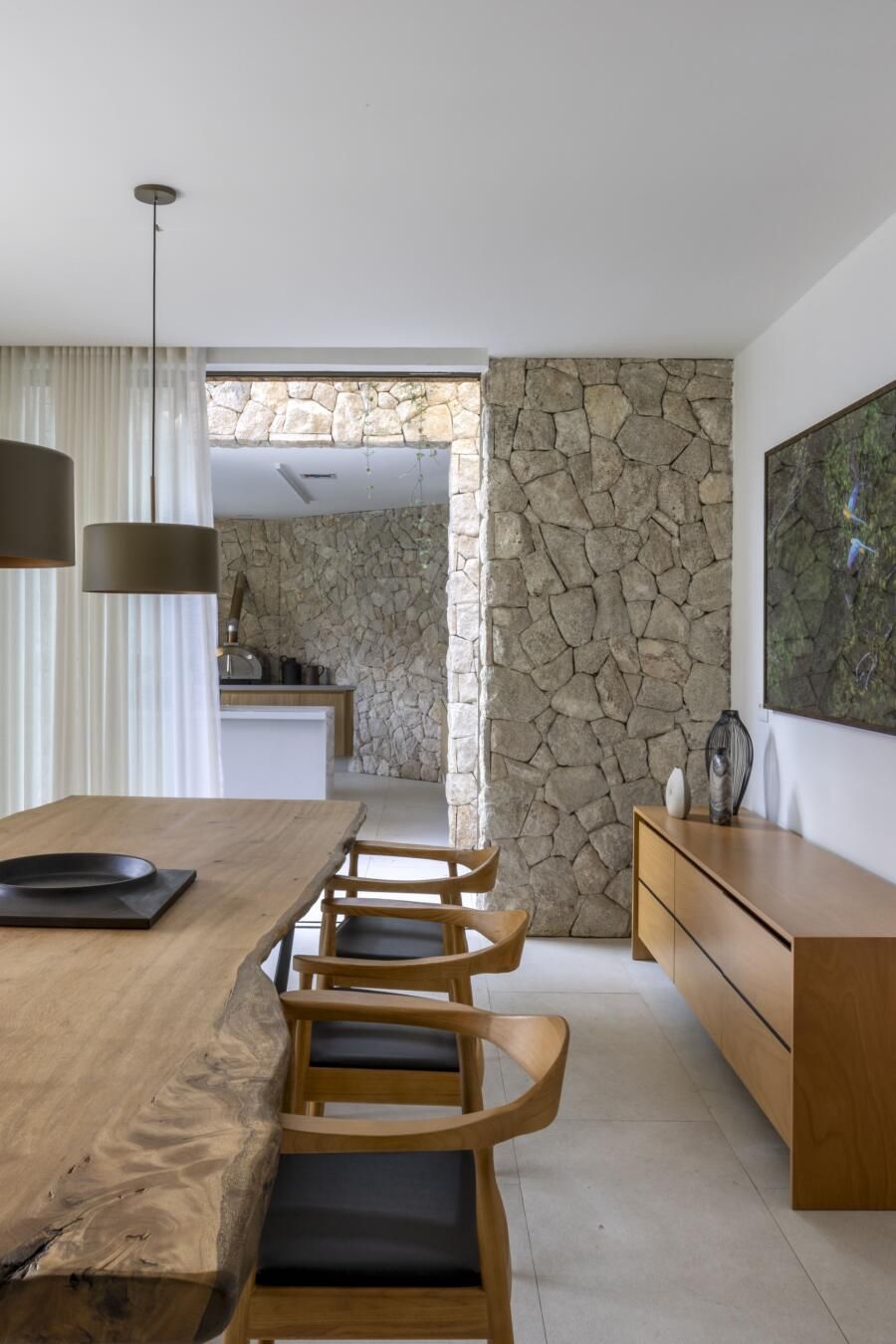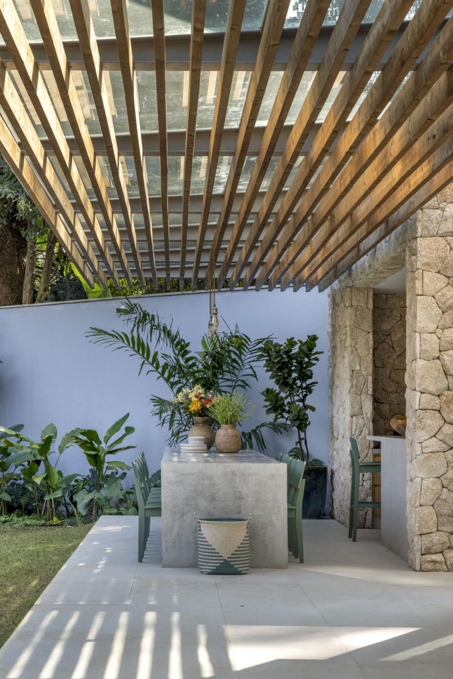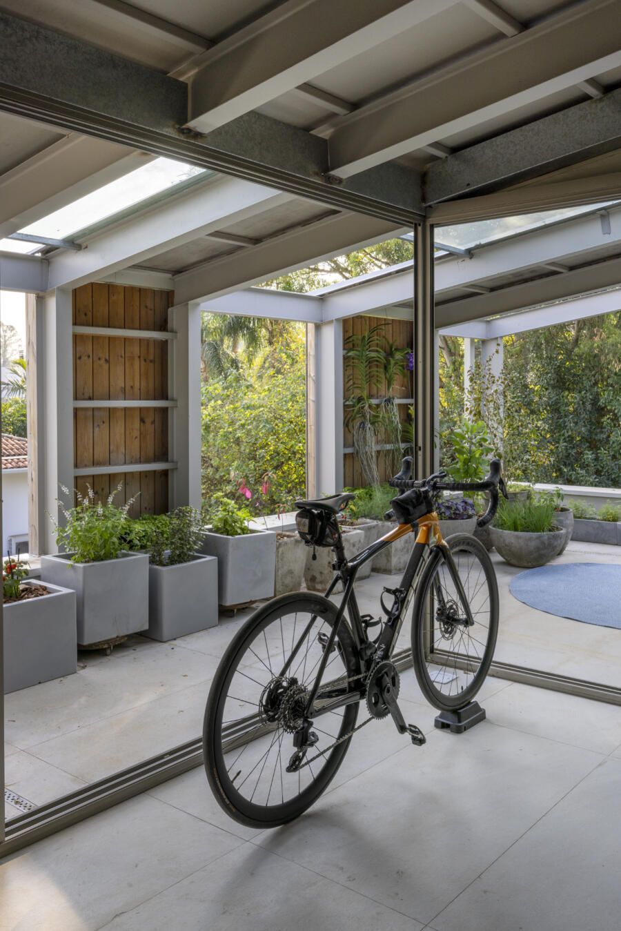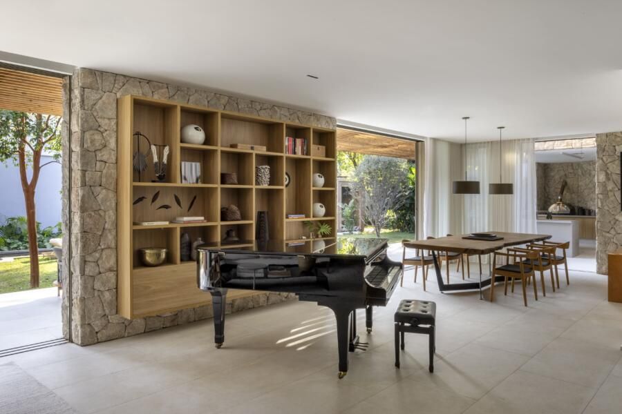 Outros pontos essenciais incluíram o uso de materiais duráveis e naturais, que envelhecessem bem e valorizassem a relação da casa com o entorno. A iluminação natural e a ventilação cruzada também foram prioridades, garantindo conforto térmico e eficiência ambiental. Todos os ambientes foram pensados para promover funcionalidade e acolher a prática de atividades físicas no dia a dia.