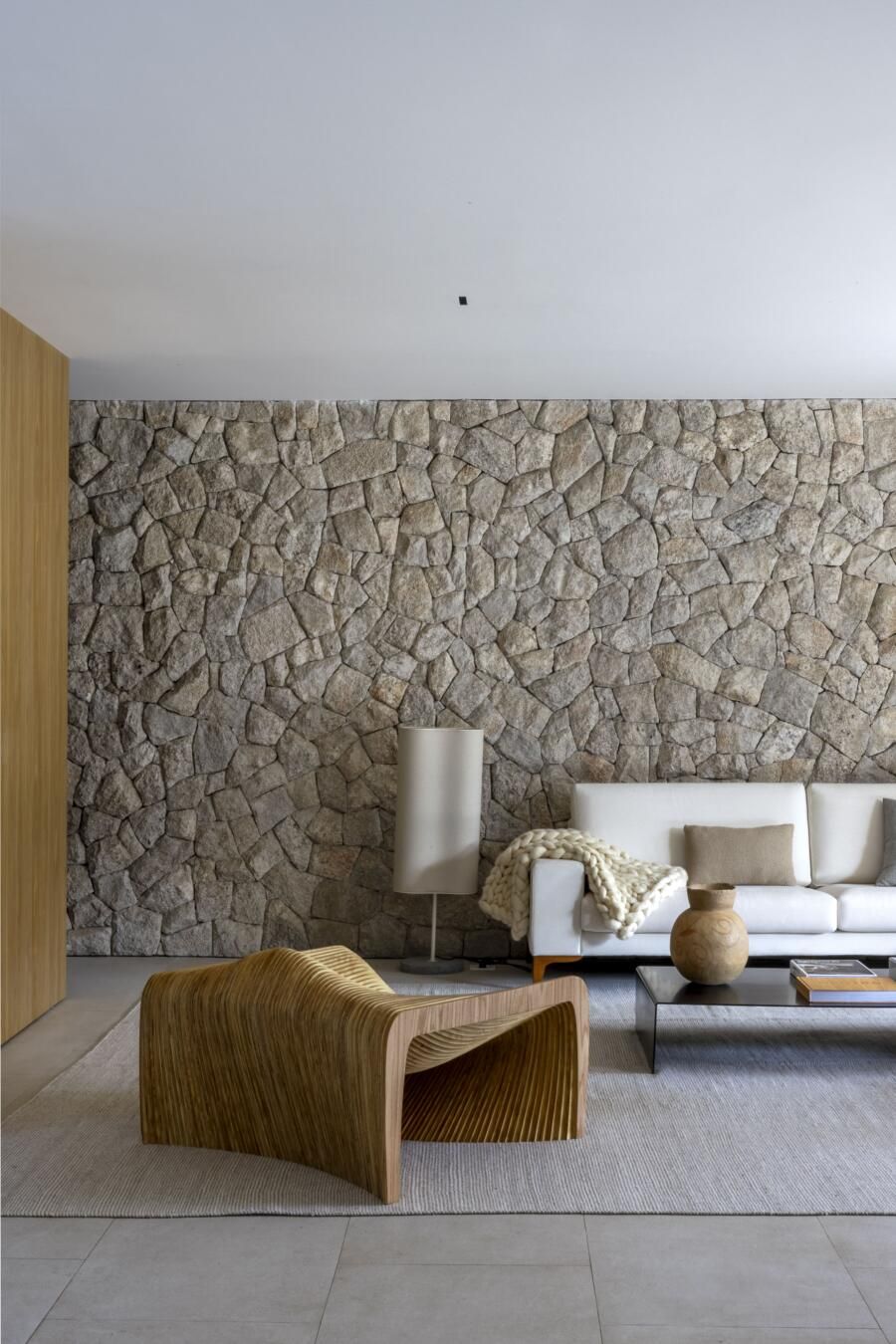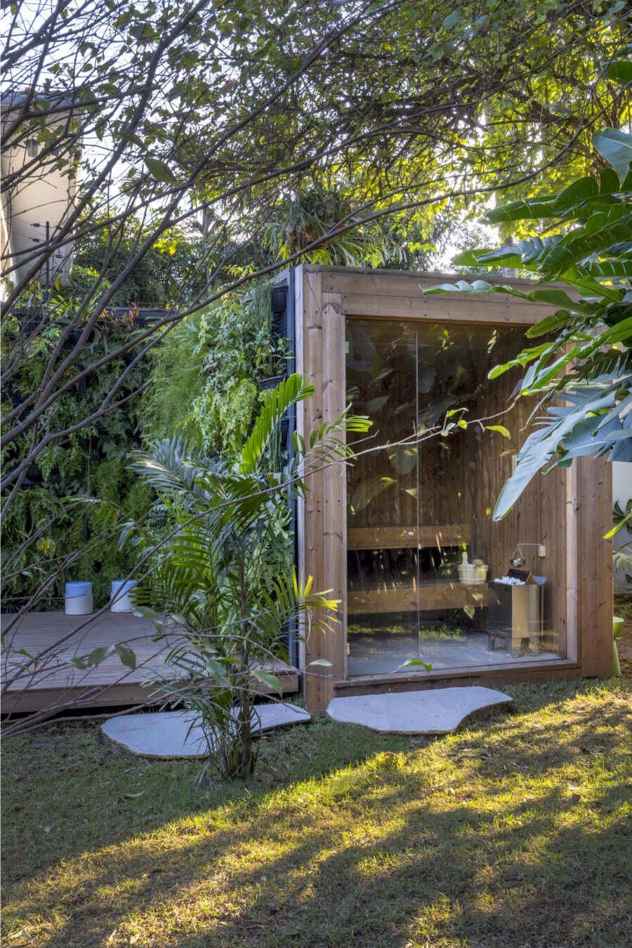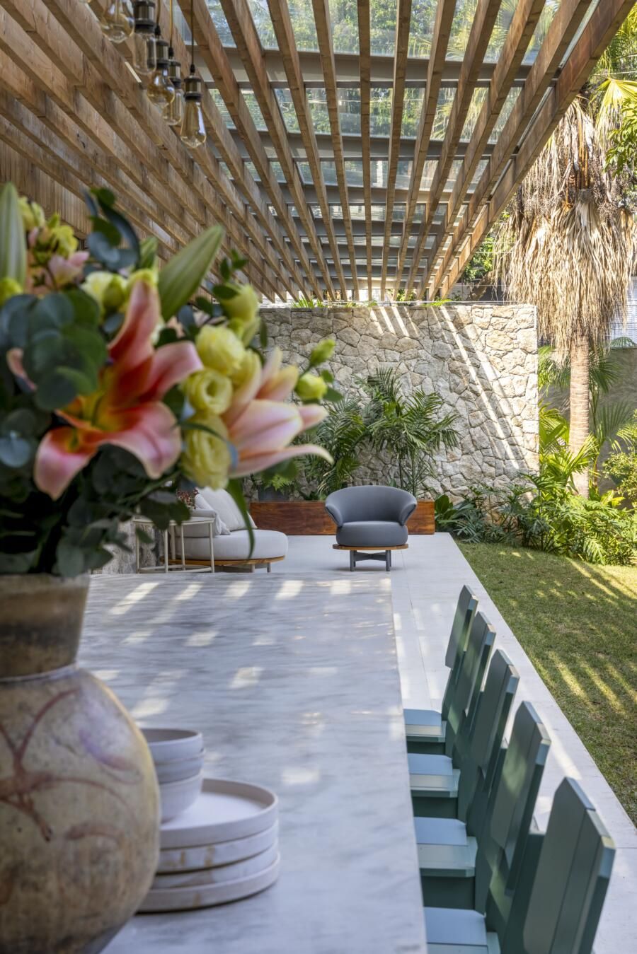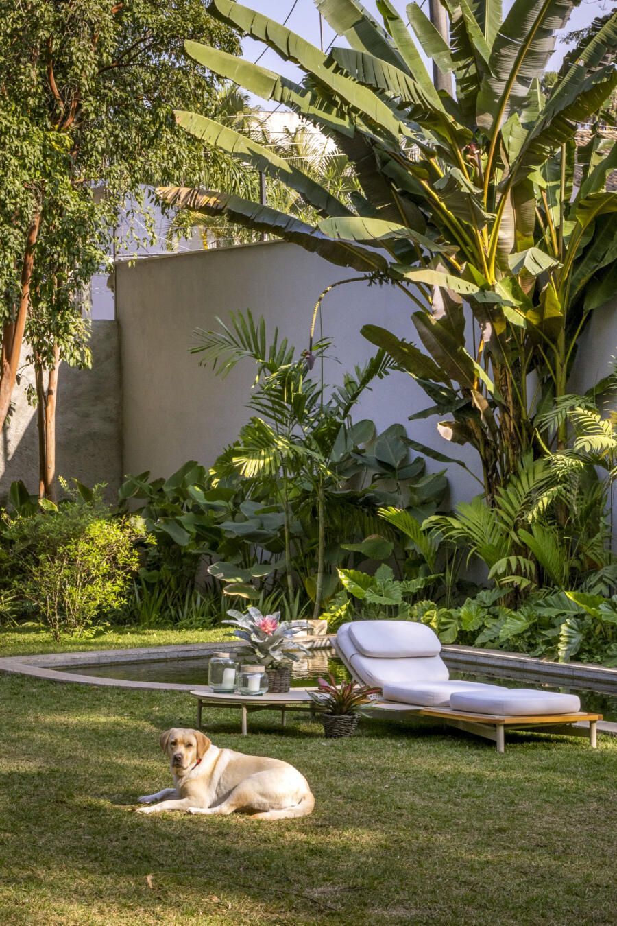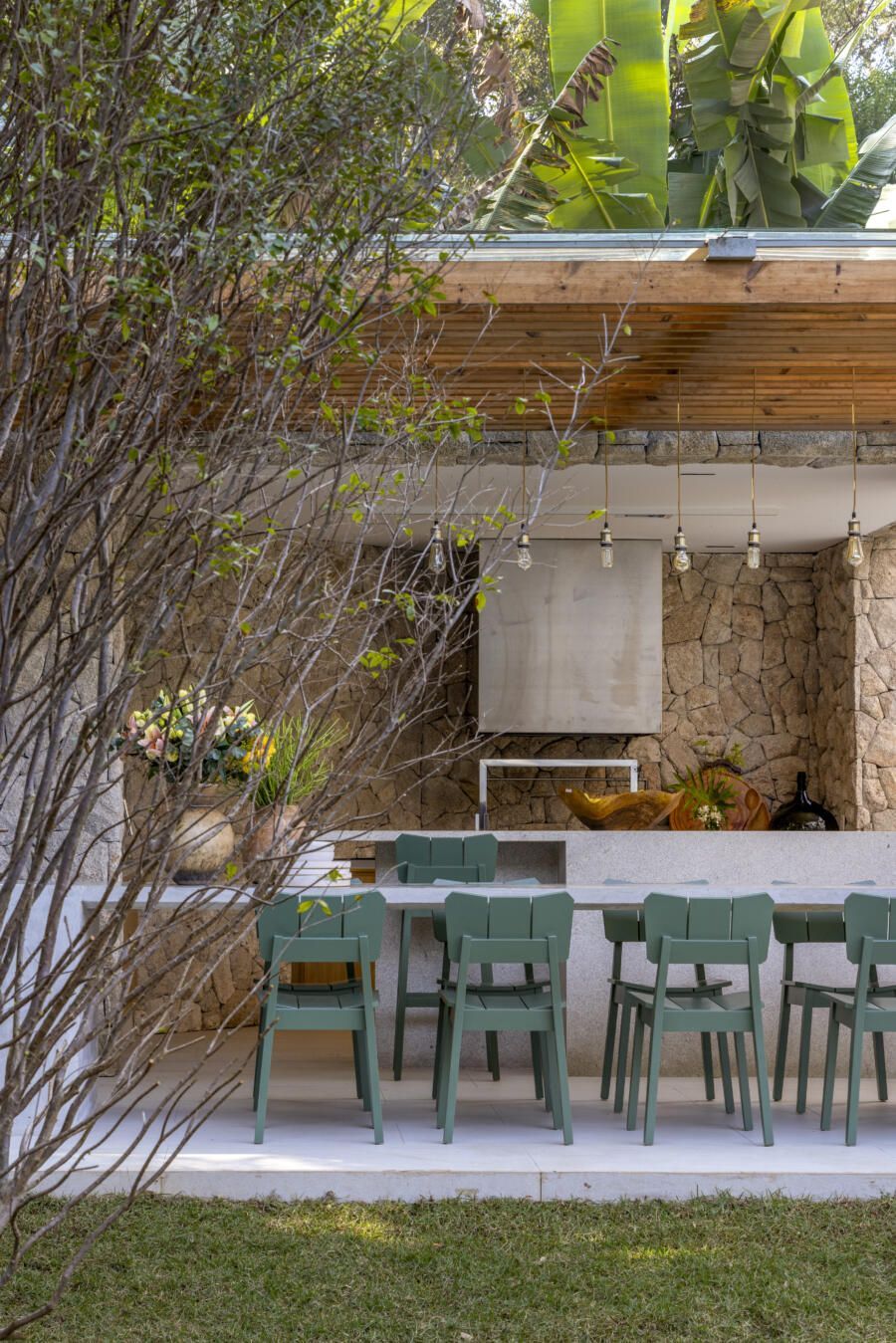 A implantação da casa no terreno foi um dos grandes desafios do projeto. Para preservar ao máximo a vegetação existente, a construção foi posicionada à direita do lote, liberando espaço para a criação de um grande jardim e da piscina com filtragem natural. Esse tipo de sistema exige equilíbrio entre plantas aquáticas e micro-organismos, demandando um cuidado técnico específico. A escolha dos acabamentos também foi criteriosa: o uso de ripas de madeira tratada com resistência ao tempo foi uma alternativa que uniu estética e durabilidade.