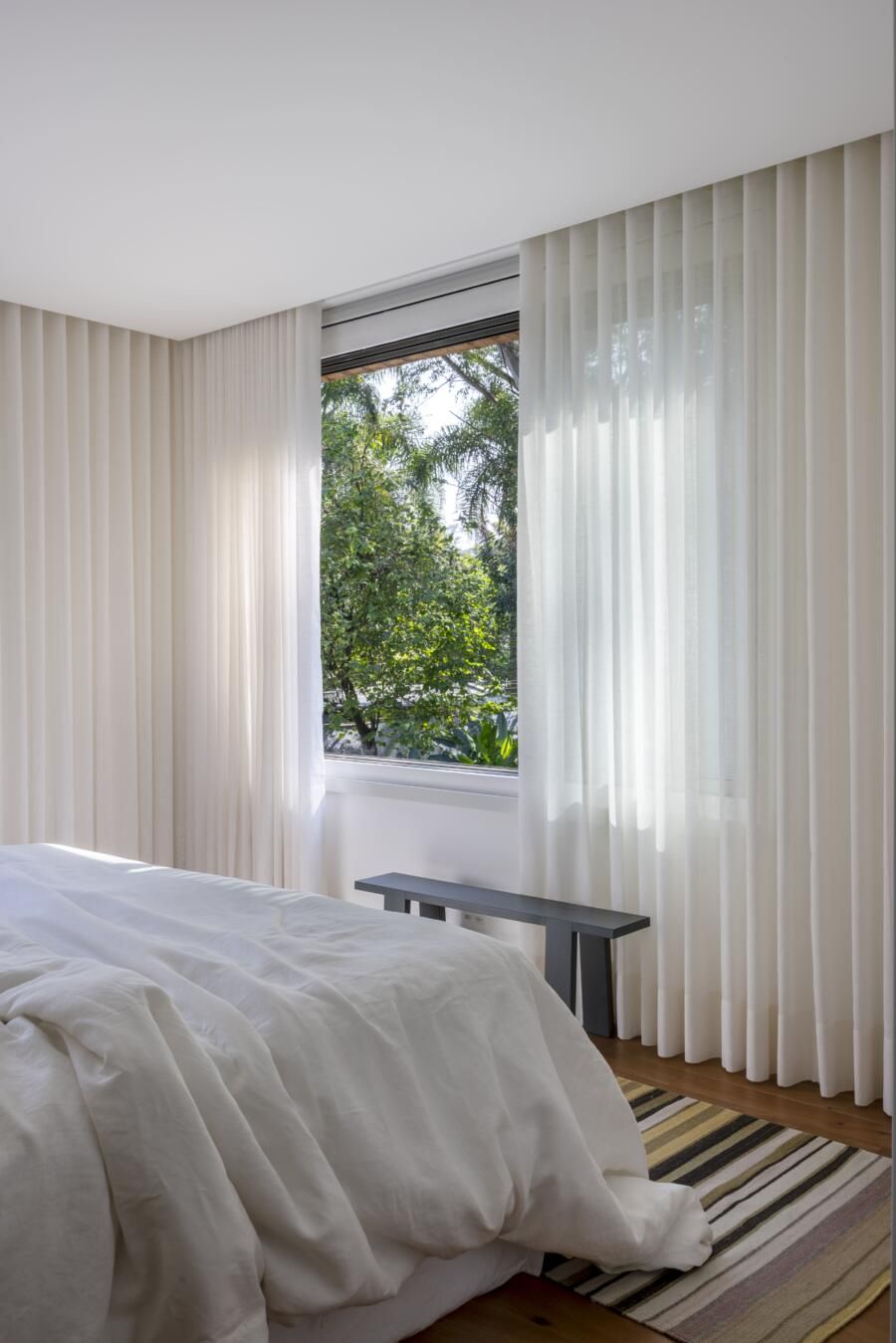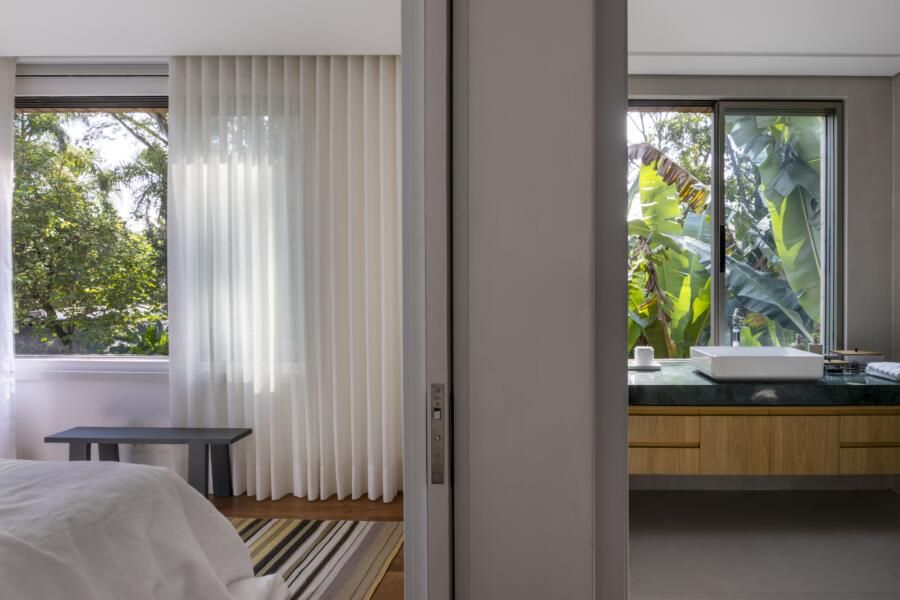 Outro ponto importante foi a harmonia entre a arquitetura contemporânea da casa e o contexto urbano do Parque Ibirapuera. O projeto buscou criar uma integração discreta com a paisagem, respeitando o entorno e contribuindo com uma leitura mais natural da cidade.