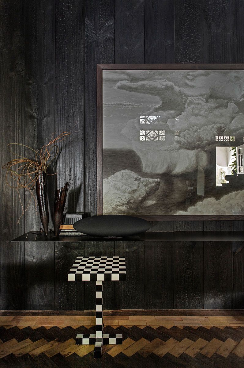 Fagá se apropriou de uma técnica oriental milenar, a Yakisugi que impermeabiliza o material, agrega um aspecto mineral e destaca características naturais através da queima das camadas superficiais da madeira para “tingir” os painéis gráficos que revestem as paredes.