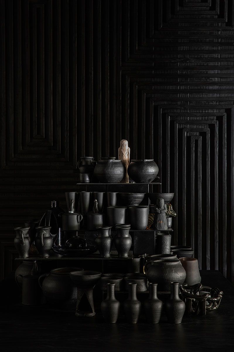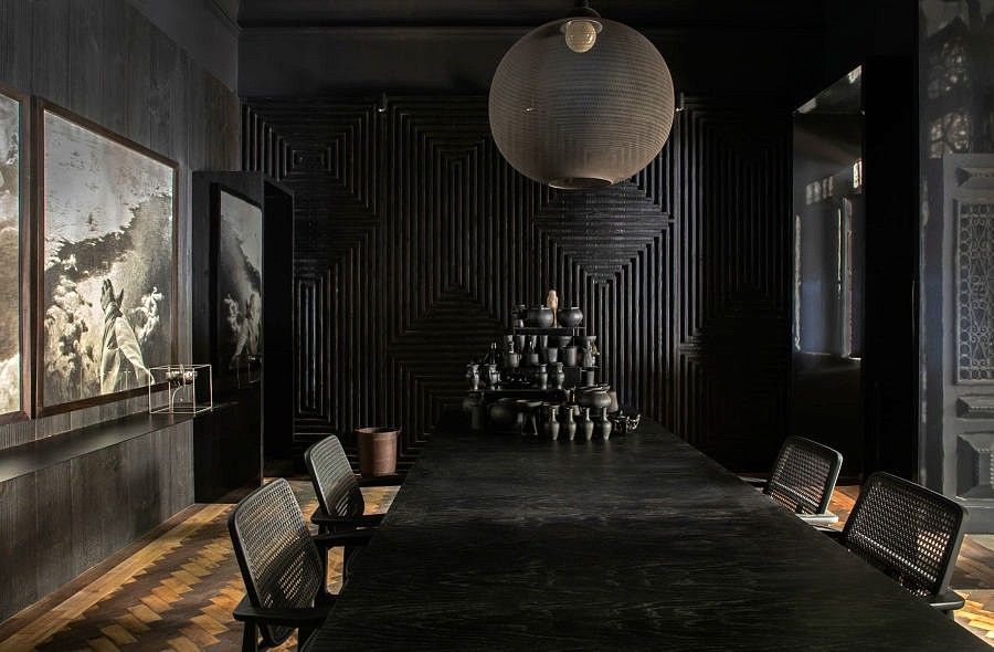 O projeto conta com objetos locais, artesanais e coleções “ordinárias” trazidas de viagens, agrupados sobre a mesa, sugerindo um mergulho nas memórias afetivas, na brasilidade e em épocas passadas, conectando o ambiente com a atmosfera densa, a história e ao uso original deste ambiente no casarão.