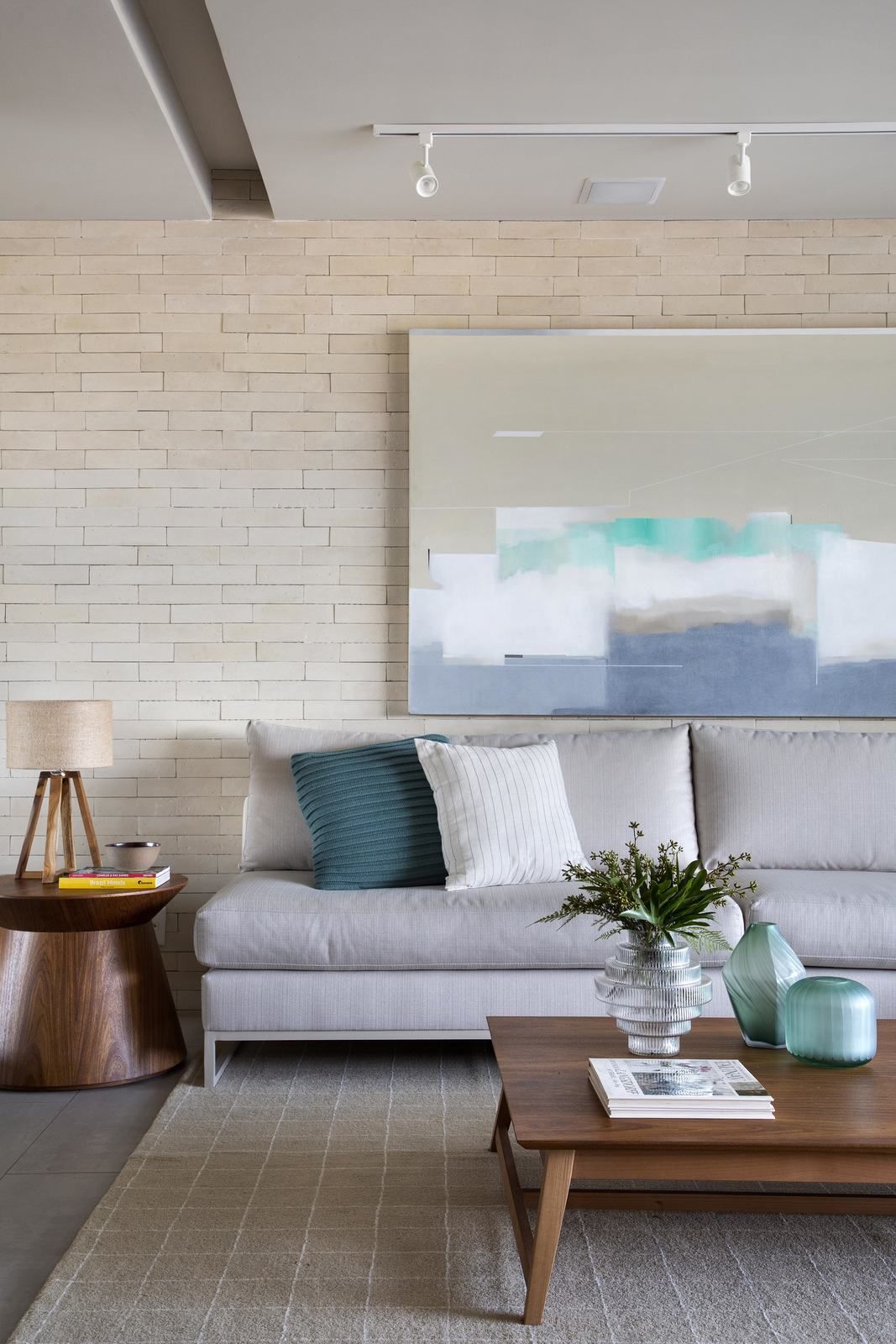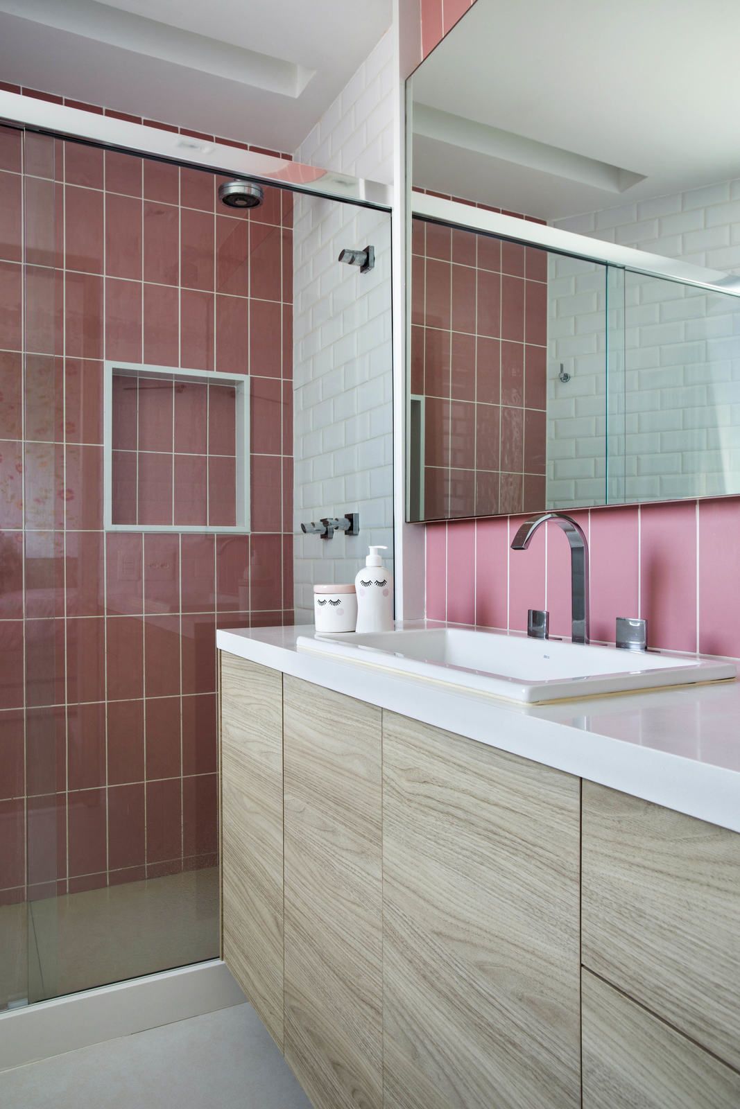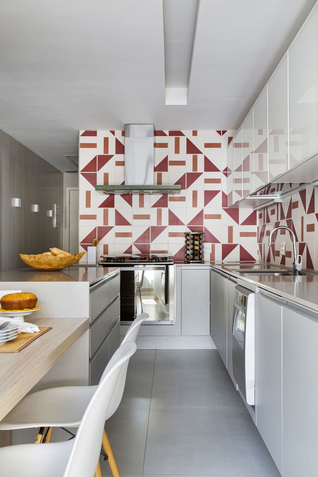 “O mix de texturas é o ponto alto, misturando elementos como o revestimento de tijolinhos, espelhos e o painel de madeira. A paleta de tons neutros como branco, cinza e bege é pontuada por objetos, quadros e almofadas coloridos, com especial destaque para as cores azul e verde. A marcenaria em tons neutros, em cinza e madeira, permitiu ousar ao eleger os azulejos. Nesse caso, foi escolhido um modelo geométrico, na cor vermelha, conforme solicitado pela cliente.”