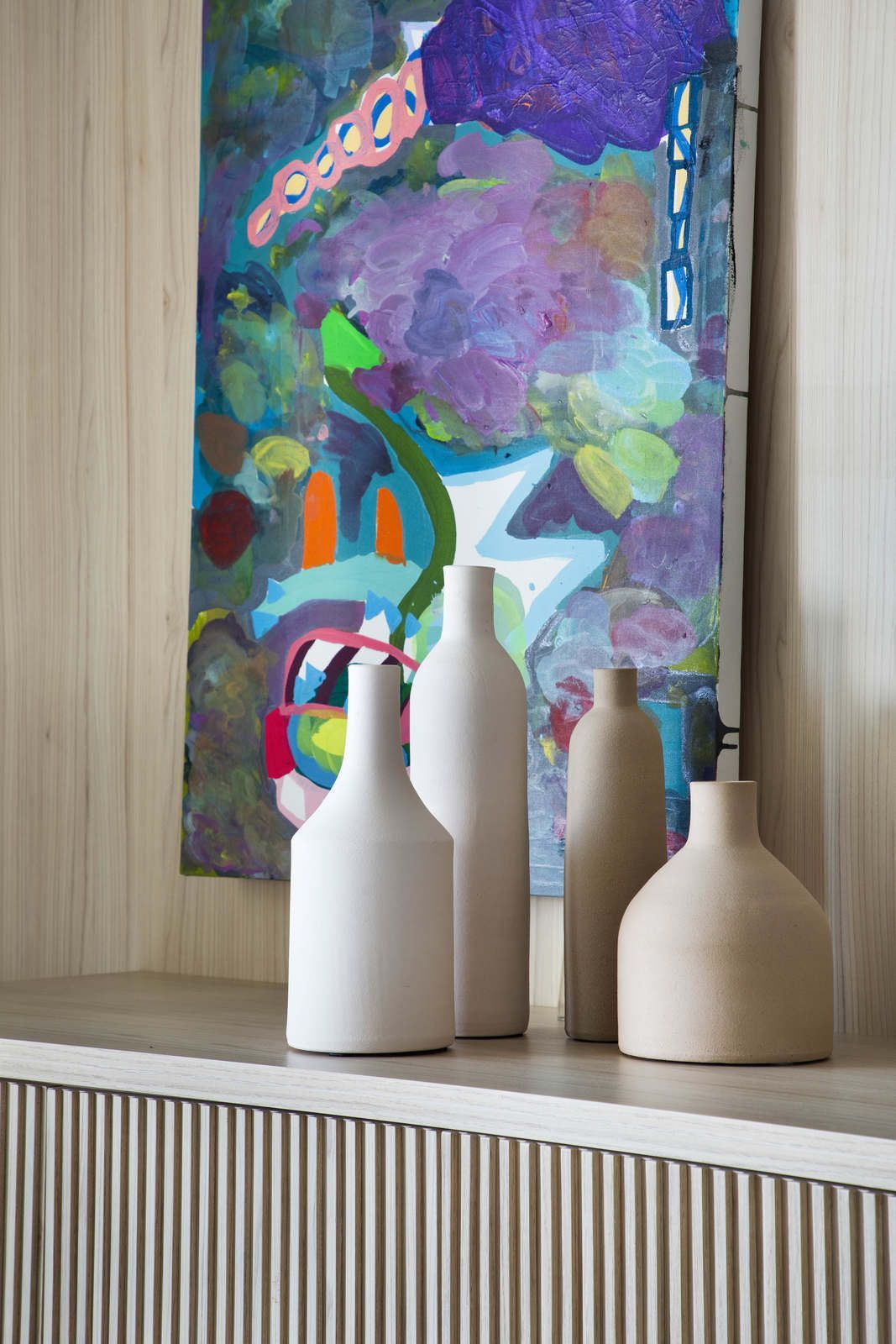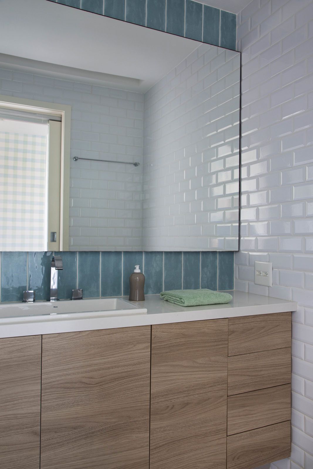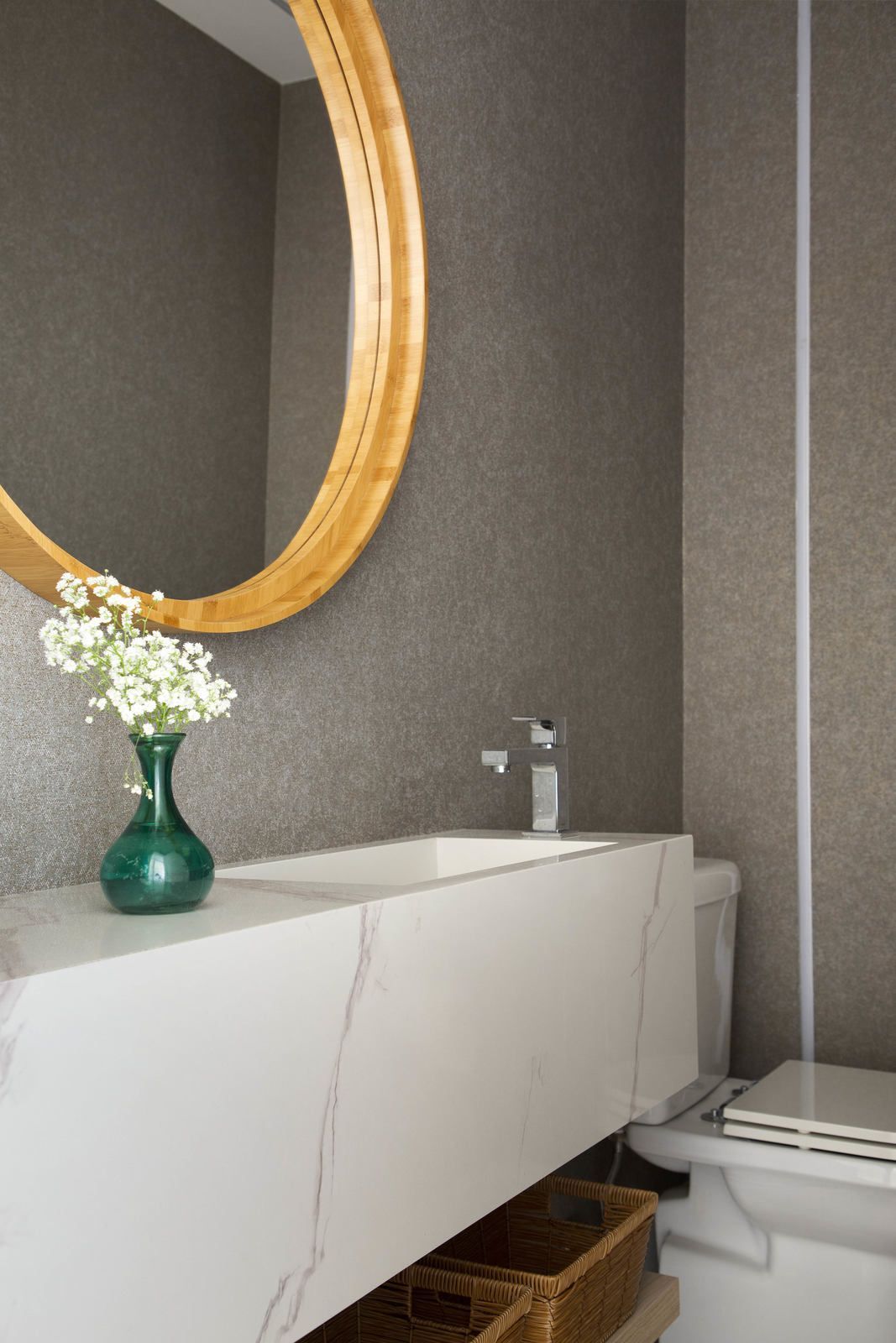 “O mix de texturas é o ponto alto, misturando elementos como o revestimento de tijolinhos, espelhos e o painel de madeira. A paleta de tons neutros como branco, cinza e bege é pontuada por objetos, quadros e almofadas coloridos, com especial destaque para as cores azul e verde. A marcenaria em tons neutros, em cinza e madeira, permitiu ousar ao eleger os azulejos. Nesse caso, foi escolhido um modelo geométrico, na cor vermelha, conforme solicitado pela cliente.”