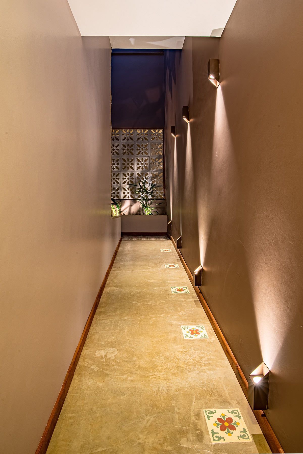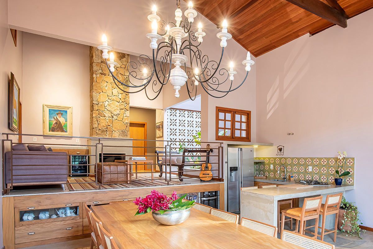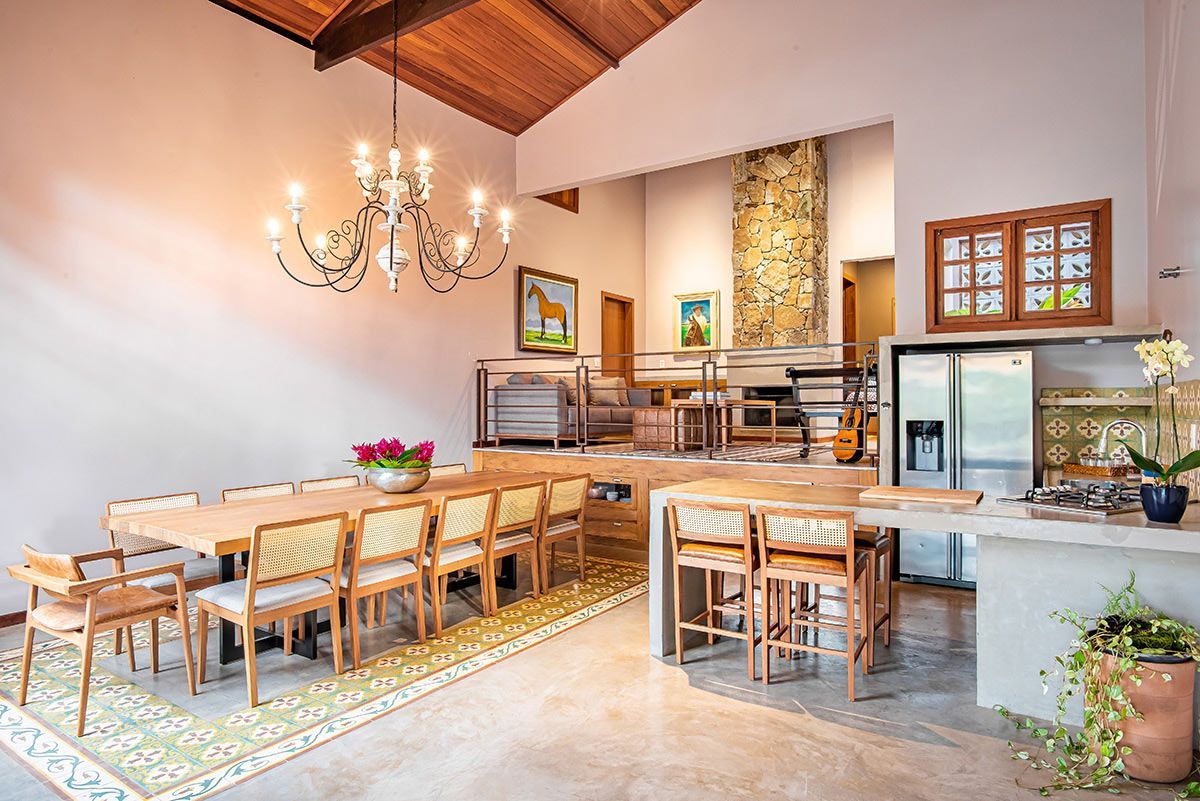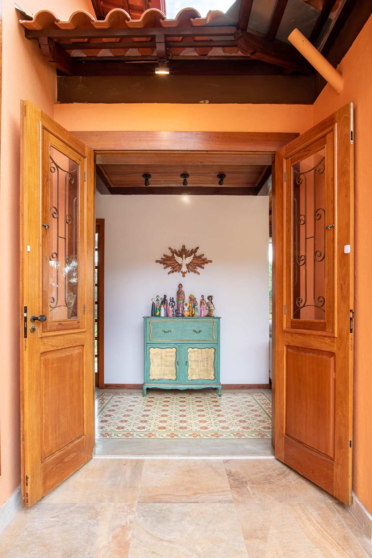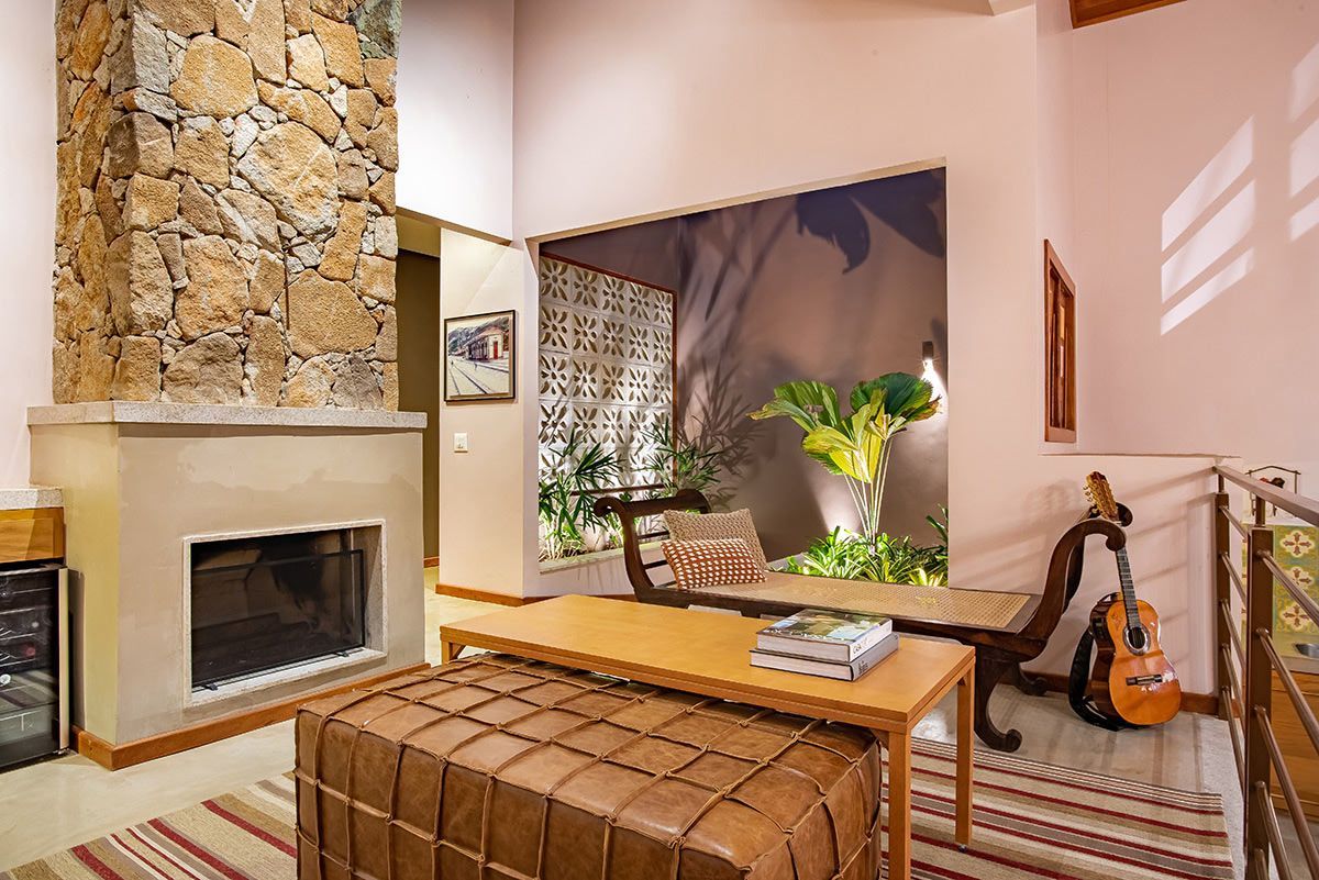 Entre a construção atual e a antiga, foi feita uma área de luz com rampa, para facilitar o acesso entre essas duas partes. Um dos maiores desafios foi equilibrar a decoração e os acabamentos, já que os proprietários eram bem apegados às memórias afetivas e aos ambientes originais, mas desejavam que o espaço fosse totalmente transformado. O resultado conta com cômodos rústicos e bem aconchegantes, para os clientes curtirem ainda mais a fazenda.