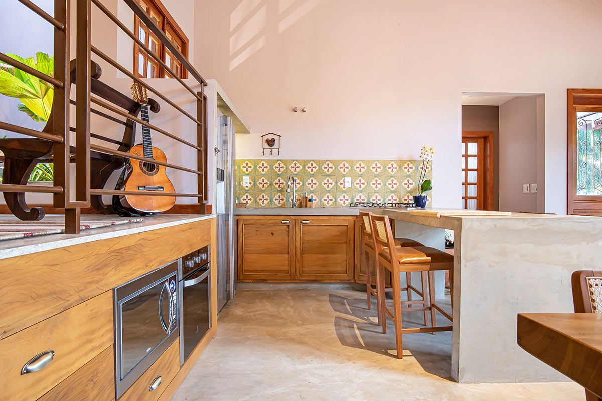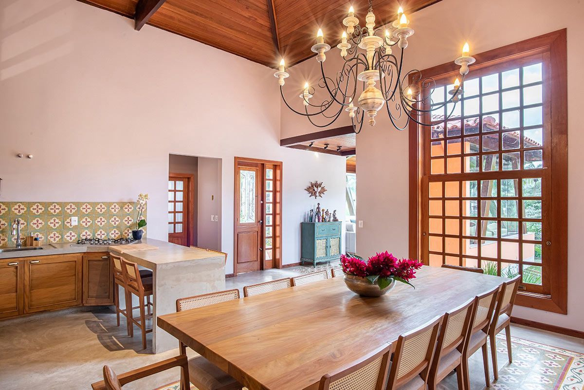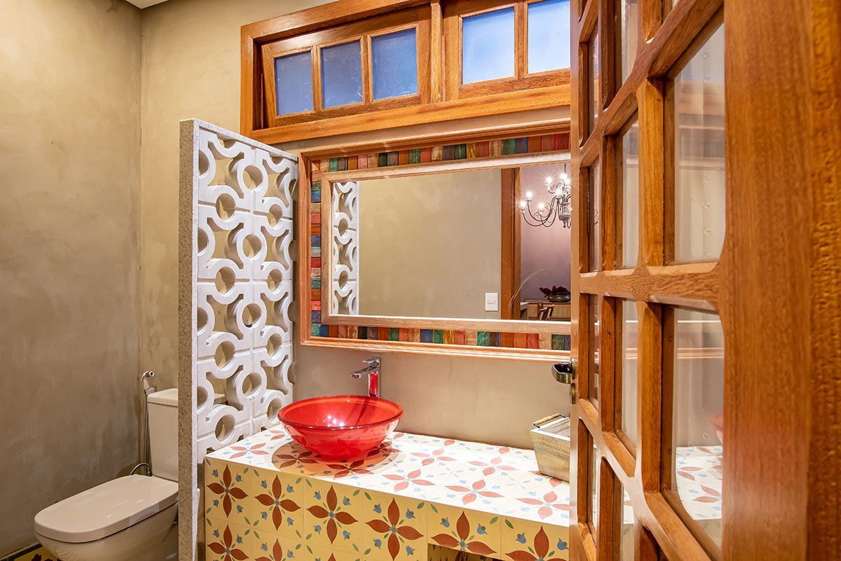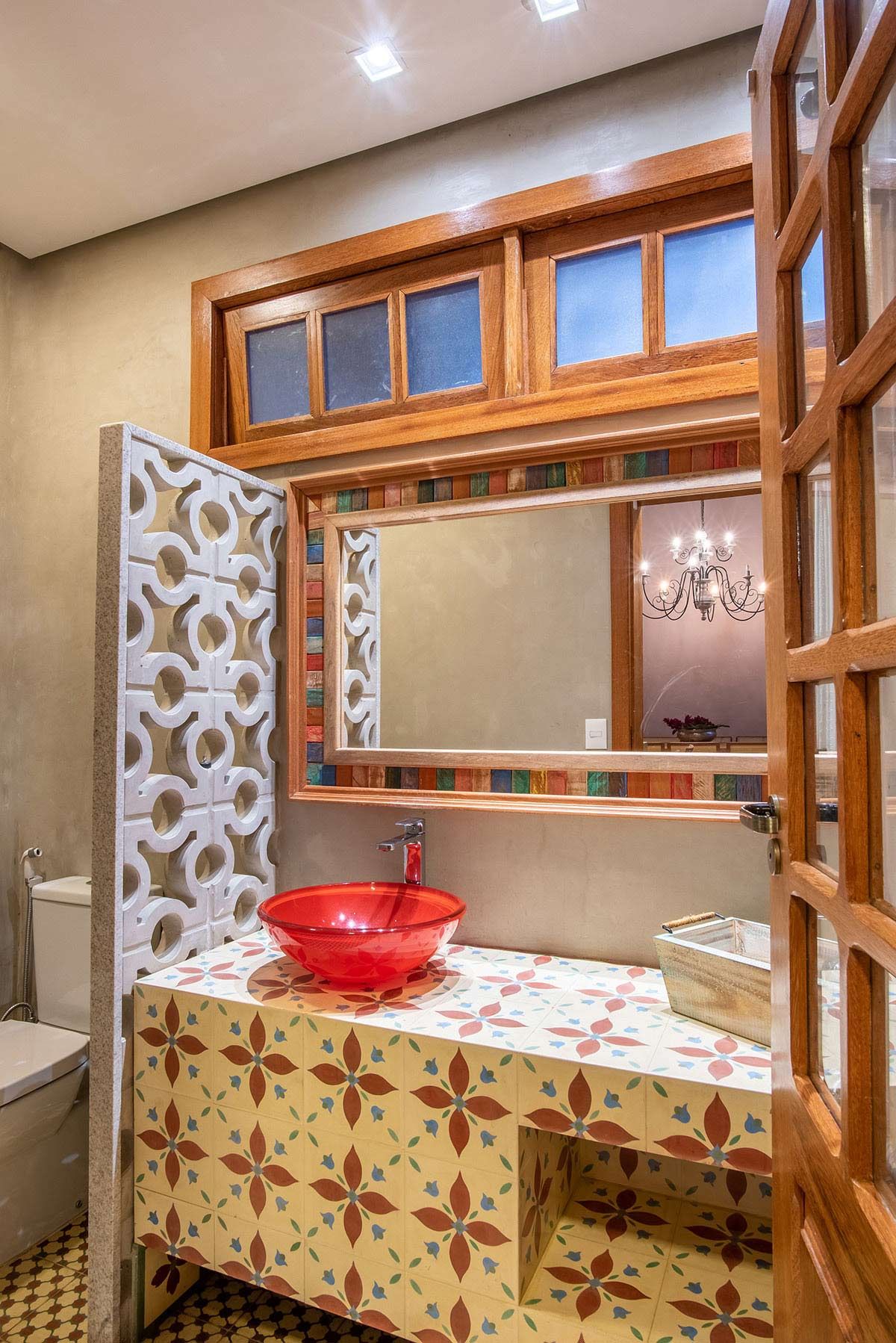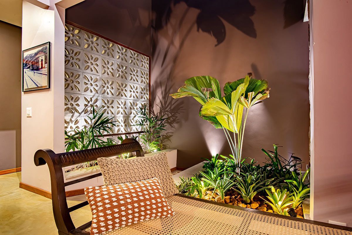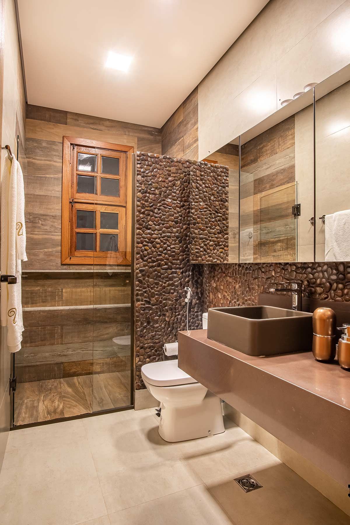 Entre a construção atual e a antiga, foi feita uma área de luz com rampa, para facilitar o acesso entre essas duas partes. Um dos maiores desafios foi equilibrar a decoração e os acabamentos, já que os proprietários eram bem apegados às memórias afetivas e aos ambientes originais, mas desejavam que o espaço fosse totalmente transformado. O resultado conta com cômodos rústicos e bem aconchegantes, para os clientes curtirem ainda mais a fazenda.