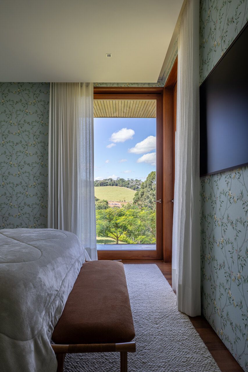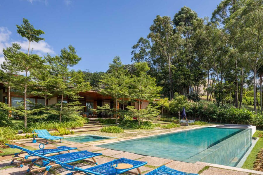 Organizada em blocos interligados por galerias envidraçadas, a casa valoriza a presença constante do verde e cria uma relação direta entre os ambientes internos e o jardim. A implantação estratégica no terreno em declive também potencializa a integração: no nível superior, concentram-se as áreas sociais, a piscina e as suítes da família, em diálogo aberto com a vista. Já o pavimento inferior, parcialmente embutido, abriga os espaços de lazer e bem-estar, como spa, academia, quartos de hóspedes e uma sala de cinema equipada para sessões imersivas.