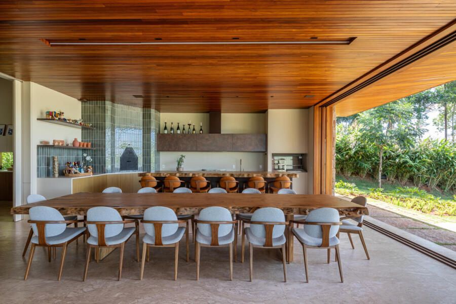 “Além da estética e do conforto, o projeto se destaca pela forma como acolhe diferentes formas de uso. A casa pode ser vivida apenas pelo casal, de forma íntima e tranquila, ou receber com conforto e generosidade familiares e amigos em grande número.”