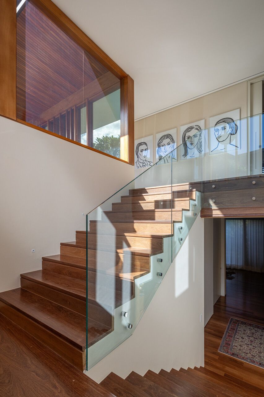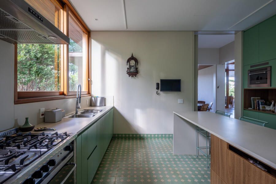 A clareza do projeto se reflete na divisão funcional, que distingue as zonas íntima, social e de serviço, mantendo percursos fluidos e iluminados naturalmente. O paisagismo de Alex Hanazaki emoldura a arquitetura com sutileza, proporcionando sombra, conforto visual e privacidade, enquanto as galerias de vidro funcionam como costura arquitetônica que convida o jardim a participar do dia a dia da casa.