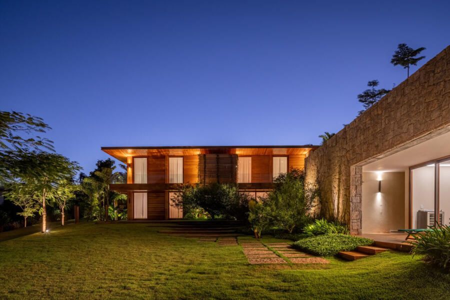 Materiais como pedra, madeira, cerâmica e tons terrosos reforçam a linguagem da casa brasileira contemporânea. Mesmo os sistemas construtivos modernos, como a cobertura Alwitra e os caixilhos de alumínio, foram especificados em acabamentos opacos e naturais para manter a harmonia visual. O projeto luminotécnico de Marcos Castilha valoriza as texturas e cria atmosfera acolhedora, enquanto a marcenaria traz sofisticação e funcionalidade aos interiores.