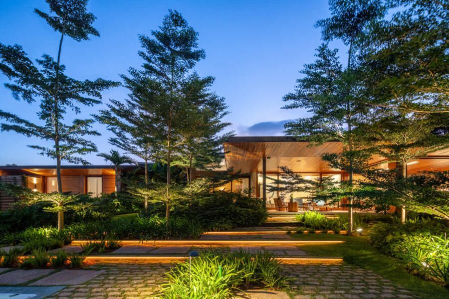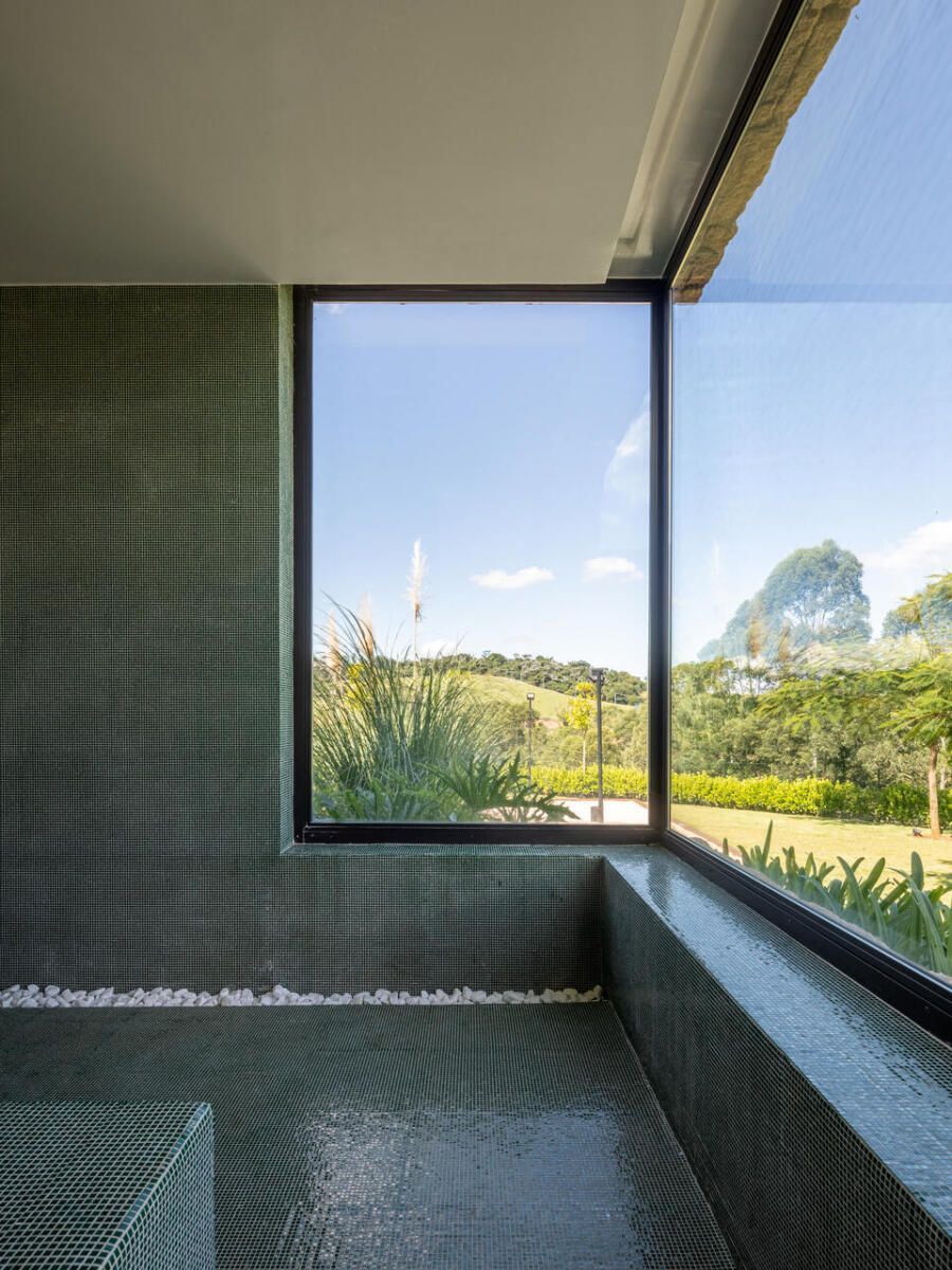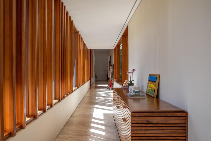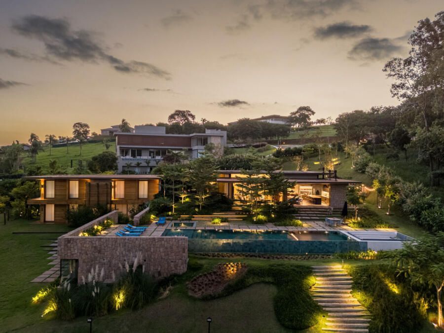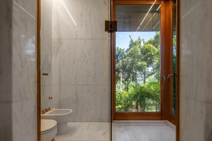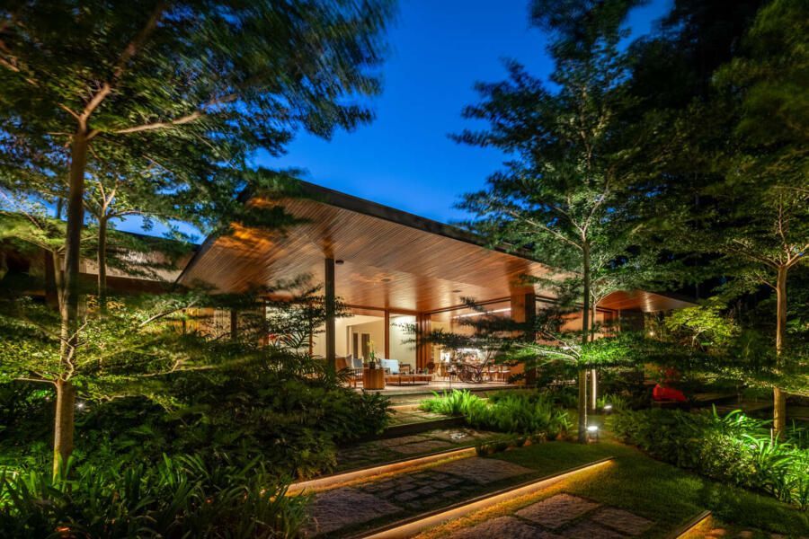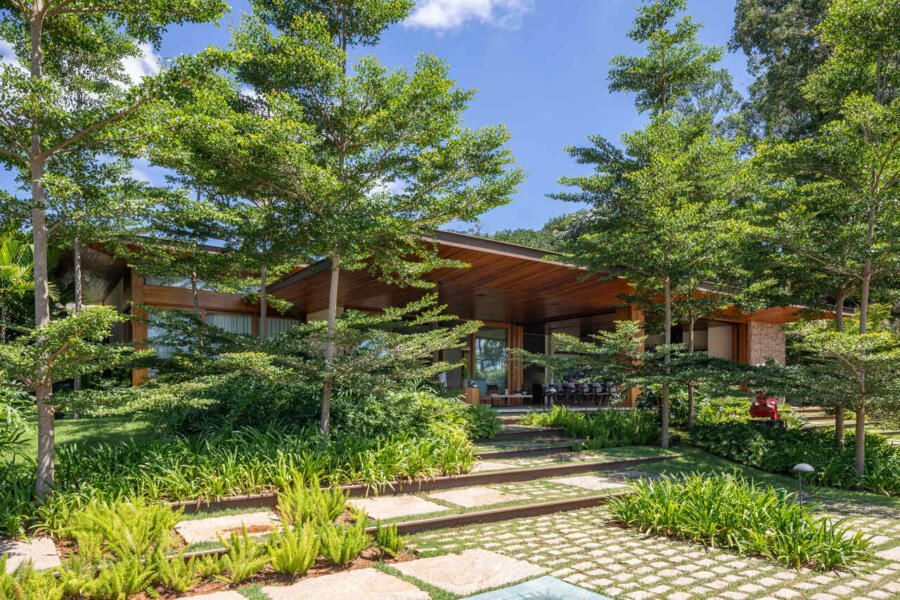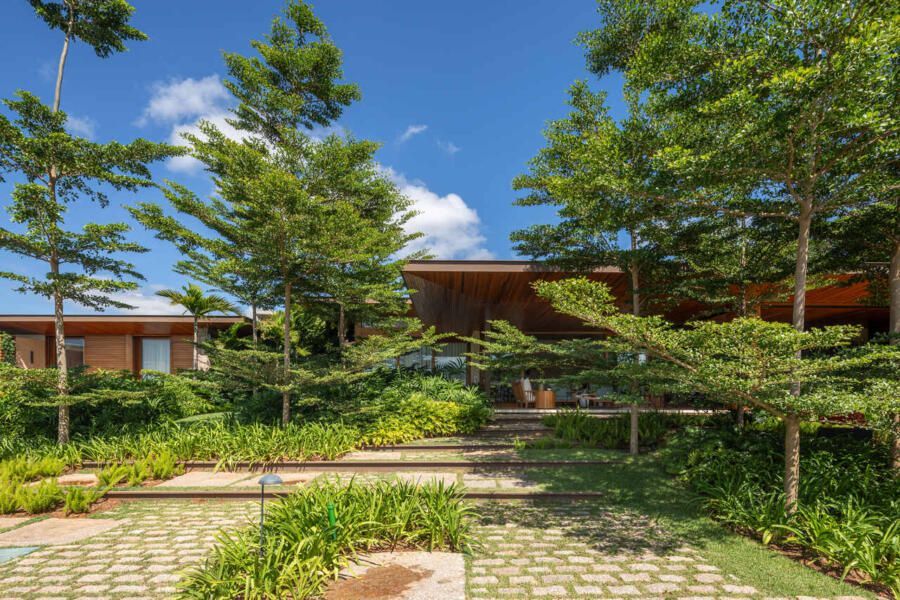 Organizada em blocos interligados por galerias envidraçadas, a casa valoriza a presença constante do verde e cria uma relação direta entre os ambientes internos e o jardim. A implantação estratégica no terreno em declive também potencializa a integração: no nível superior, concentram-se as áreas sociais, a piscina e as suítes da família, em diálogo aberto com a vista. Já o pavimento inferior, parcialmente embutido, abriga os espaços de lazer e bem-estar, como spa, academia, quartos de hóspedes e uma sala de cinema equipada para sessões imersivas.
