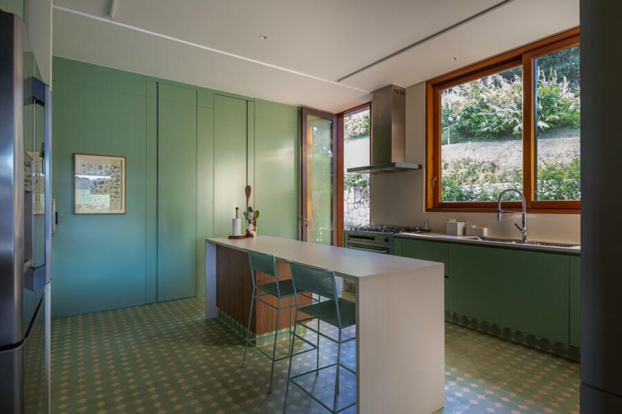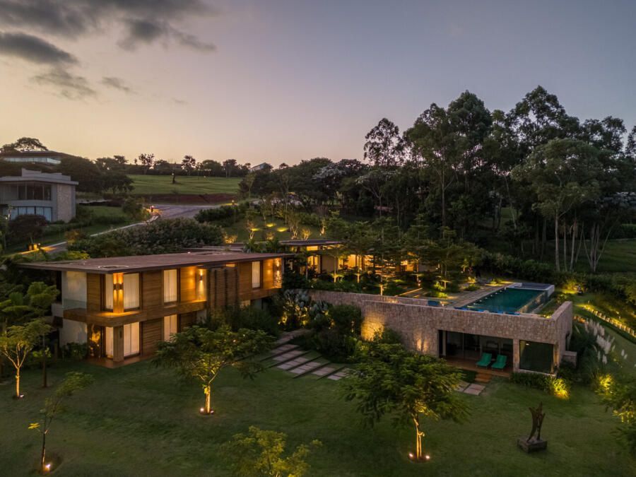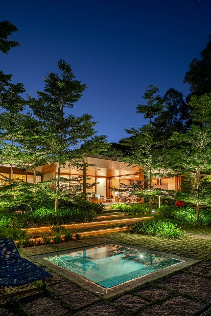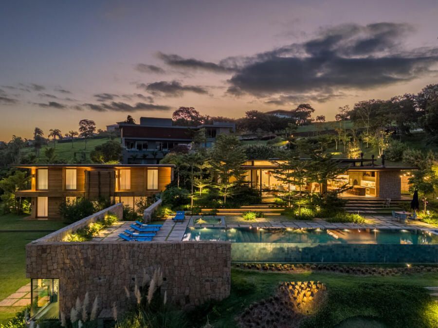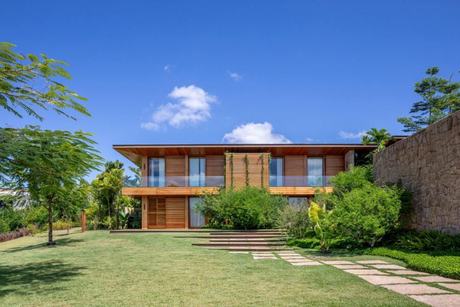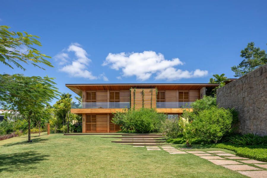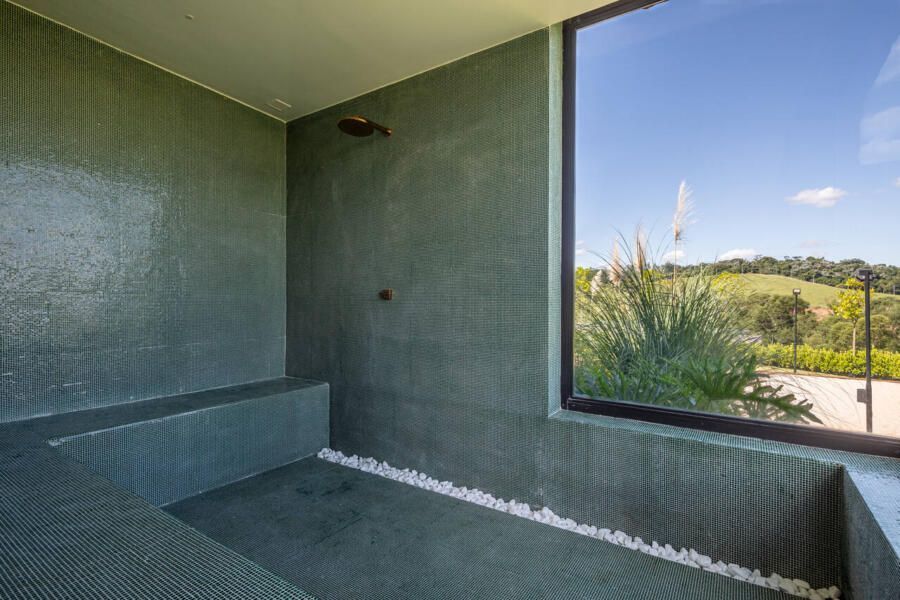 Organizada em blocos interligados por galerias envidraçadas, a casa valoriza a presença constante do verde e cria uma relação direta entre os ambientes internos e o jardim. A implantação estratégica no terreno em declive também potencializa a integração: no nível superior, concentram-se as áreas sociais, a piscina e as suítes da família, em diálogo aberto com a vista. Já o pavimento inferior, parcialmente embutido, abriga os espaços de lazer e bem-estar, como spa, academia, quartos de hóspedes e uma sala de cinema equipada para sessões imersivas.
