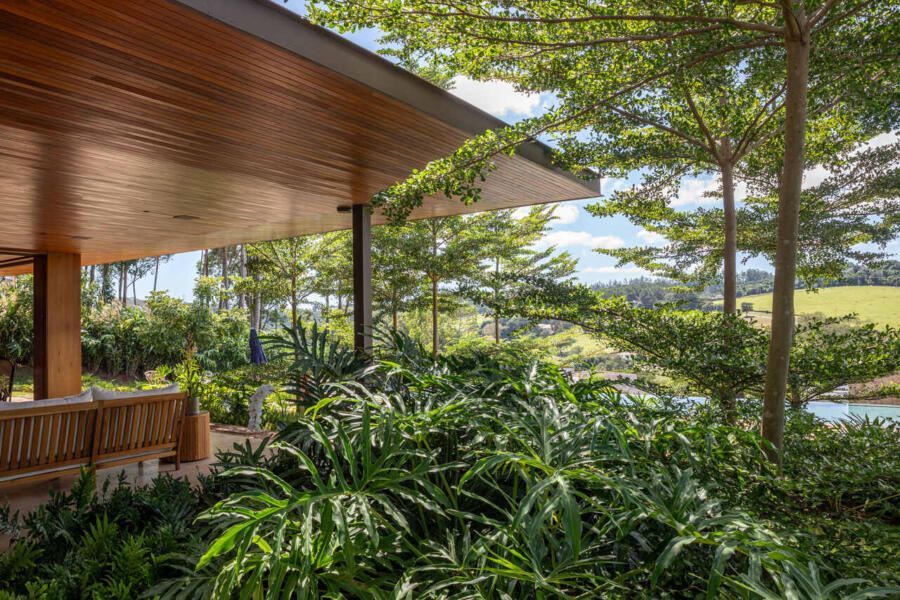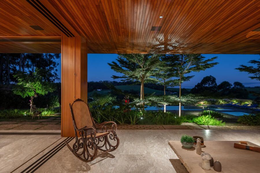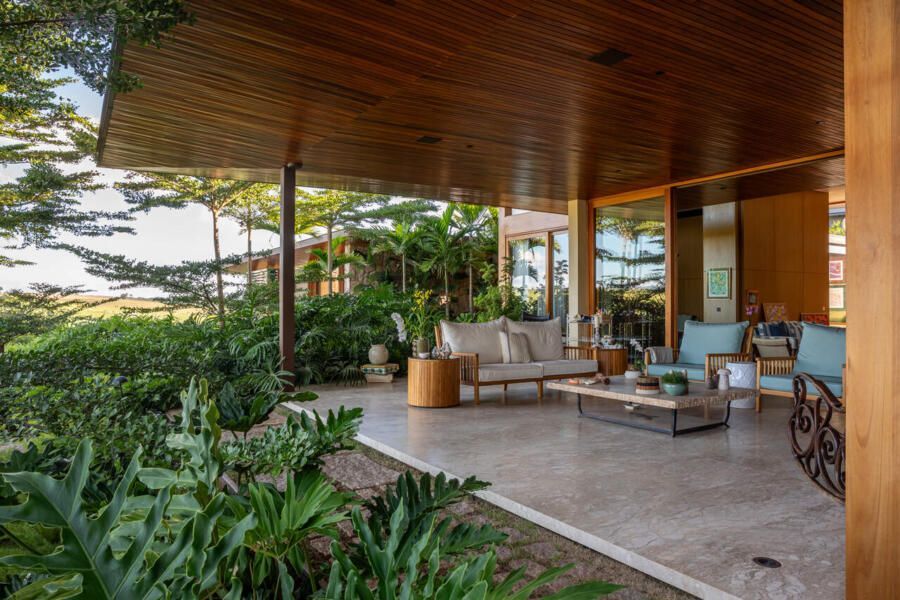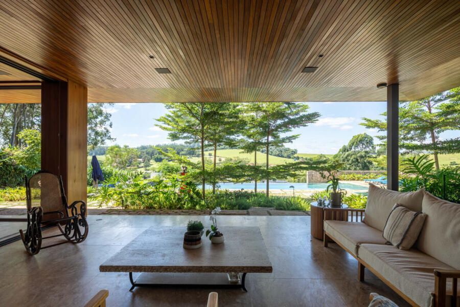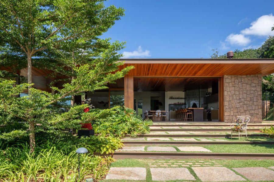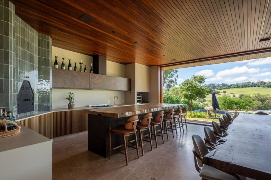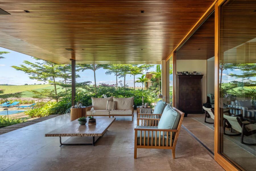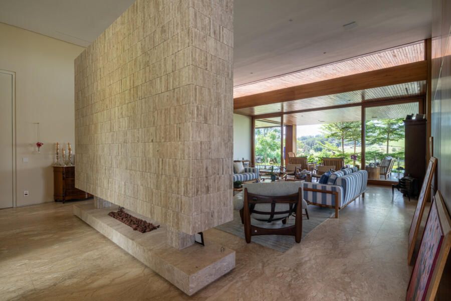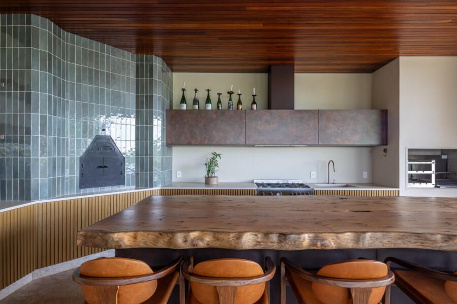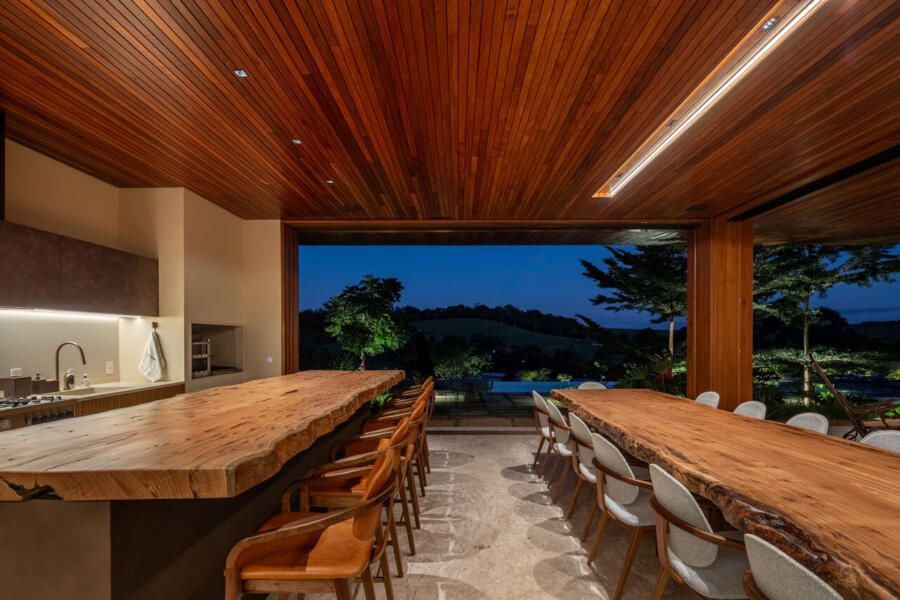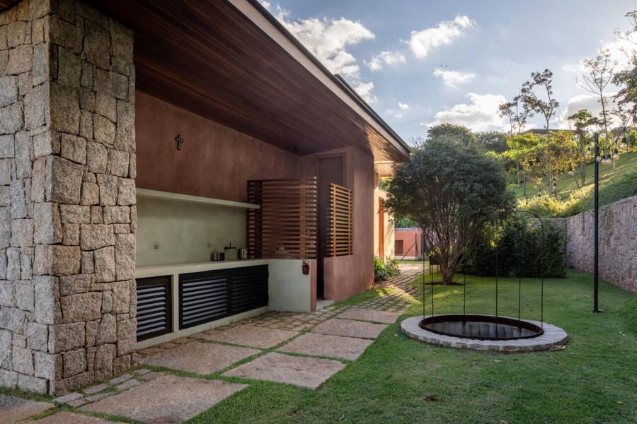 Materiais como pedra, madeira, cerâmica e tons terrosos reforçam a linguagem da casa brasileira contemporânea. Mesmo os sistemas construtivos modernos, como a cobertura Alwitra e os caixilhos de alumínio, foram especificados em acabamentos opacos e naturais para manter a harmonia visual. O projeto luminotécnico de Marcos Castilha valoriza as texturas e cria atmosfera acolhedora, enquanto a marcenaria traz sofisticação e funcionalidade aos interiores.