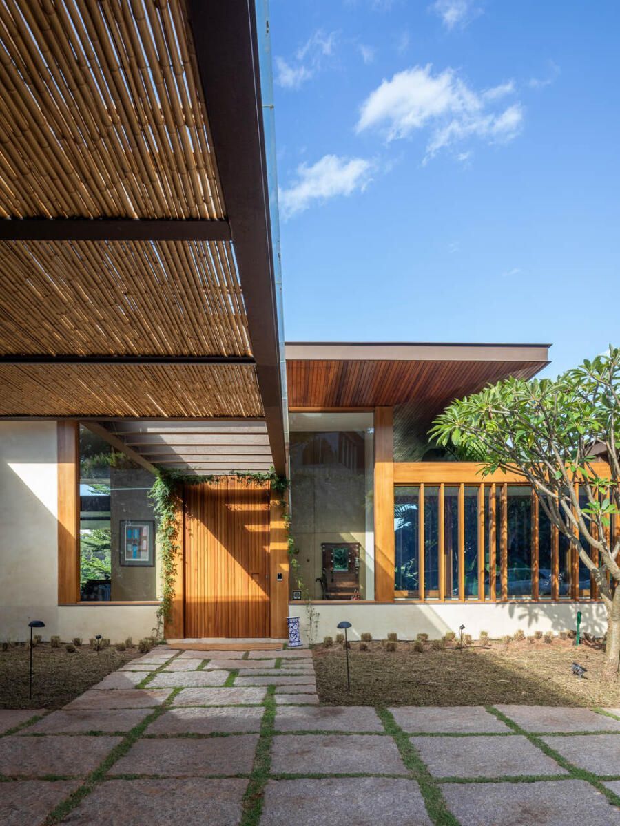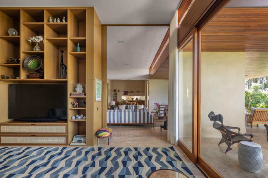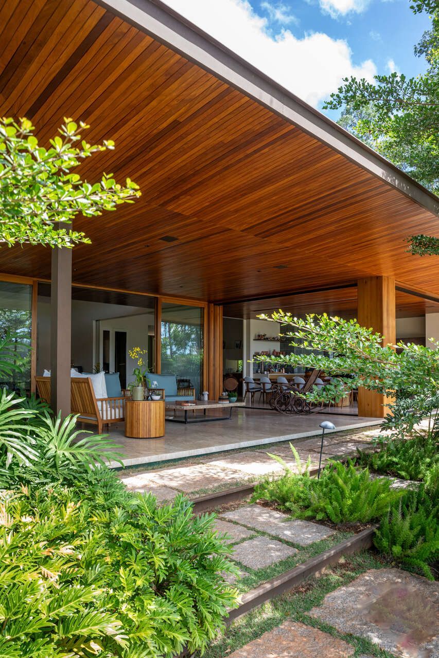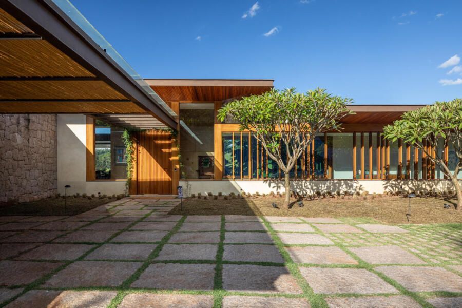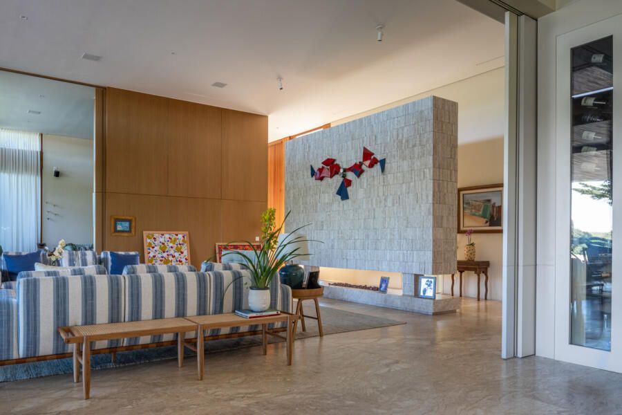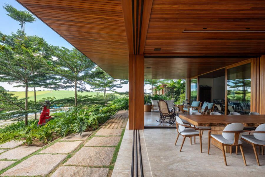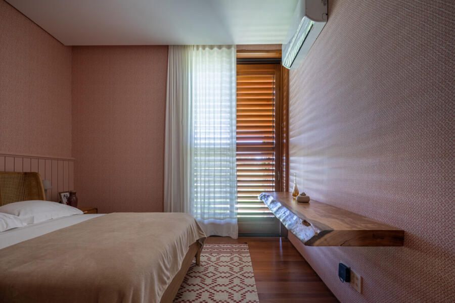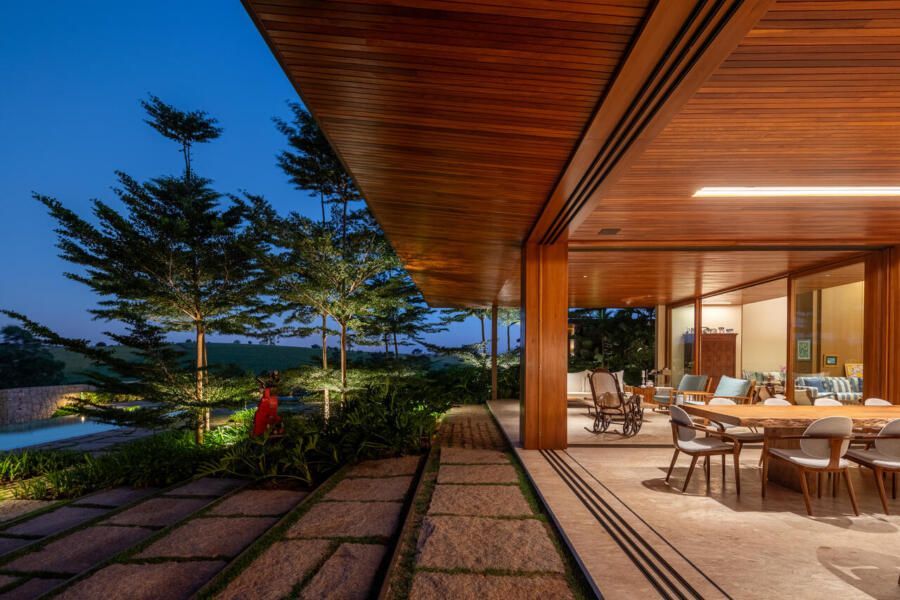 Materiais como pedra, madeira, cerâmica e tons terrosos reforçam a linguagem da casa brasileira contemporânea. Mesmo os sistemas construtivos modernos, como a cobertura Alwitra e os caixilhos de alumínio, foram especificados em acabamentos opacos e naturais para manter a harmonia visual. O projeto luminotécnico de Marcos Castilha valoriza as texturas e cria atmosfera acolhedora, enquanto a marcenaria traz sofisticação e funcionalidade aos interiores.