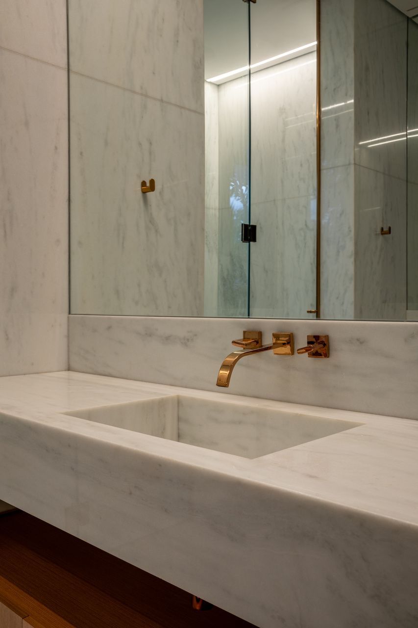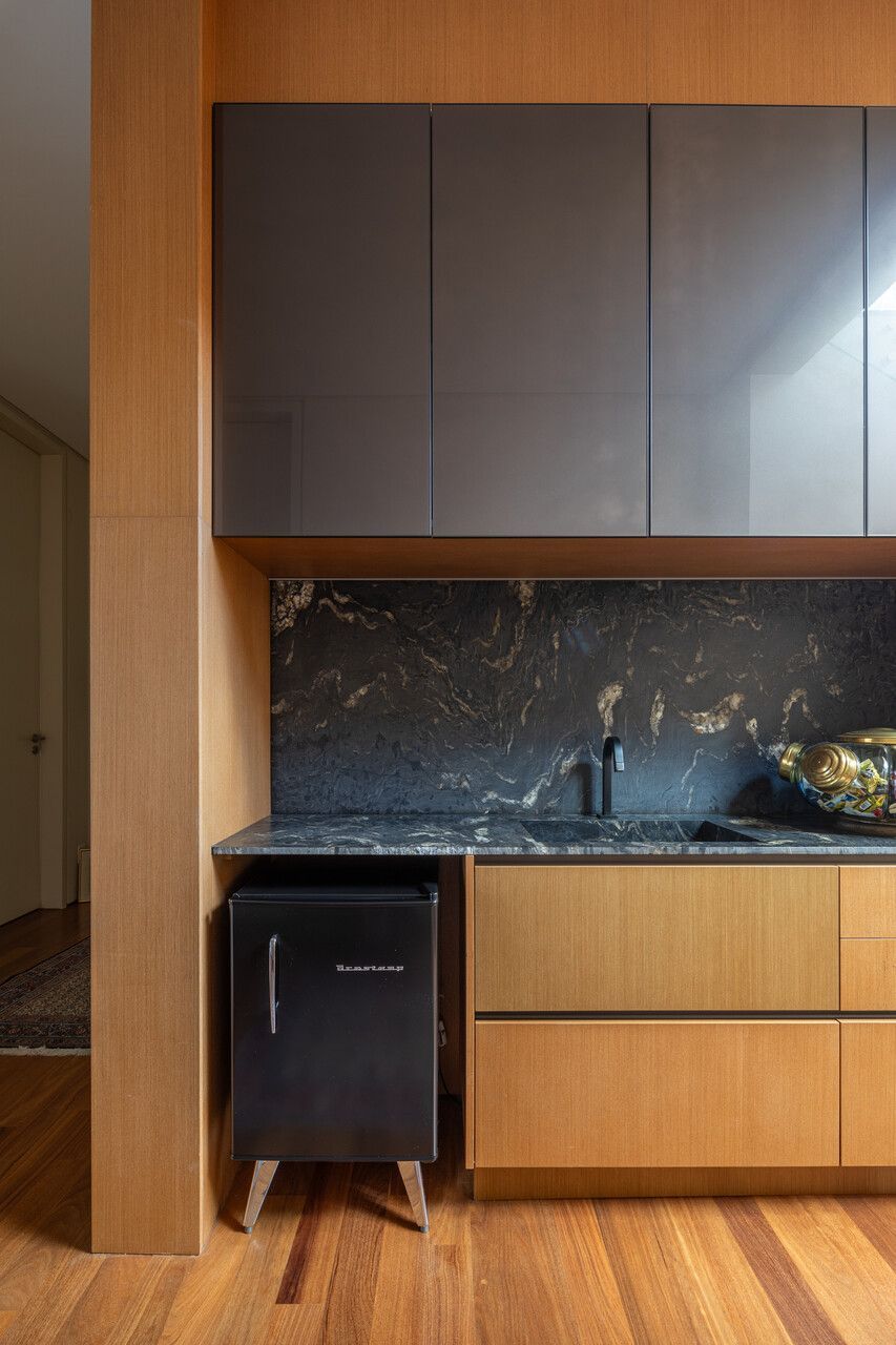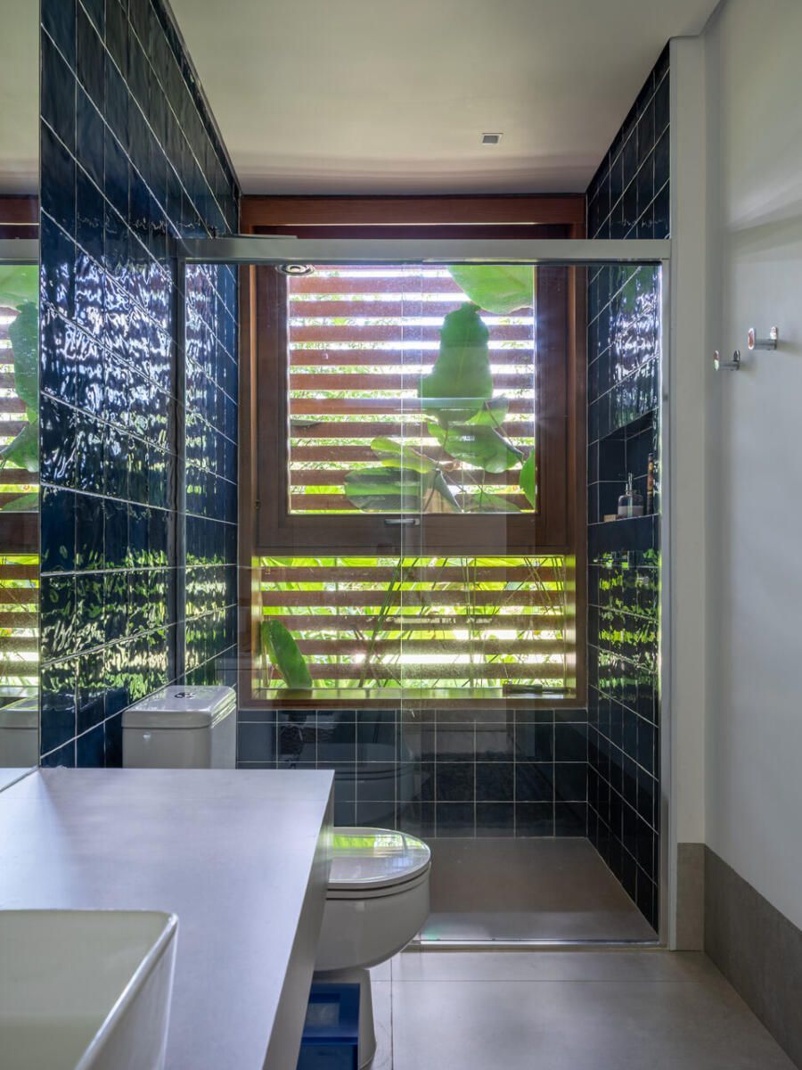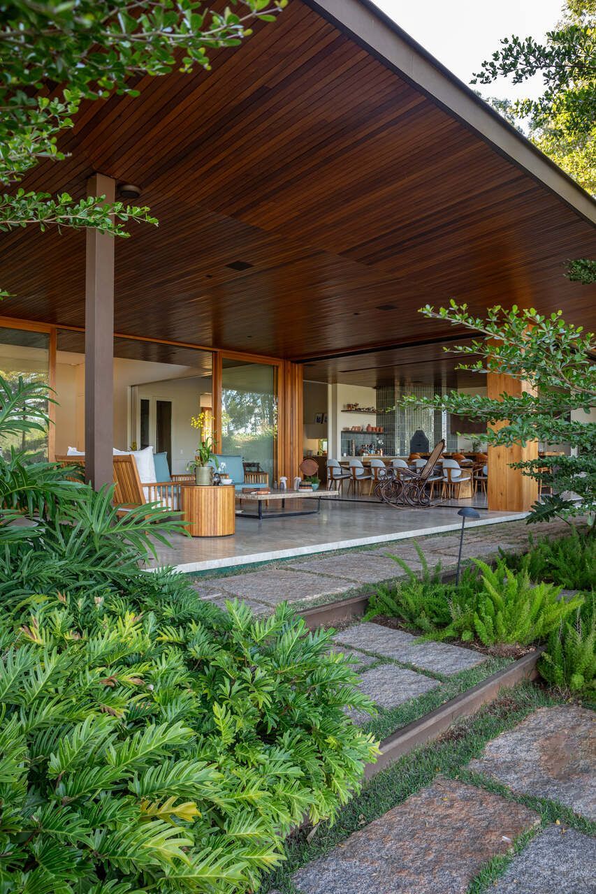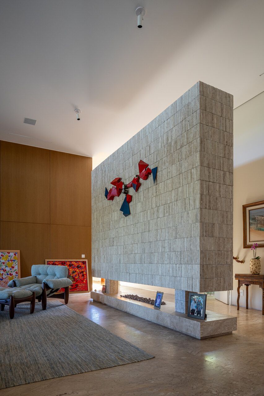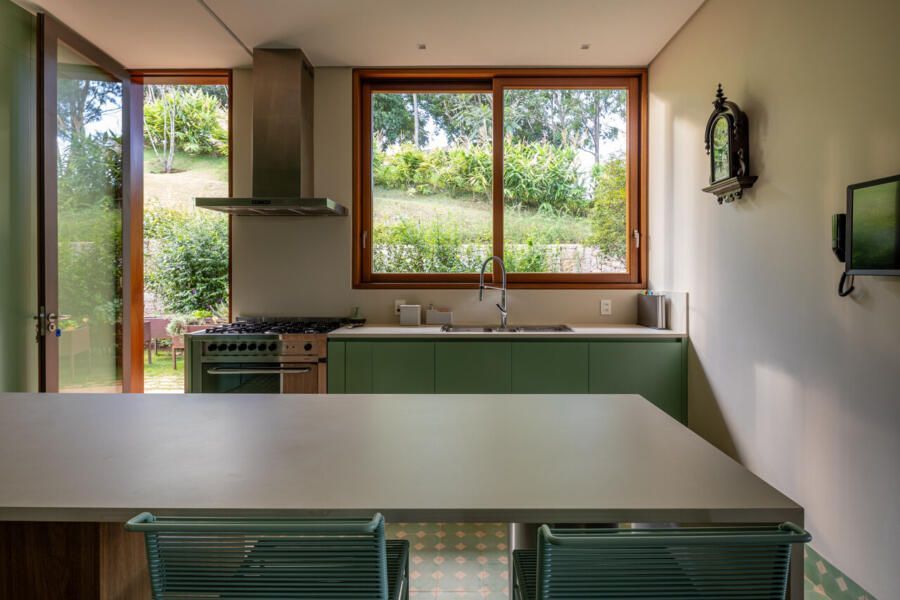 Materiais como pedra, madeira, cerâmica e tons terrosos reforçam a linguagem da casa brasileira contemporânea. Mesmo os sistemas construtivos modernos, como a cobertura Alwitra e os caixilhos de alumínio, foram especificados em acabamentos opacos e naturais para manter a harmonia visual. O projeto luminotécnico de Marcos Castilha valoriza as texturas e cria atmosfera acolhedora, enquanto a marcenaria traz sofisticação e funcionalidade aos interiores.