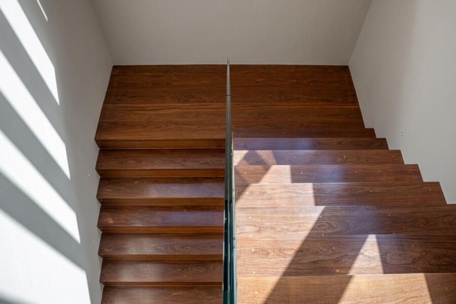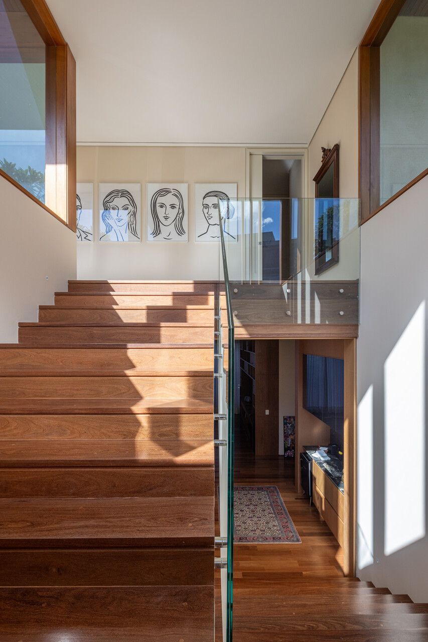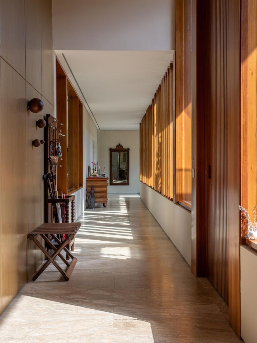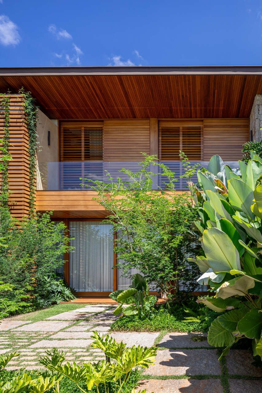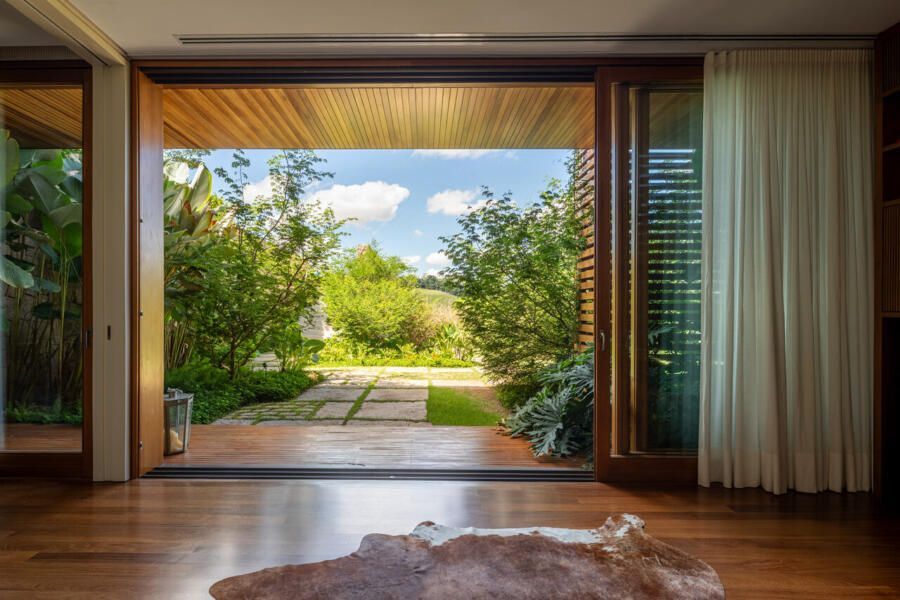 A clareza do projeto se reflete na divisão funcional, que distingue as zonas íntima, social e de serviço, mantendo percursos fluidos e iluminados naturalmente. O paisagismo de Alex Hanazaki emoldura a arquitetura com sutileza, proporcionando sombra, conforto visual e privacidade, enquanto as galerias de vidro funcionam como costura arquitetônica que convida o jardim a participar do dia a dia da casa.