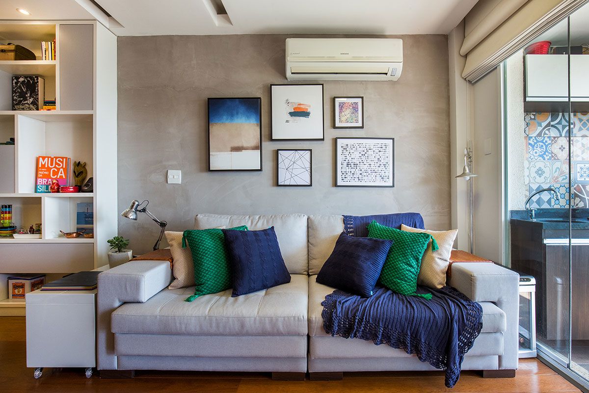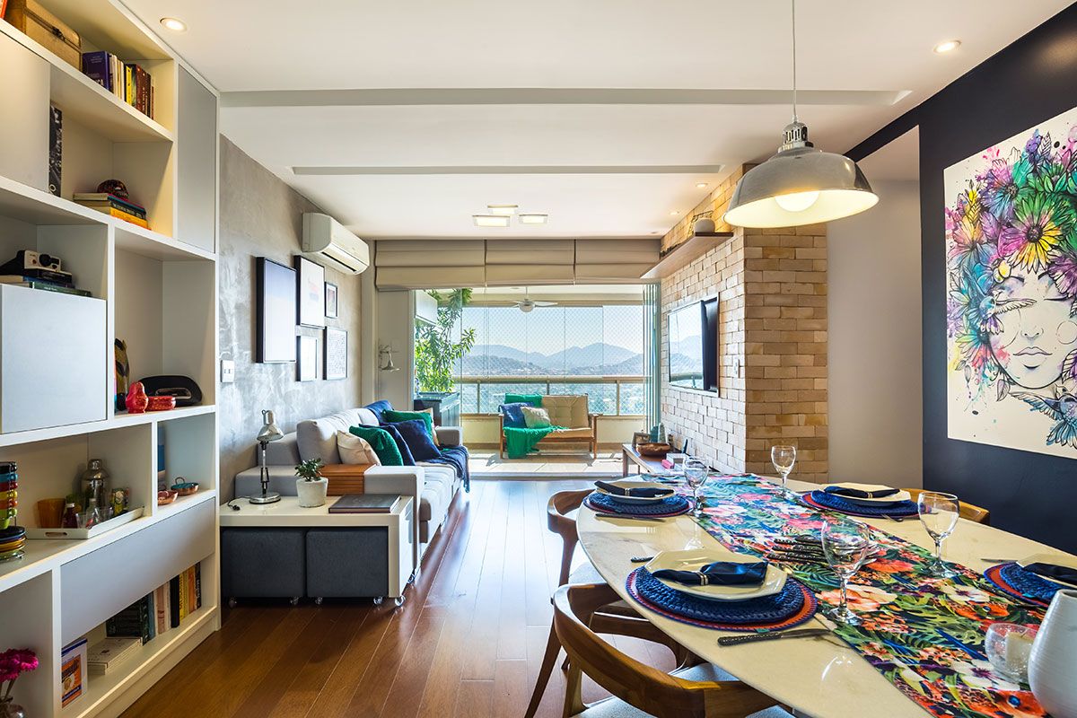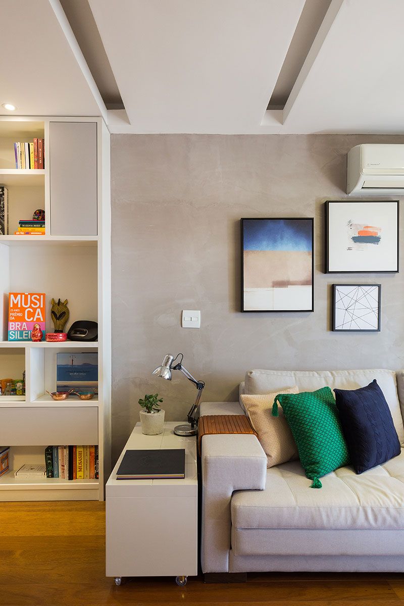 O escritório teve vários desafios em relação ao projeto. O primeiro foi conciliar os adornos, marcenaria e mobiliário que já haviam sido adquiridos pelo casal. Com isso, parte dos quadros, adornos e mobiliário foram realocados para outros ambientes do apartamento, deixando a sala mais livre para a nova proposta.