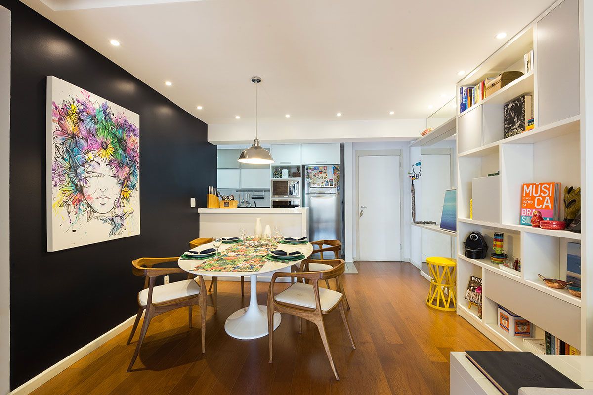 A proprietária solicitou ao escritório no início do projeto a exposição de um grafite feito sob medida para a sala. Para dar destaque, apostaram em uma parede pintada de azul naval Suvinil, que destacou o Grafite elaborado pela artista Mari Pavanelli e também a mesa clássica Saarinen.