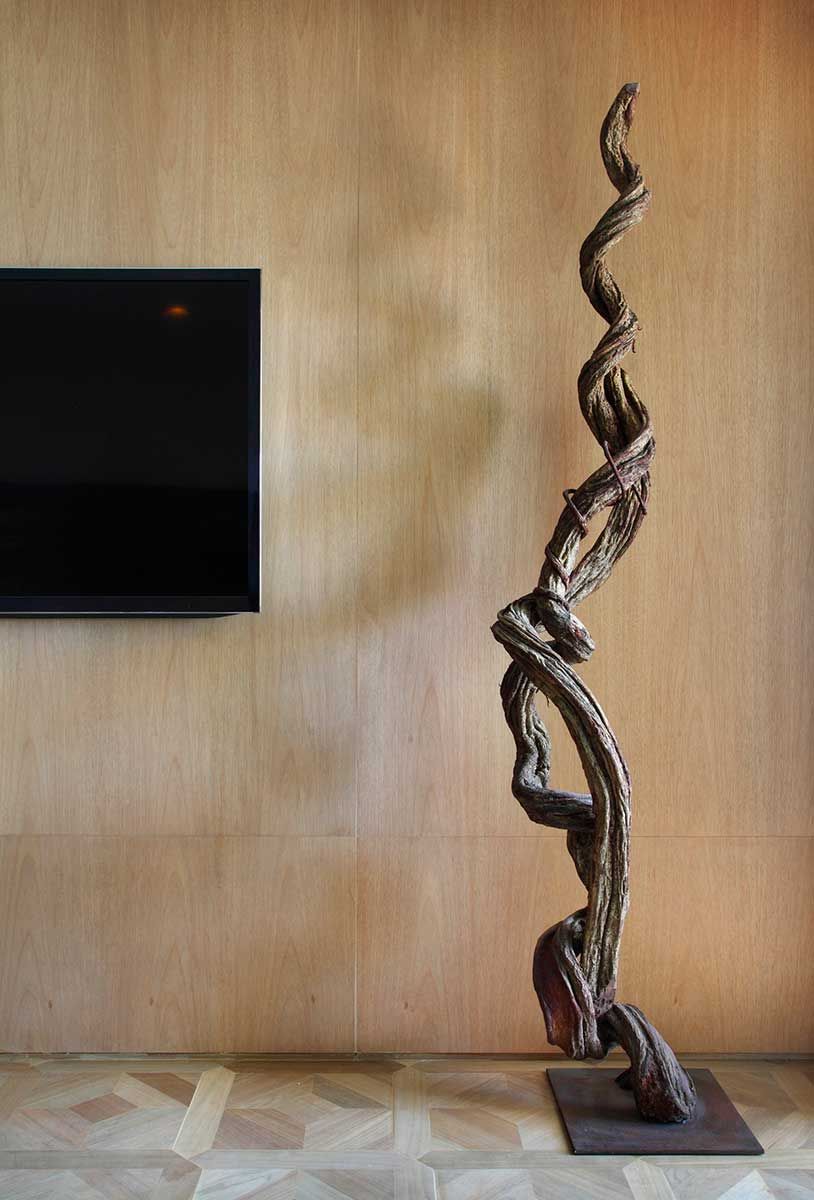 Para esse projeto o escritório utilizou poucos e bons materiais, totalmente naturais como limestone e madeira. Tiveram ainda cuidado com os detalhes, como por exemplo, o requadro de madeira e a utilização de obras de arte.