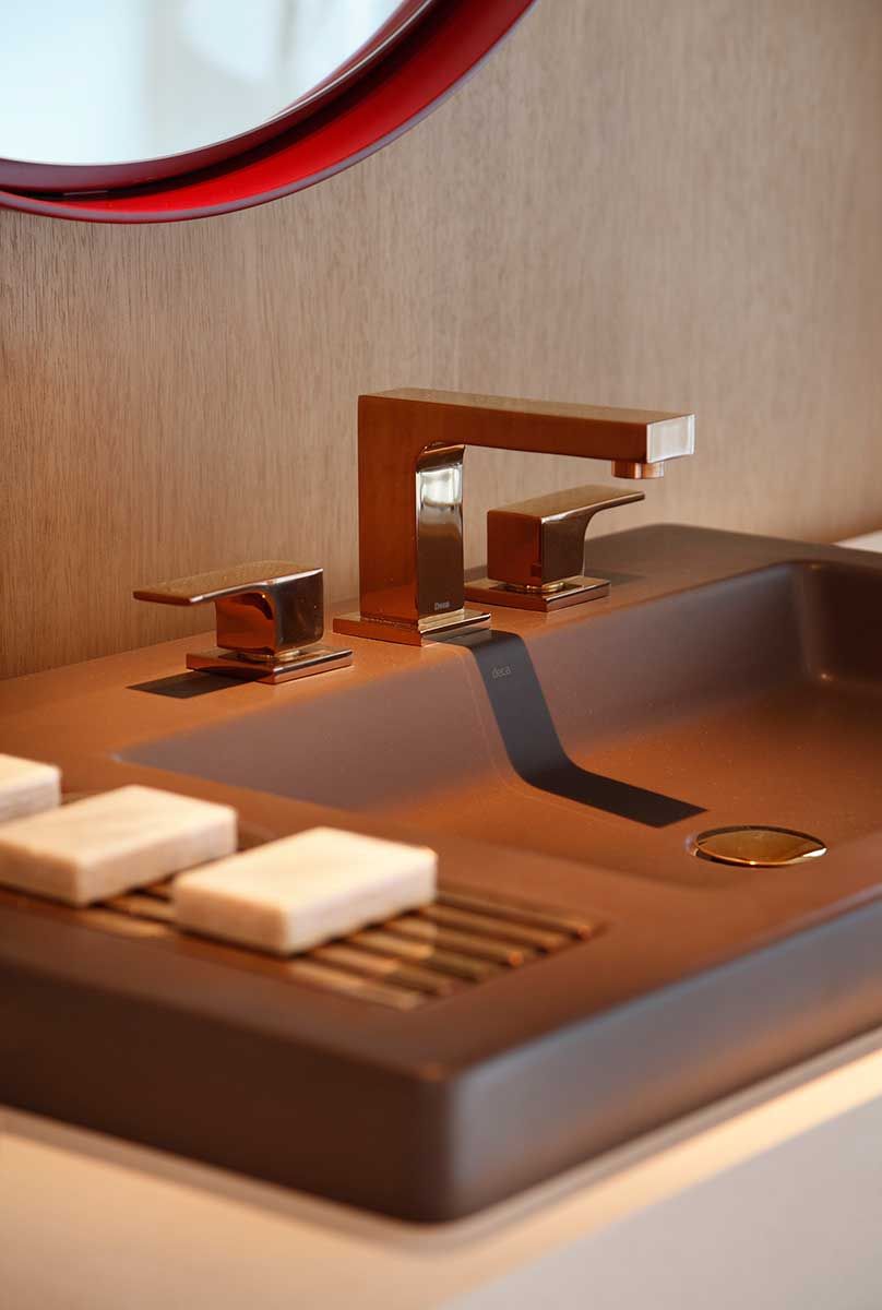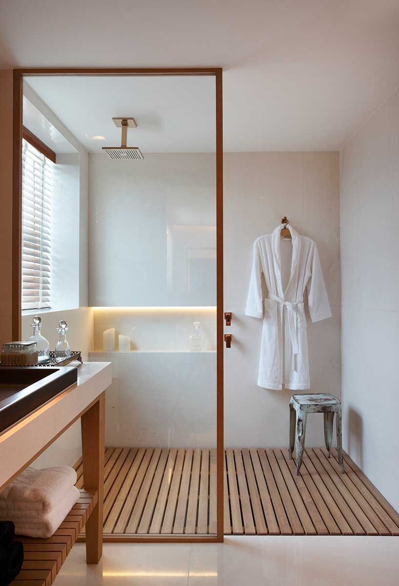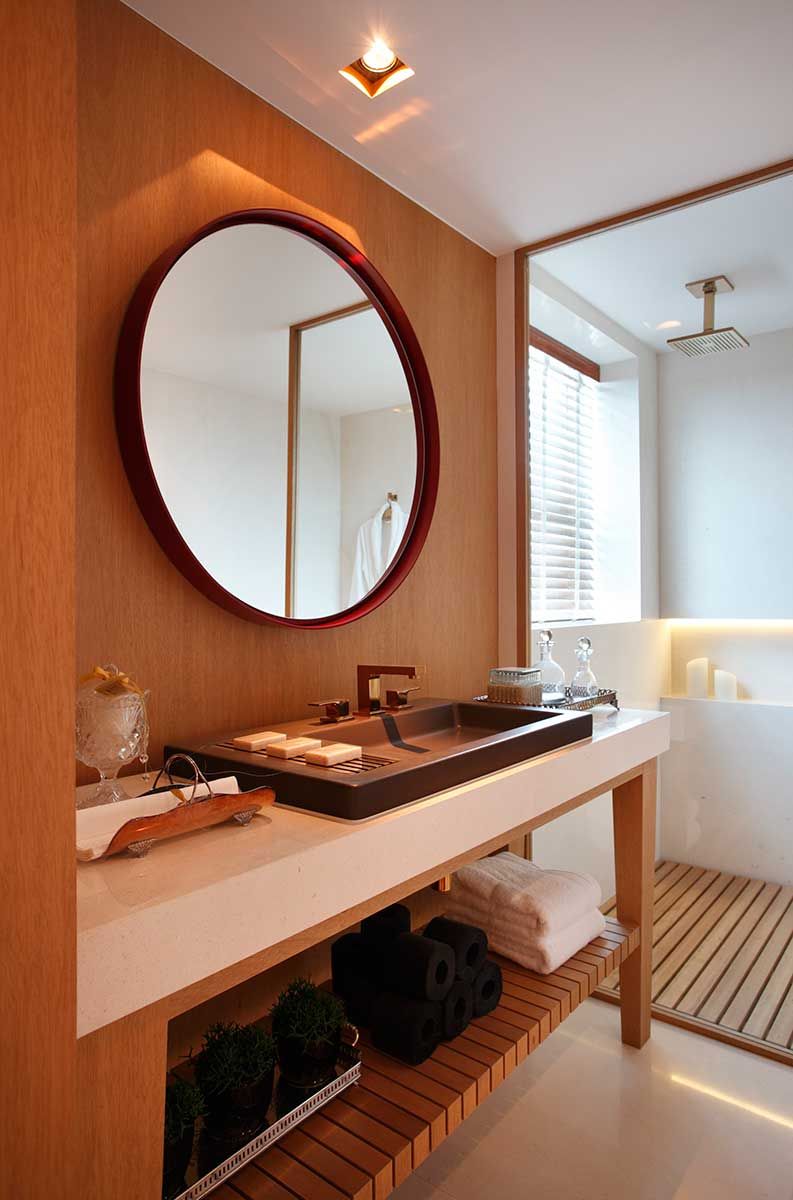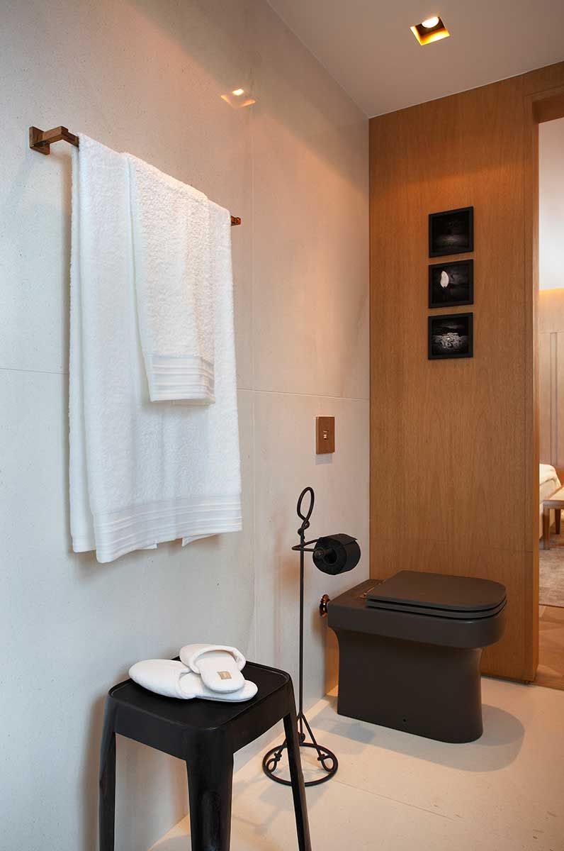 Um dos nossos principais desafios foi criar um banheiro que imprimisse sofisticação de maneira leve e simples.