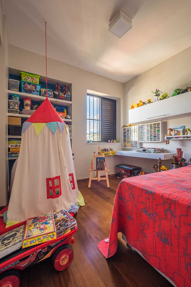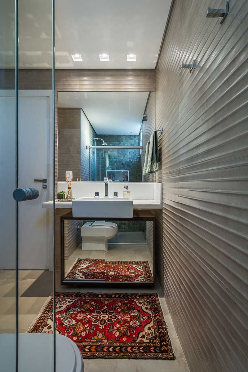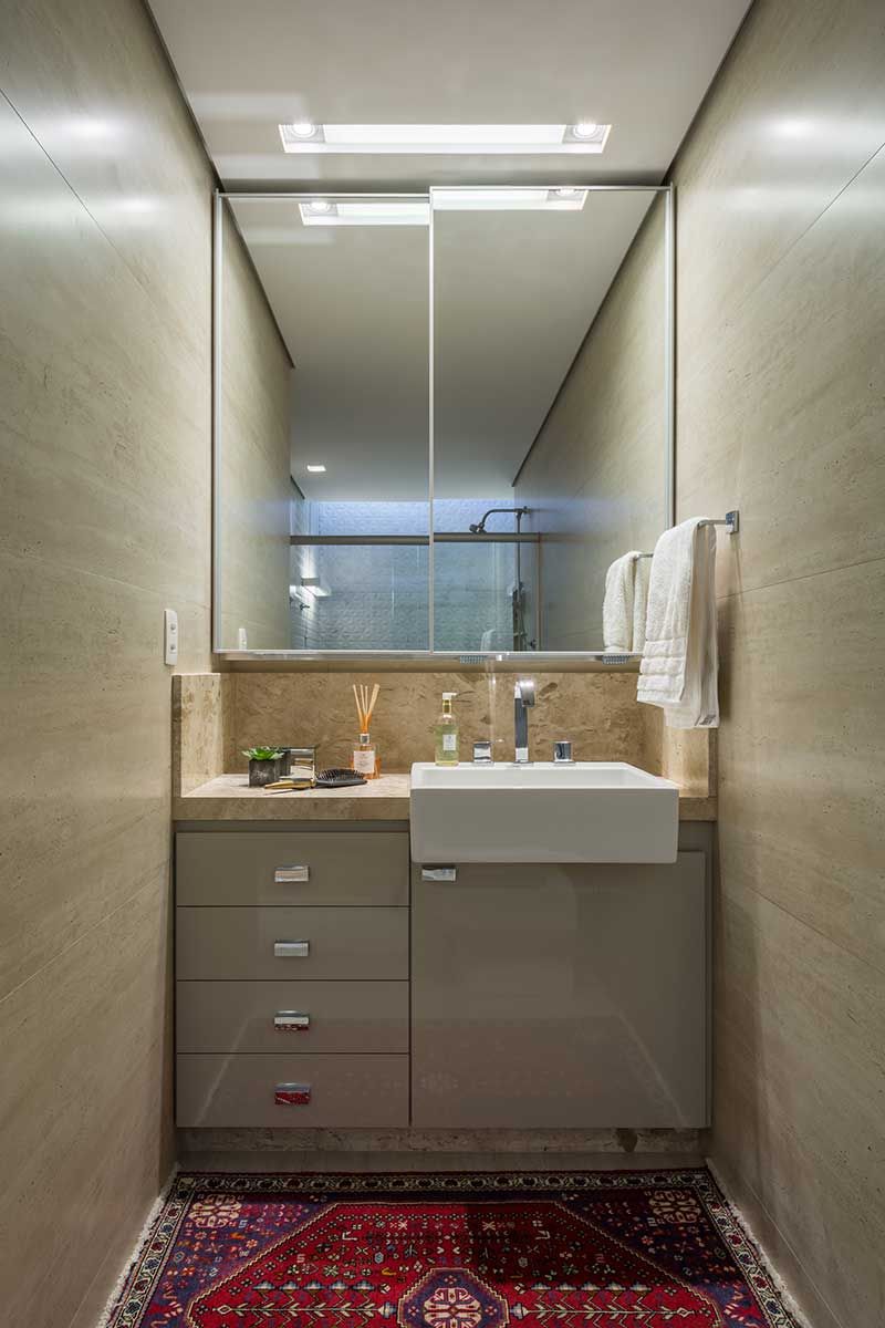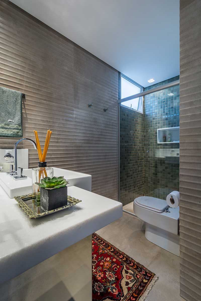 Em equilíbrio com a concepção do projeto, em todos os ambientes, inclusive no banheiro, foram usados lâmpadas de led. Para o piso, foi escolhido o laminado e mdf no lugar da madeira de lei, mais sustentáveis.
