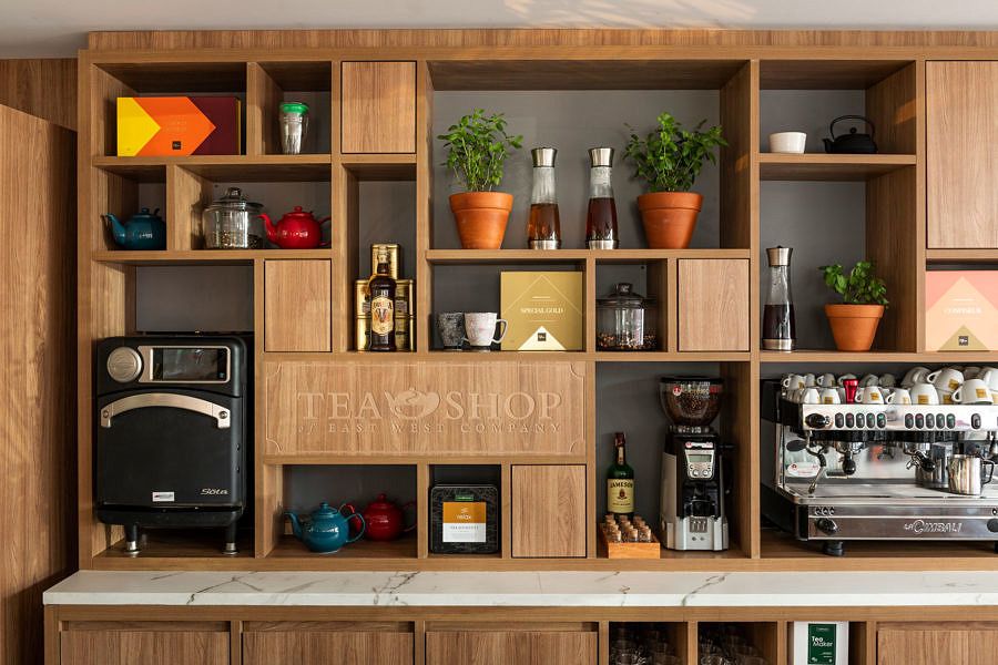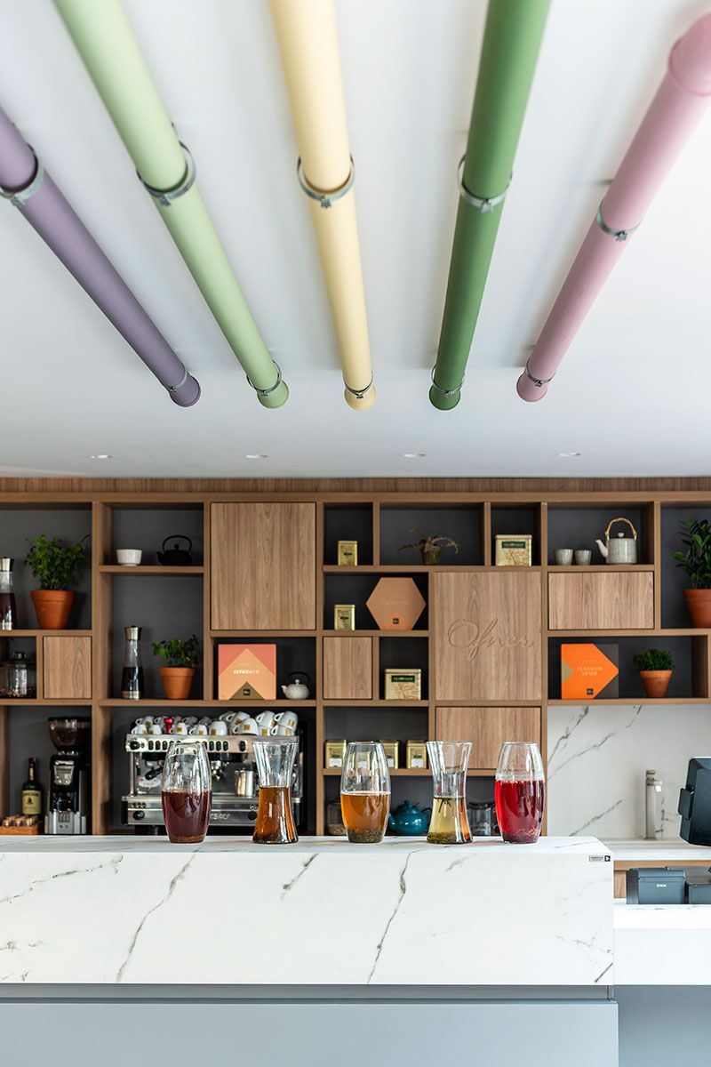 A ideia do escritório foi compor um espaço sensorial em que o visitante degusta um determinado chá e, pode ali mesmo, ver a mesma espécie em um vaso, sentir seu aroma, sua textura, ver suas nuances.