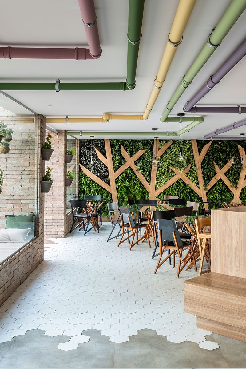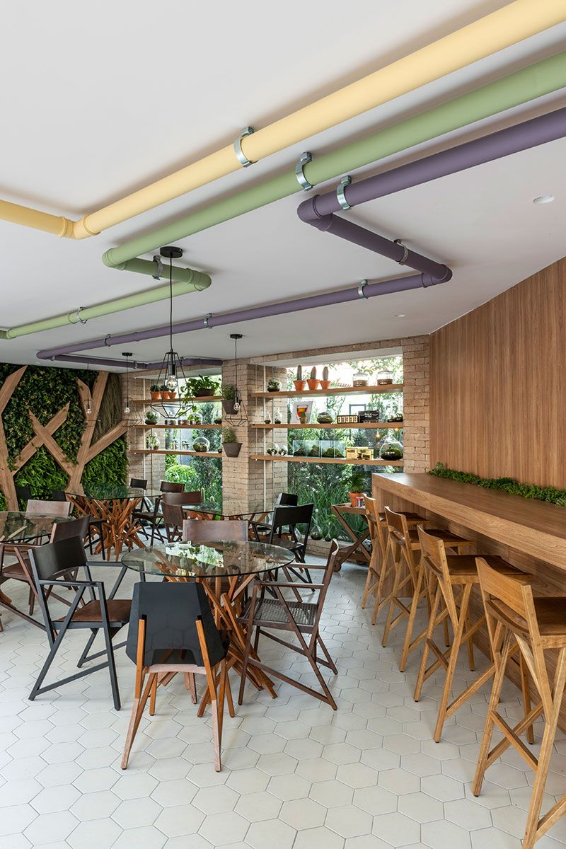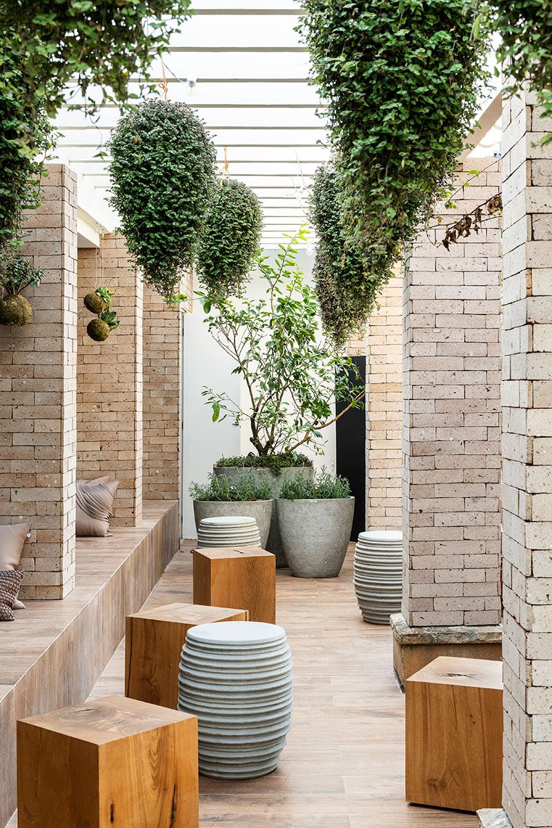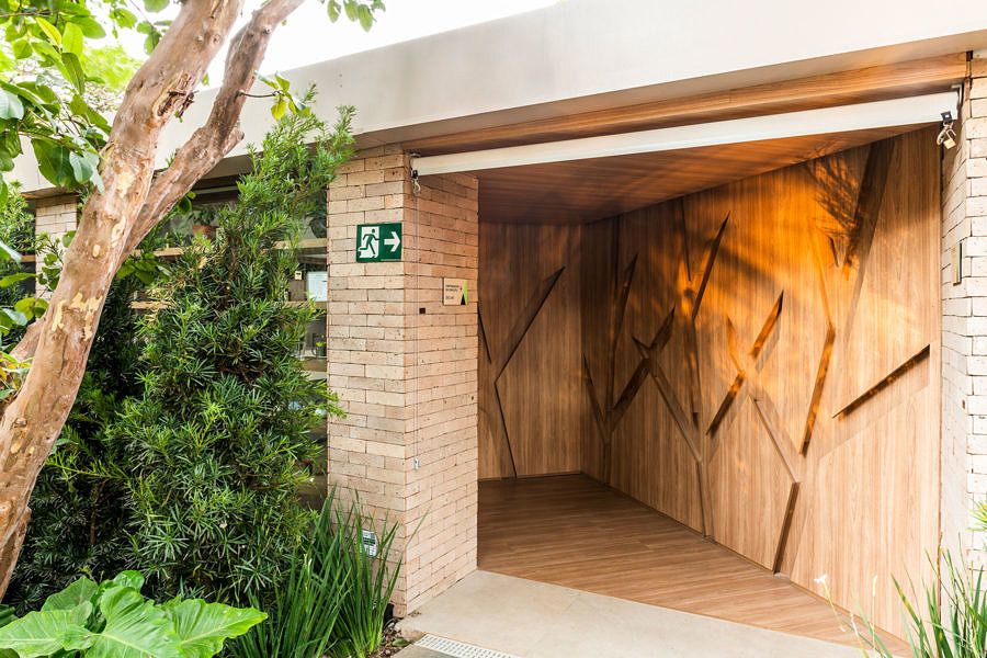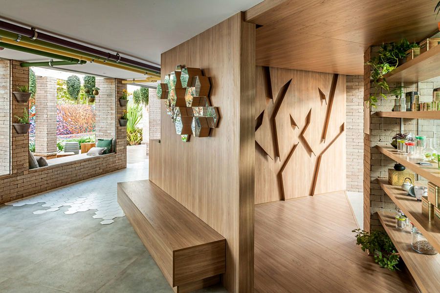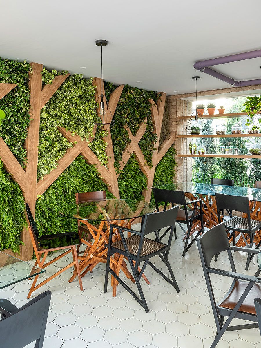 A entrada feita com pé-direito mais baixo, e uma ‘floresta’ dessas mesmas árvores do jardim vertical, em marcenaria. Isso faz com que cada visitante se sinta curioso para saber o que virá em seguida. Então, ao entrar no espaço, ele é abraçado pela natureza por todos os lados.