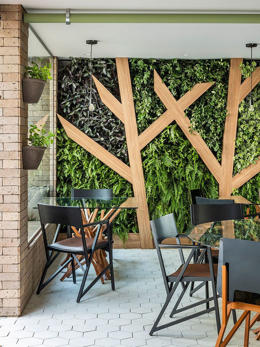 O enorme jardim vertical, repleto de vida e beleza, é um charme à parte. As espécies são separadas e organizadas a partir de árvores secas feitas em marcenaria. O resultado é uma surpreendente composição na parede ao fundo