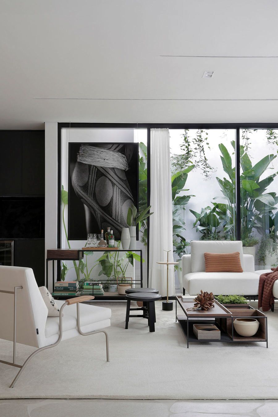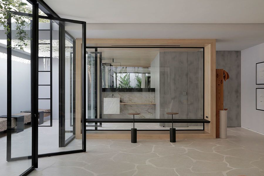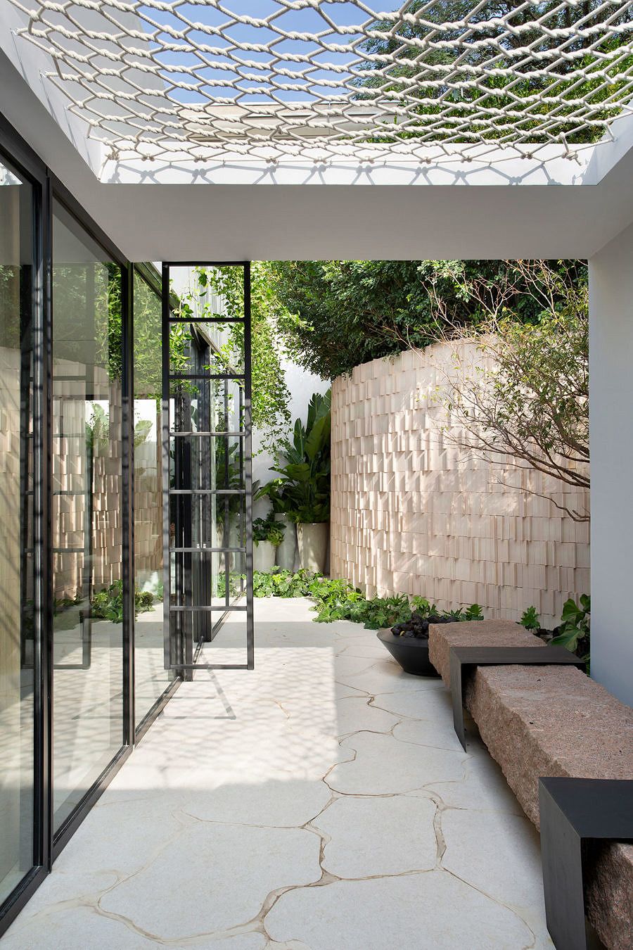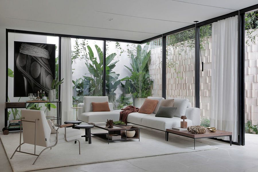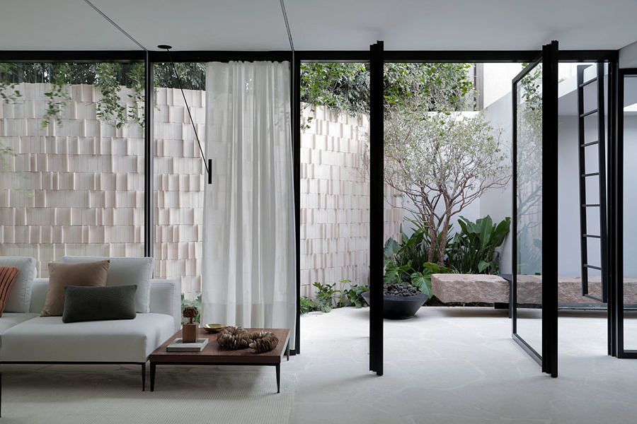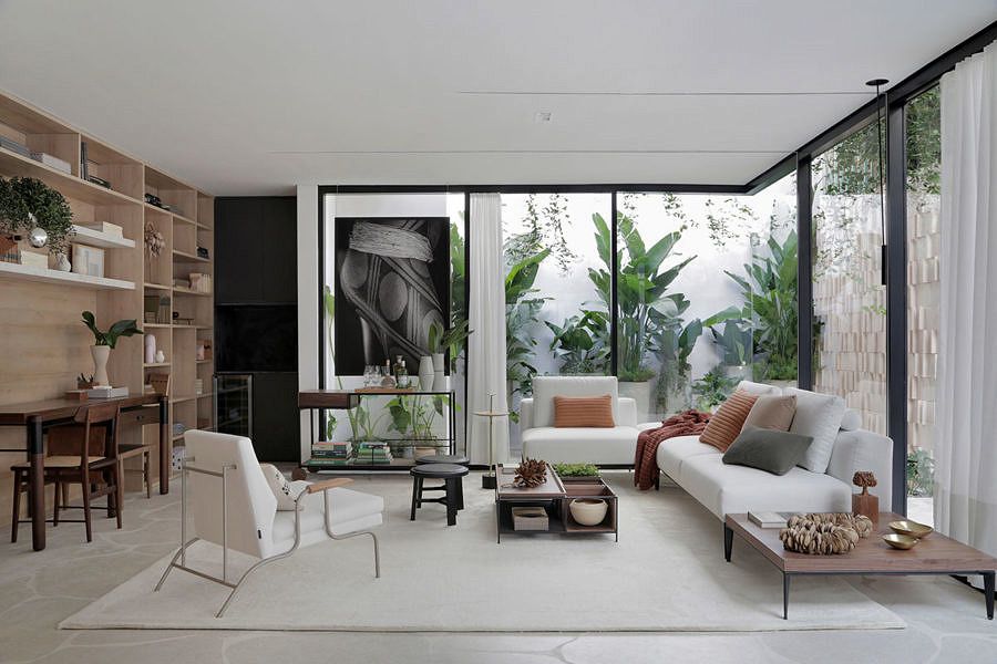 A área externa se integra de forma orgânica com o living através dos panos de vidro que demarcam as fronteiras e deixam o paisagismo, elaborado por Flávio Abílio compor, também, os interiores através de uma chuva de jasmins que percorrem as paredes, a partir do teto verde.
