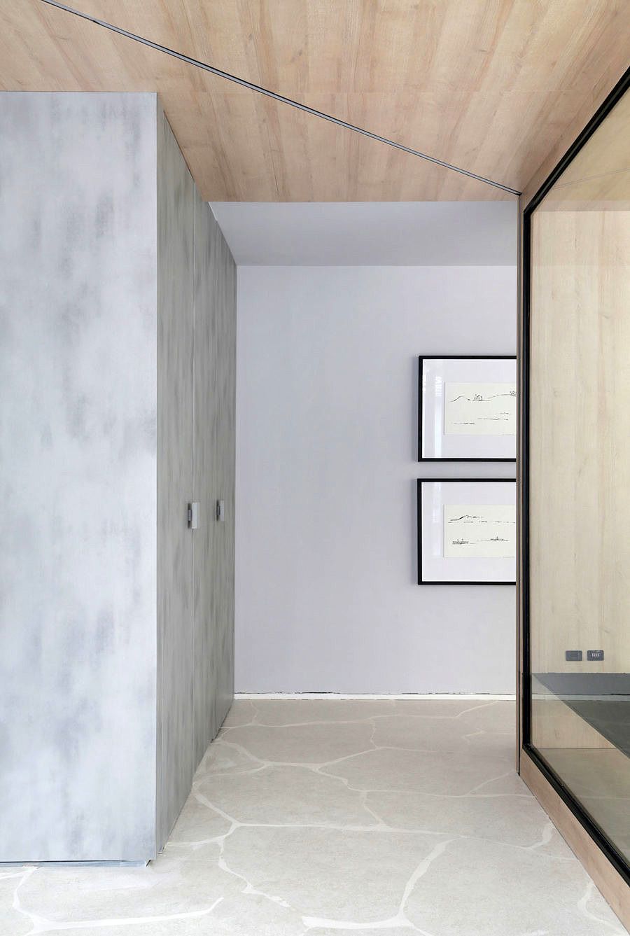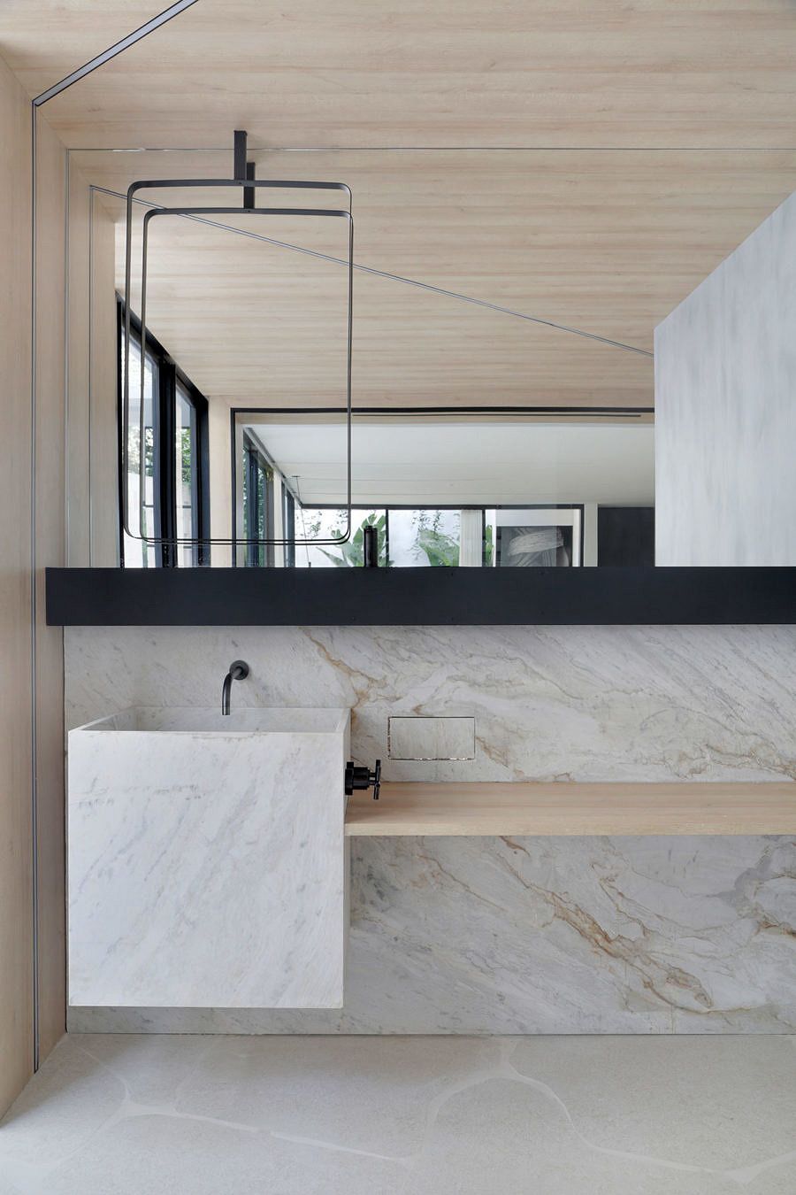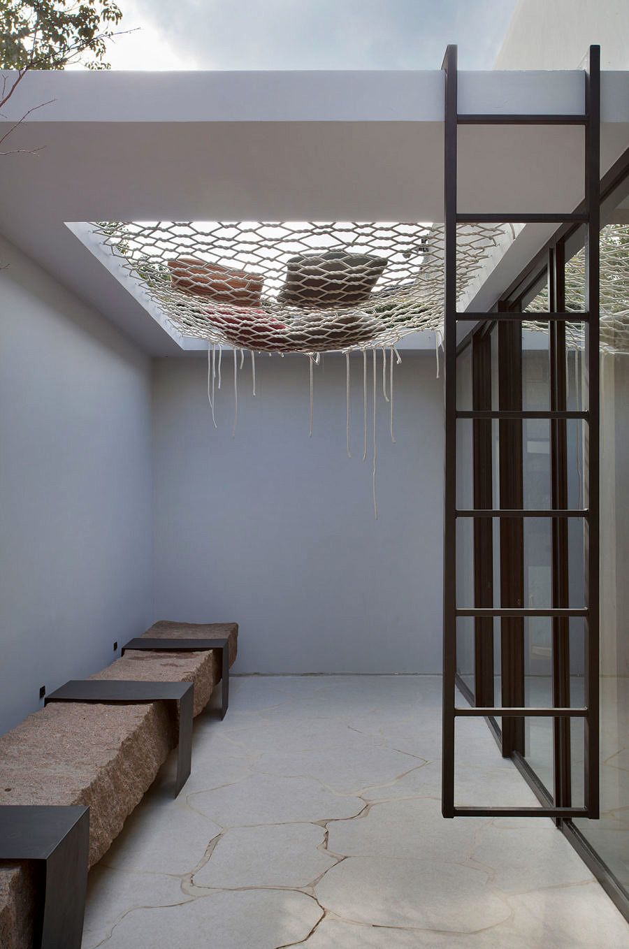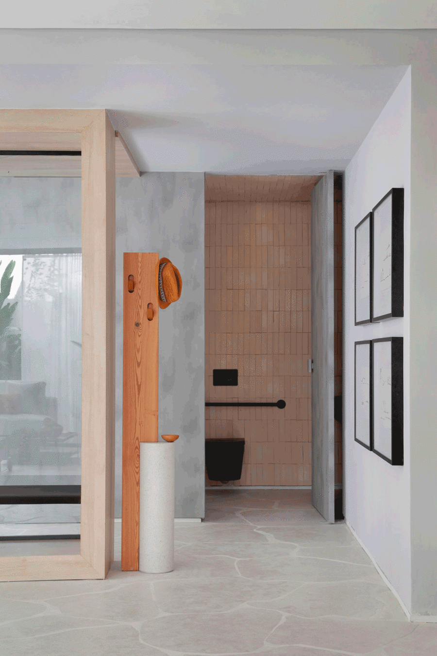 A área externa se integra de forma orgânica com o living através dos panos de vidro que demarcam as fronteiras e deixam o paisagismo, elaborado por Flávio Abílio compor, também, os interiores através de uma chuva de jasmins que percorrem as paredes, a partir do teto verde.