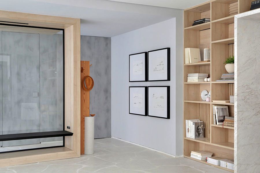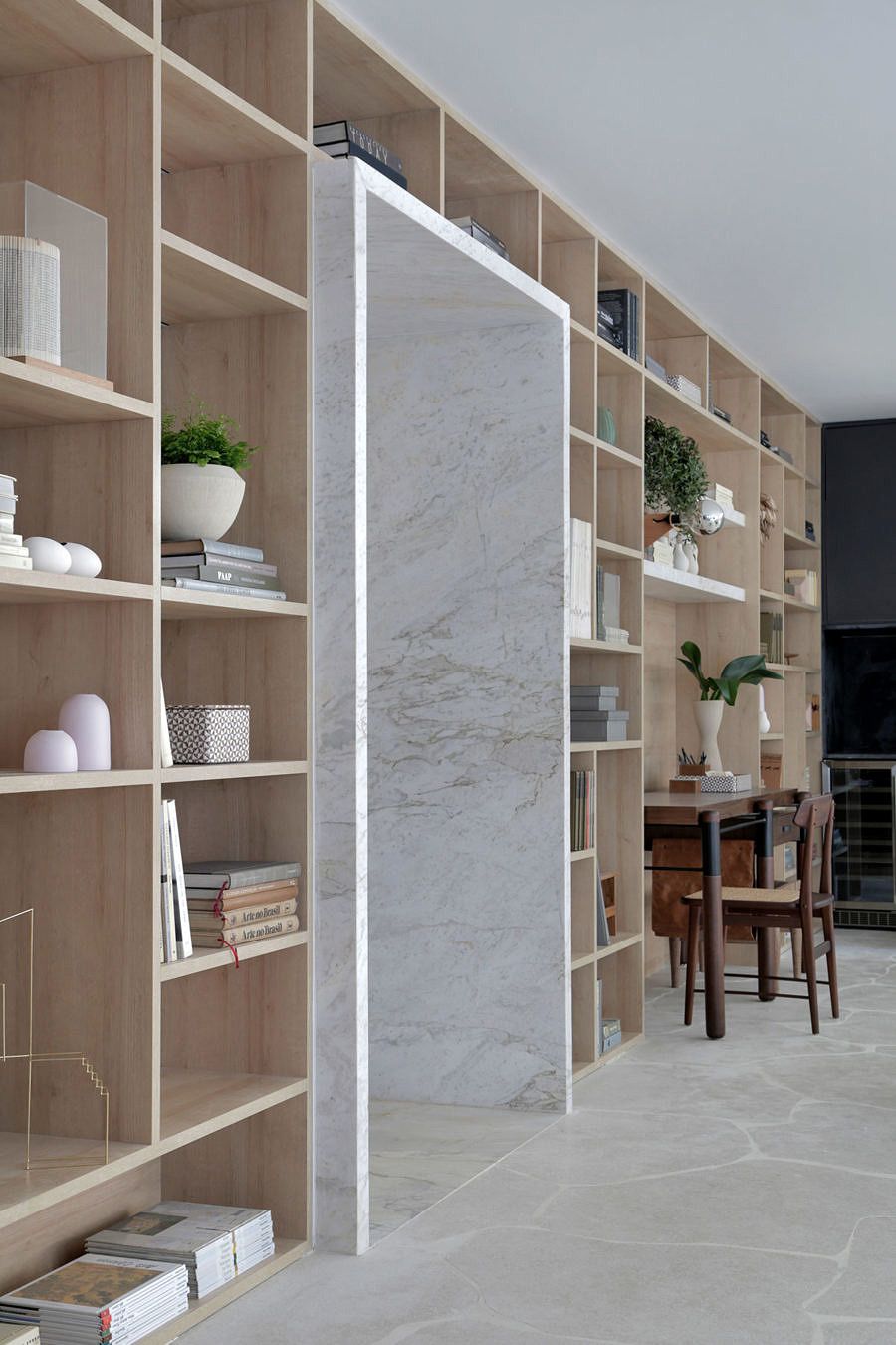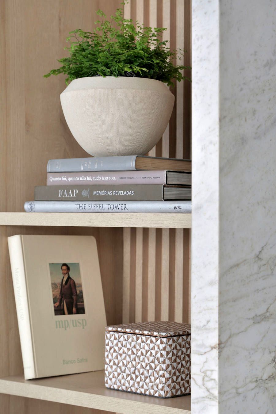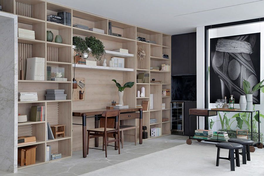 O ambiente assinado pela Ticiane Lima para a CasaCor SP 2019 é a Casa Conecta. O espaço de 125m² é dividido em living, banheiro e terraço. A arquiteta se inspirou em uma arquitetura limpa e moderna, logo na entrada, uma enorme estante nichada que cobre a parede inteira, e exibe a tonalidade natural da madeira clara e uma seleção especial de peças e elementos de décor.
