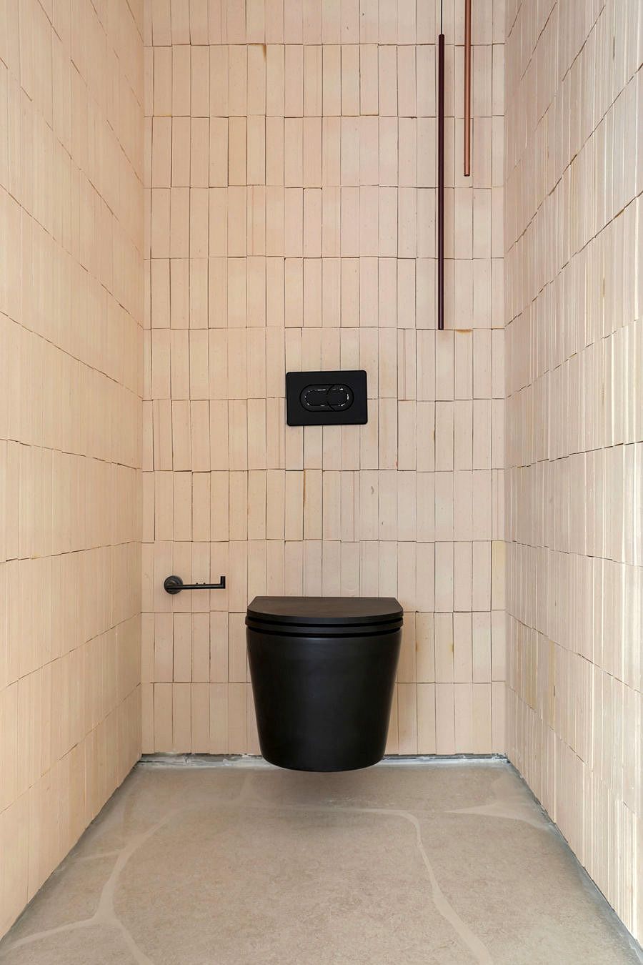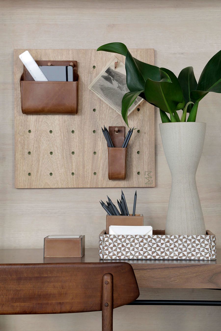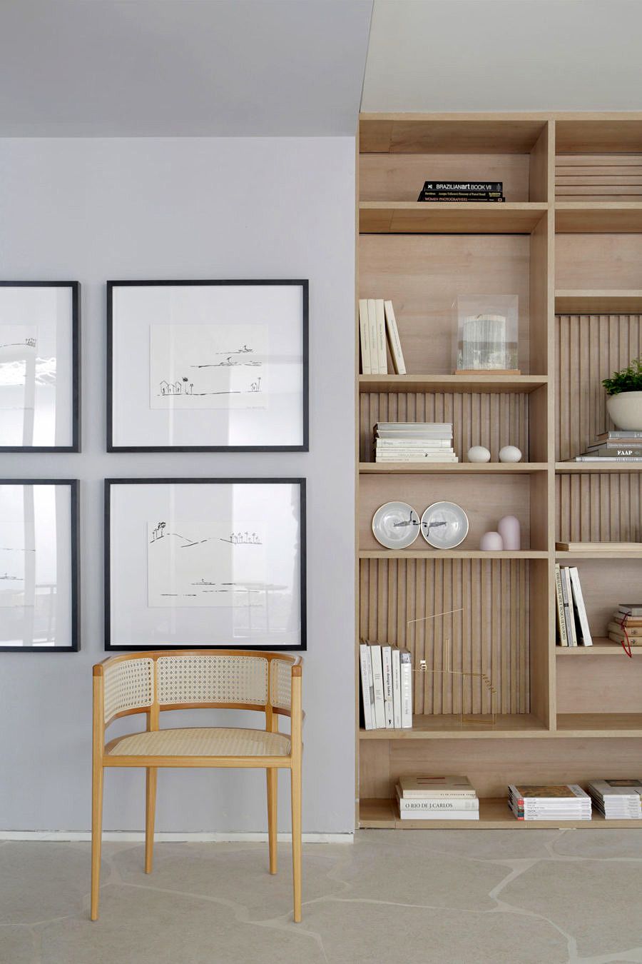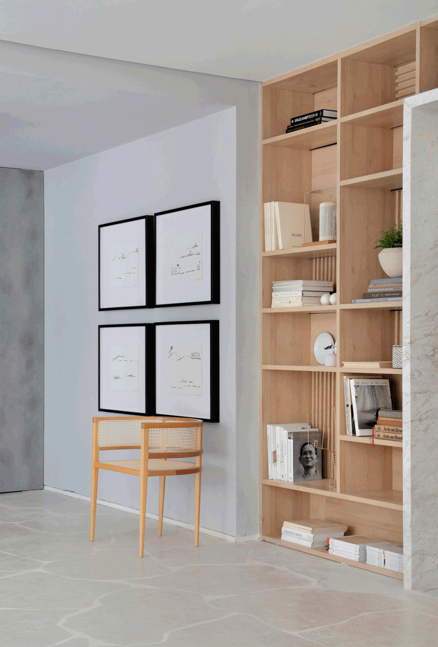 A profissional montou o painel de tijolos em diferentes tons de barro, como uma intervenção artística, criando um efeito ripado que fica em harmonia com os tons sóbrios das paredes. As linhas de iluminação em LED, que nascem de um rasgo nas esquadrias que contornam a laje, emolduram de forma suave a composição e valorizam a entrada de luz natural e a sustentabilidade presente no projeto.