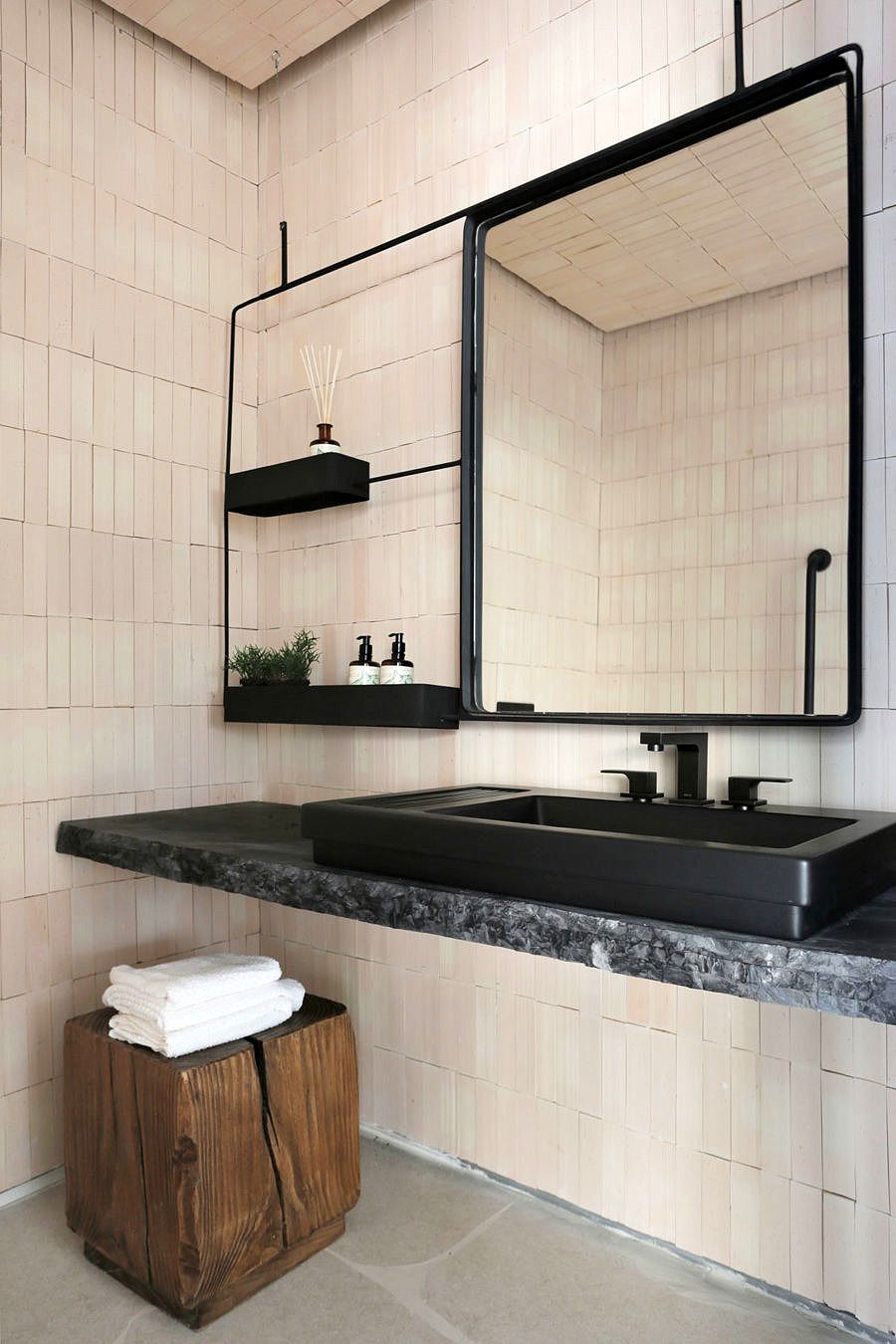 Cada uma das placas do Corallo foi recortada de acordo com o desenho feito pela arquiteta para proporcionar esse visual orgânico e rústico do piso que é um dos pontos de atenção do ambiente.