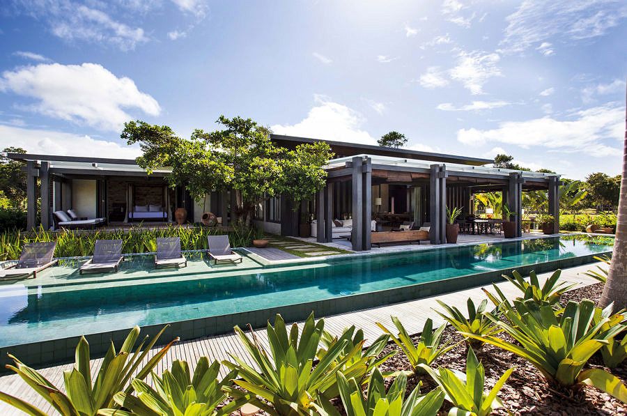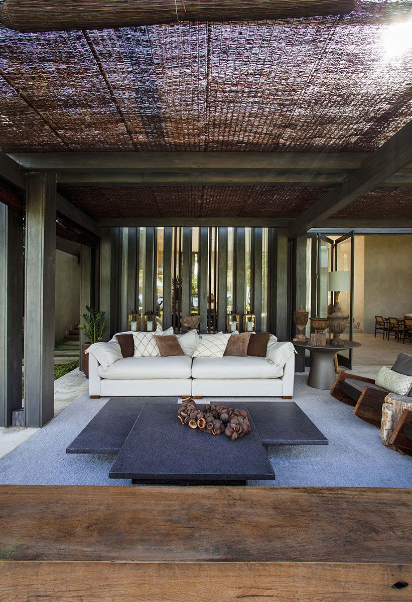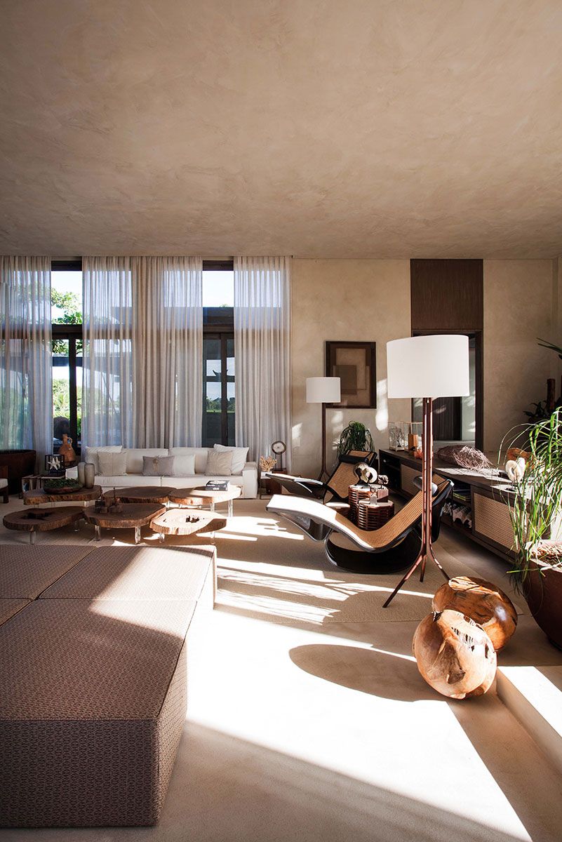 O imóvel é marcado por grandes pilares de madeira e tem pé-direito de 4,5 m. Nas paredes, uma cor desenvolvida especial para o projeto, com referência a areia local.