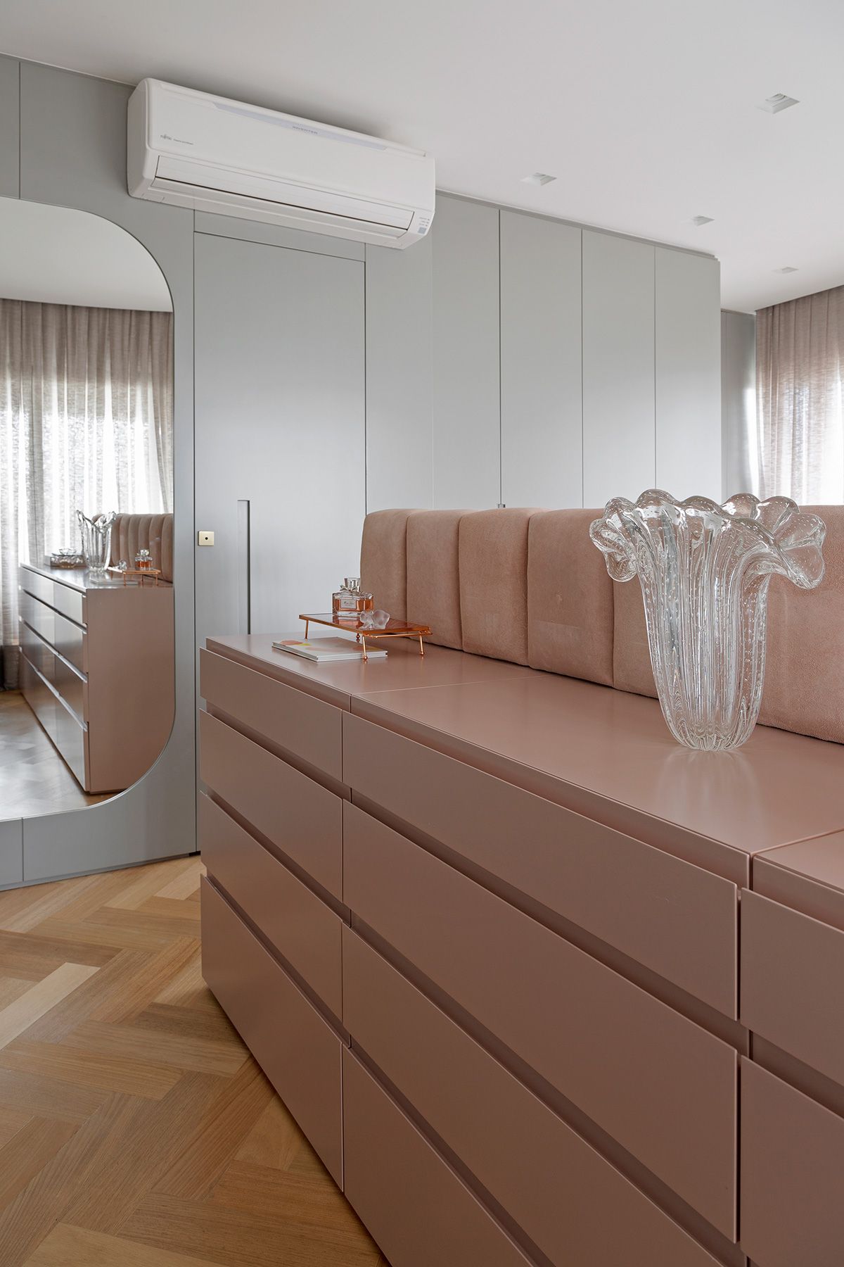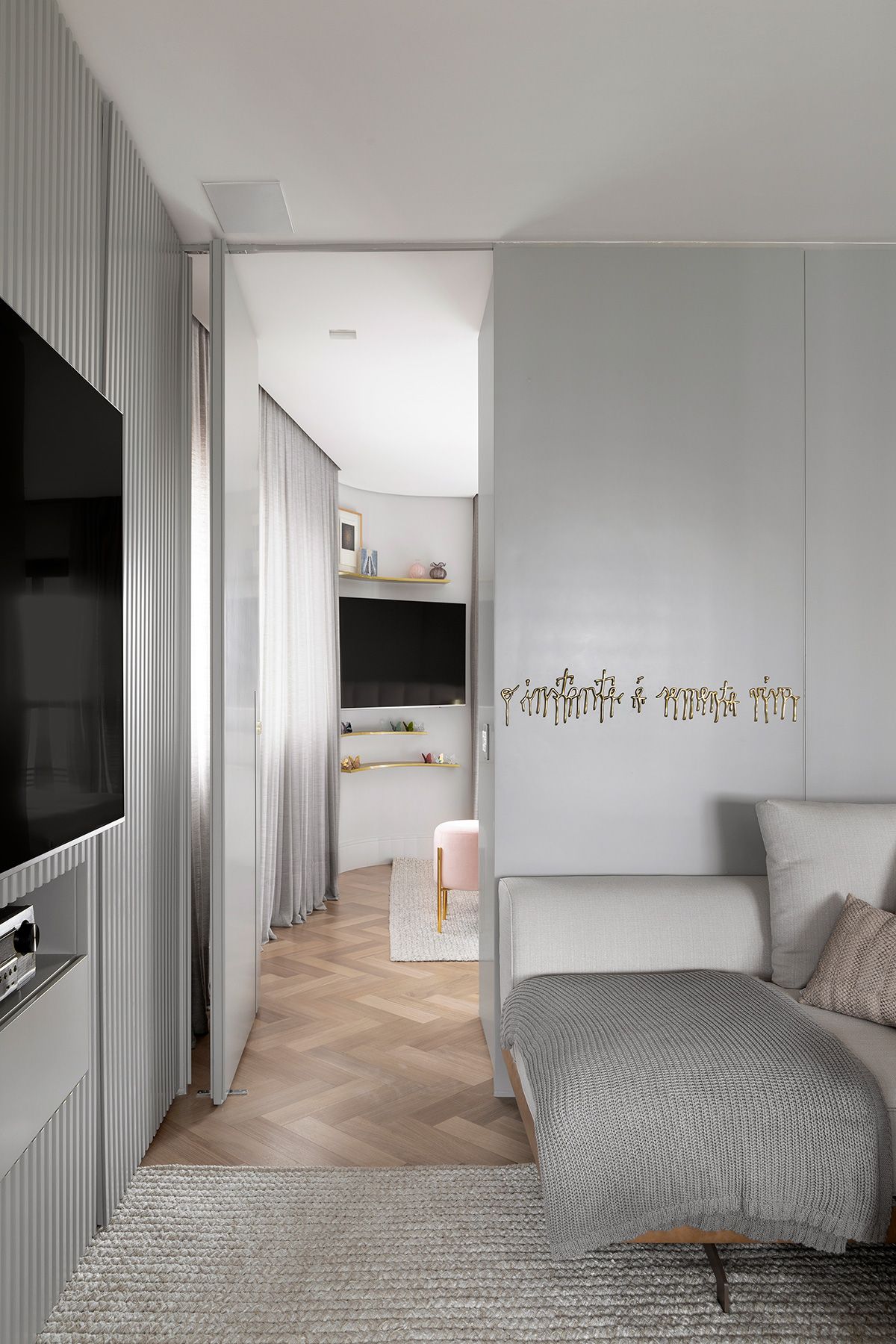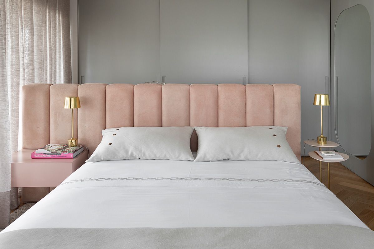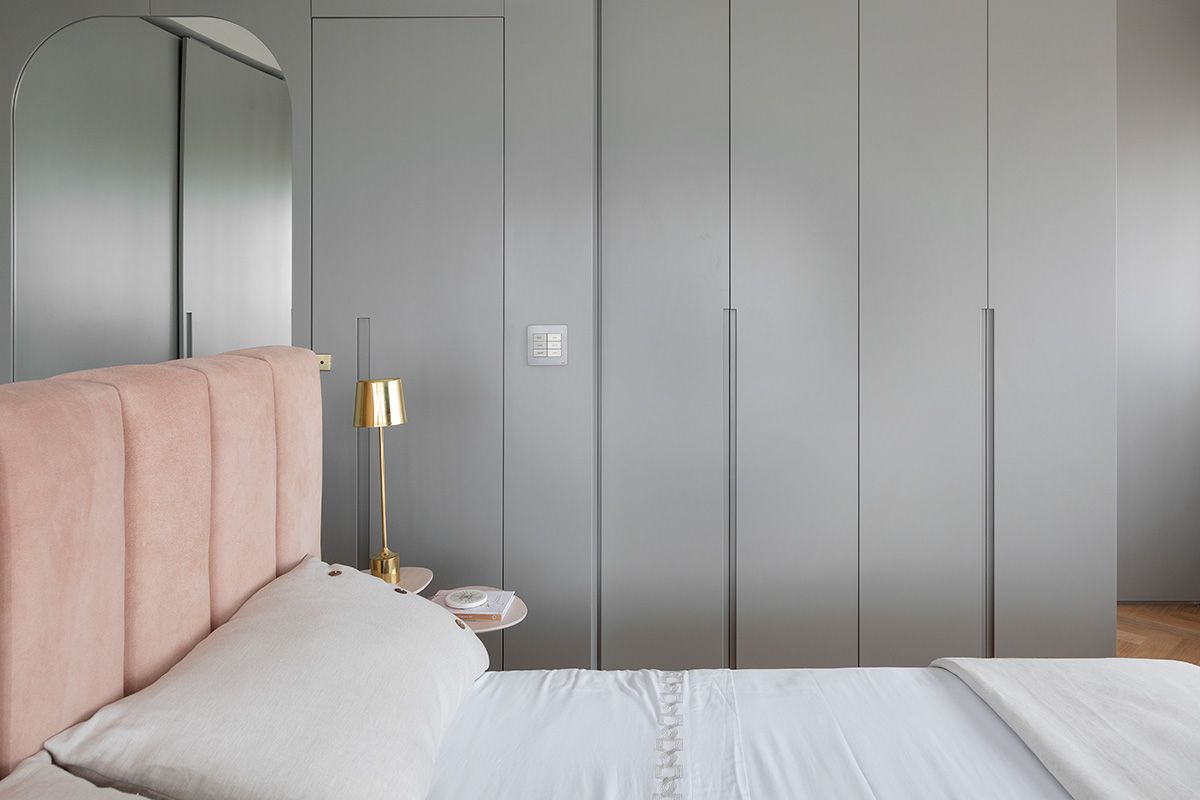 Para atender a demanda de armazenamento em uma planta com poucas paredes livres, um armário dividindo a sala e o quarto foi planejado. A cartela do apê tem predominância de cores neutras e madeira no piso e, a partir disso, foi possível atender à um dos pedidos da cliente: tons de rosa! O rosa foi aplicado delicadamente nos cômodos e os deixou bem aconchegantes, o quarto é um ótimo exemplo, além do lavabo que ficou com muita personalidade.