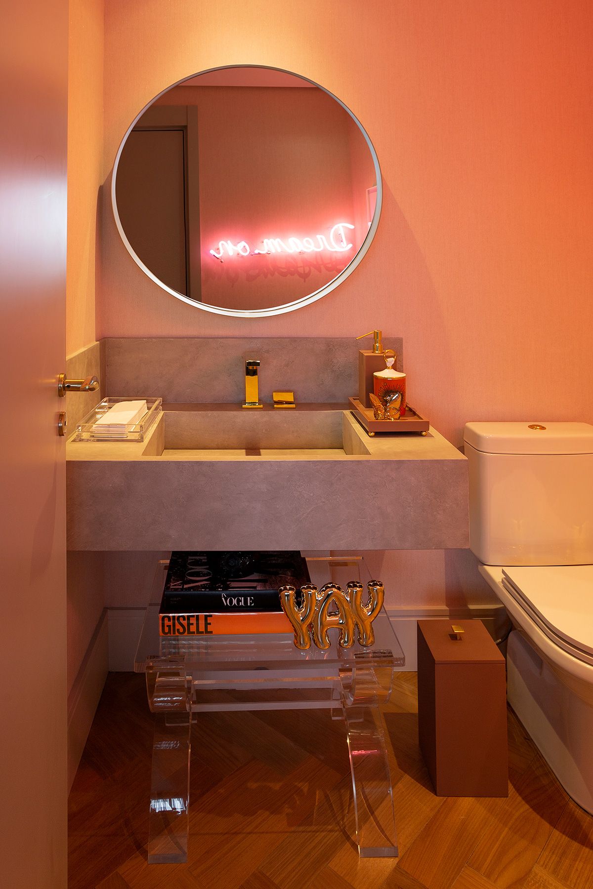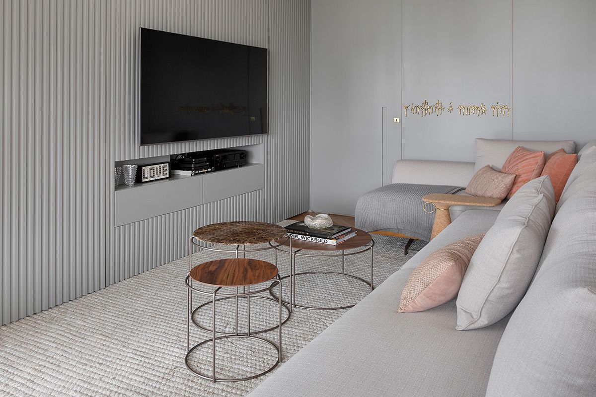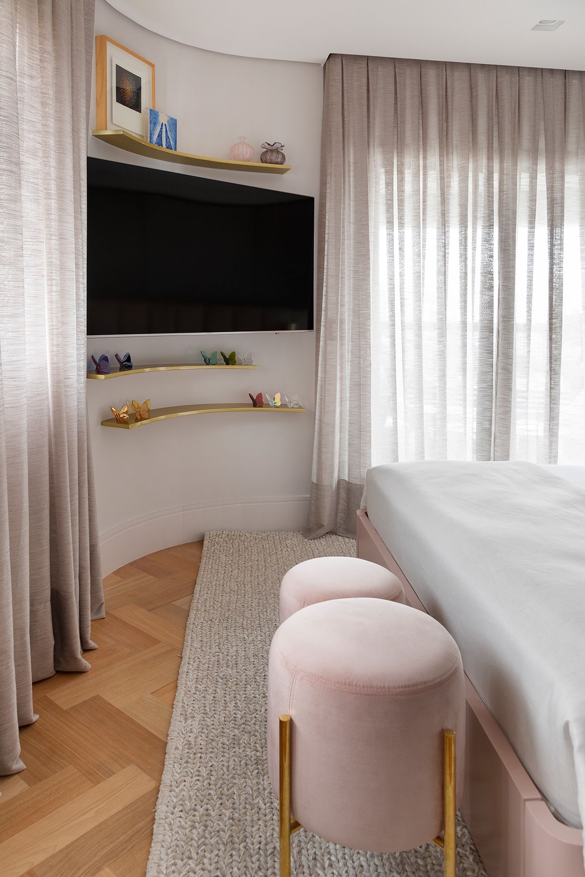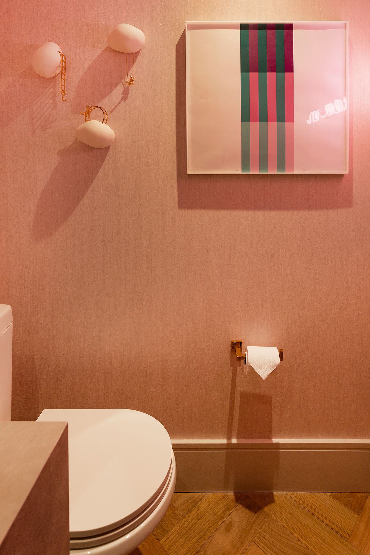 Para atender a demanda de armazenamento em uma planta com poucas paredes livres, um armário dividindo a sala e o quarto foi planejado. A cartela do apê tem predominância de cores neutras e madeira no piso e, a partir disso, foi possível atender à um dos pedidos da cliente: tons de rosa! O rosa foi aplicado delicadamente nos cômodos e os deixou bem aconchegantes, o quarto é um ótimo exemplo, além do lavabo que ficou com muita personalidade.