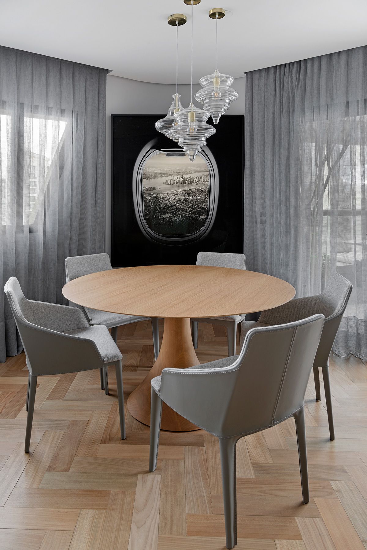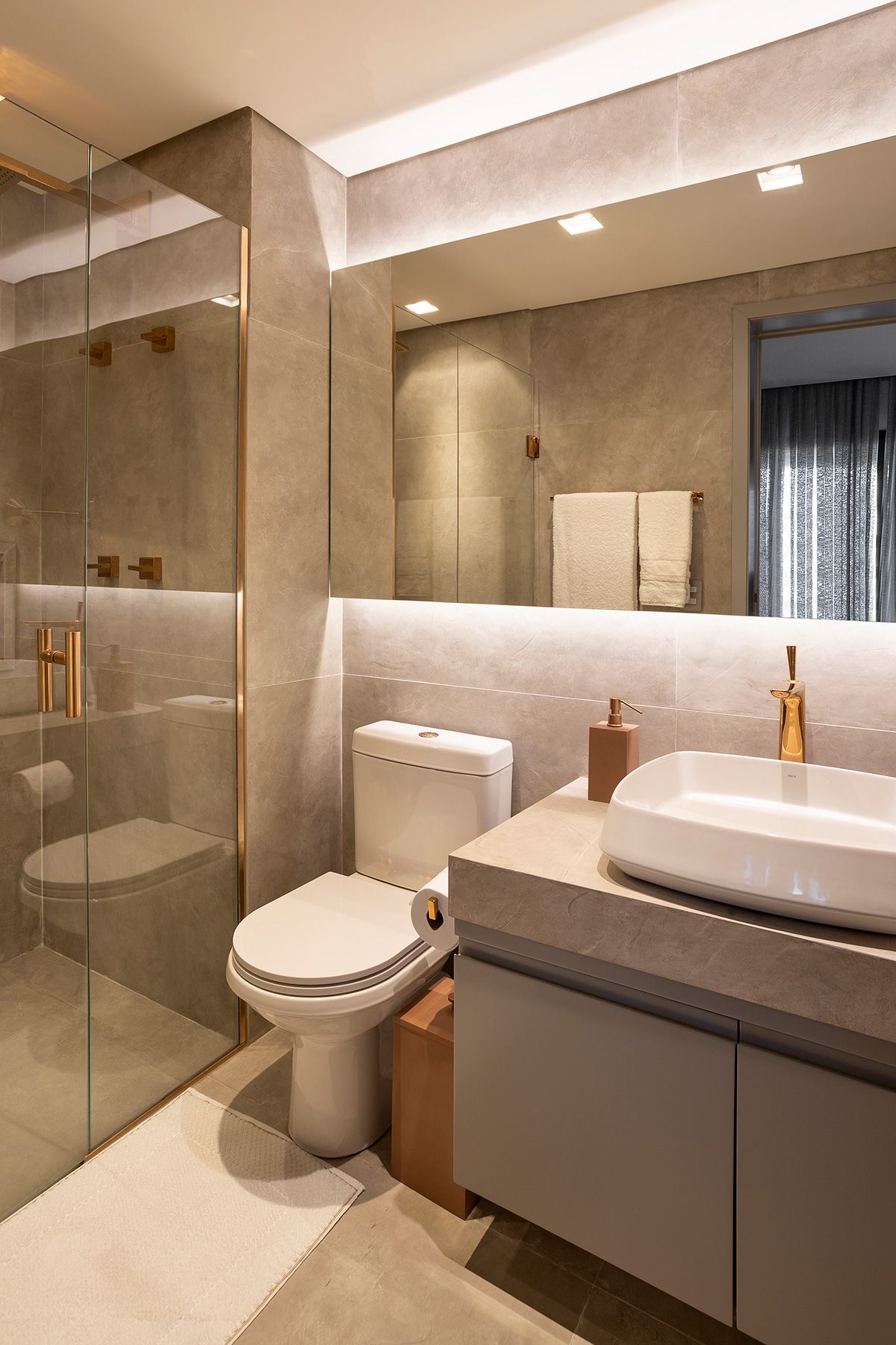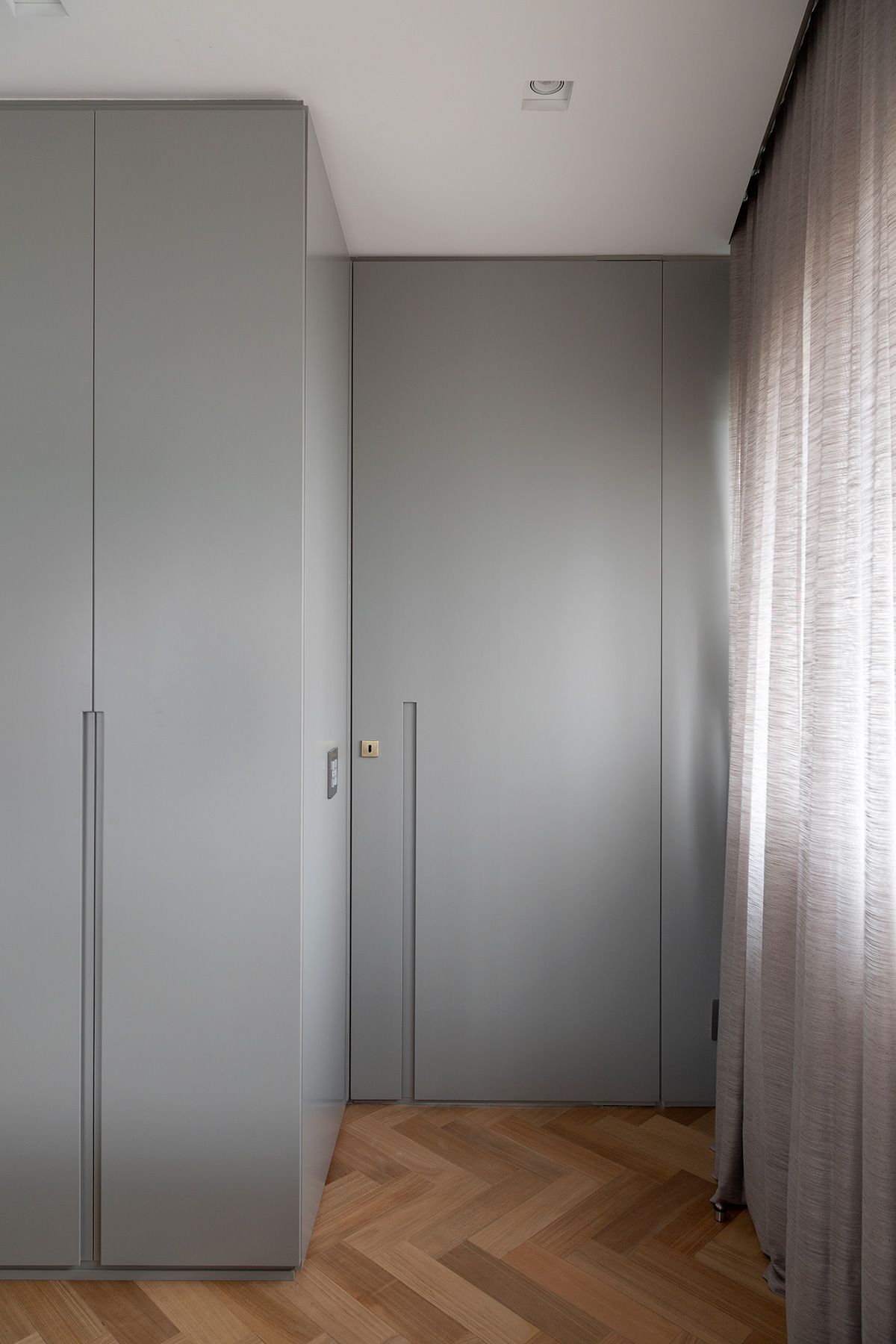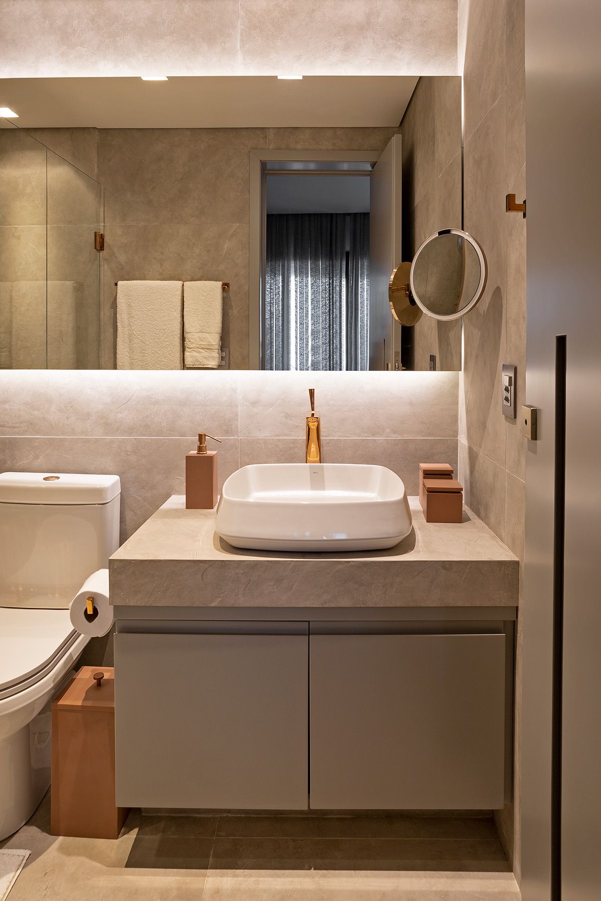 Para atender a demanda de armazenamento em uma planta com poucas paredes livres, um armário dividindo a sala e o quarto foi planejado. A cartela do apê tem predominância de cores neutras e madeira no piso e, a partir disso, foi possível atender à um dos pedidos da cliente: tons de rosa! O rosa foi aplicado delicadamente nos cômodos e os deixou bem aconchegantes, o quarto é um ótimo exemplo, além do lavabo que ficou com muita personalidade.