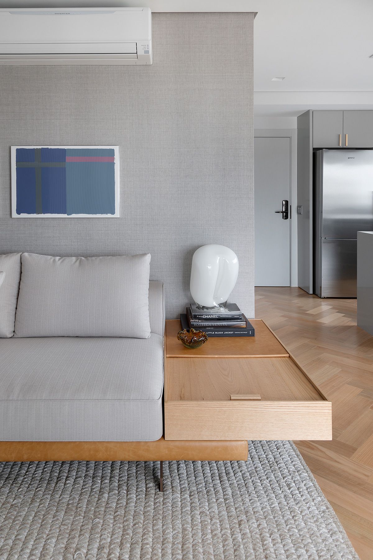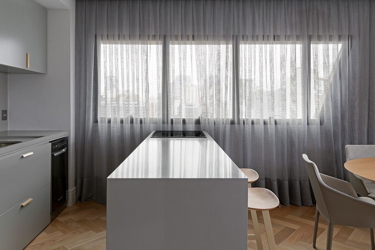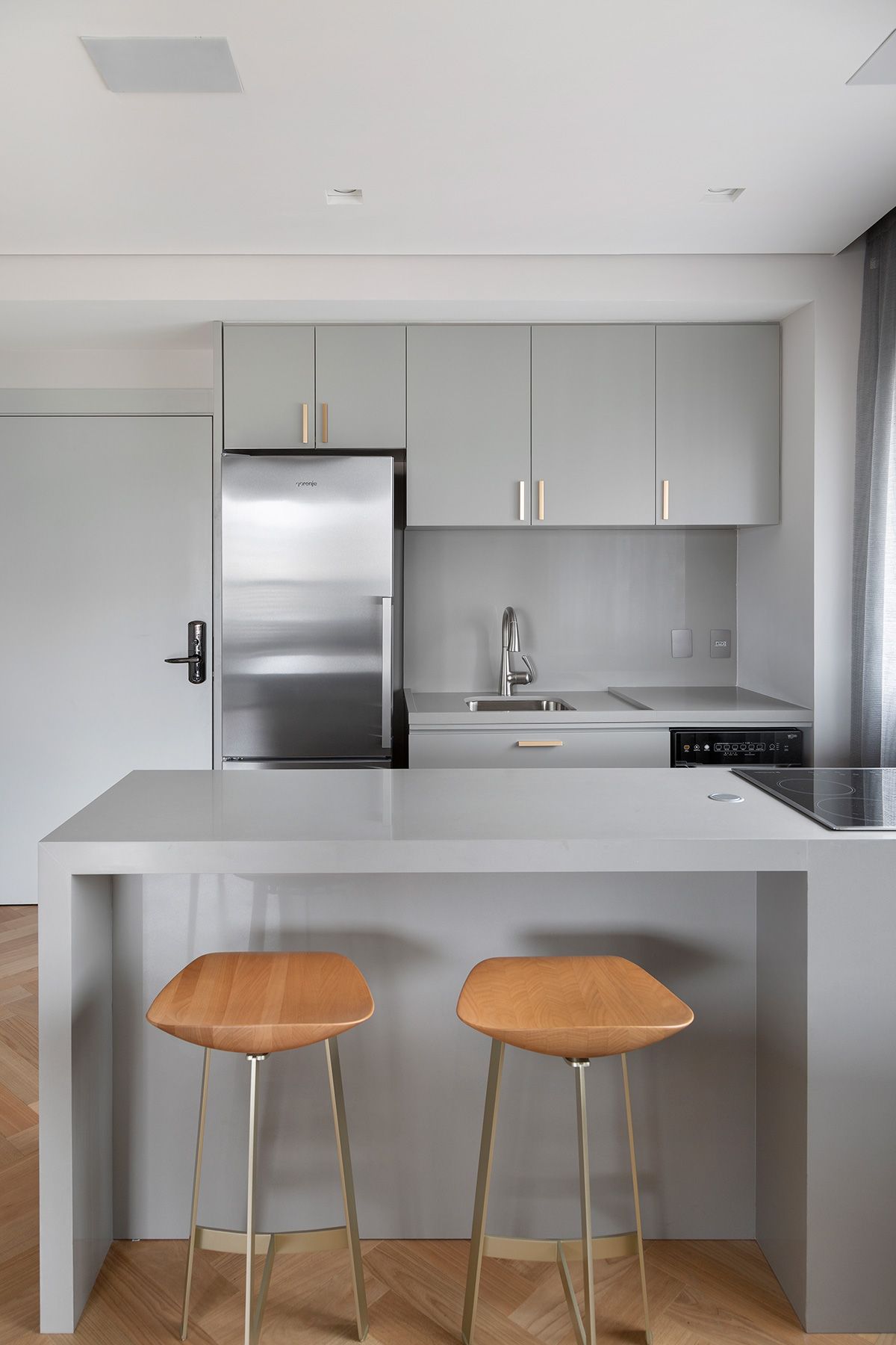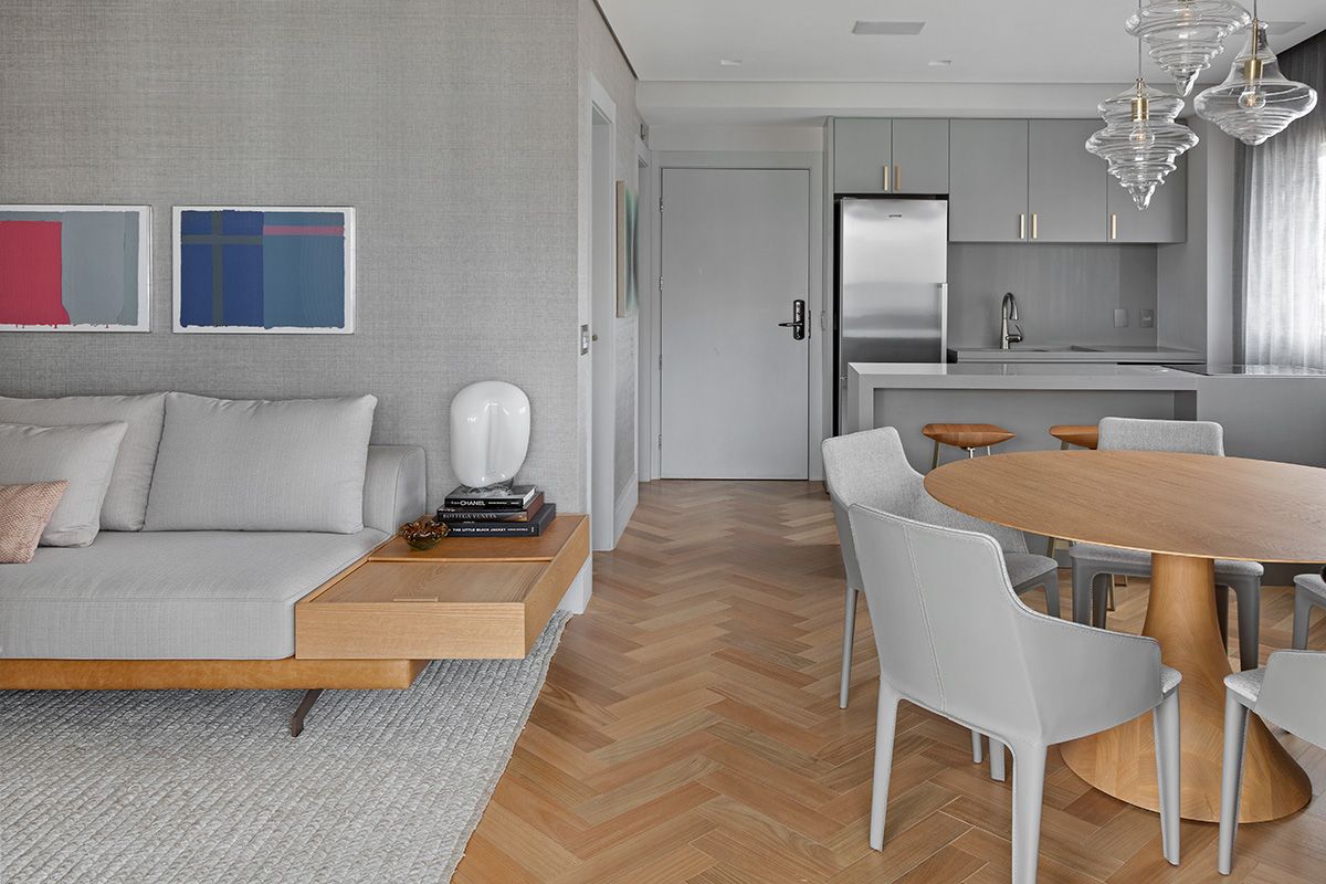 A junção de dois apartamentos – um de 47m² e outro de 49m² – resultou em uma morada idealizada por outra junção: a parceria entre o Studio Ipê e a arquiteta Drielly Nunes. Este projeto à quatro mãos foi desenhado para uma mulher de 30 anos, solteira, que buscava um lugar no bairro Vila Olímpia menor do que o que residia, e com os requisitos praticidade e funcionalidade.
