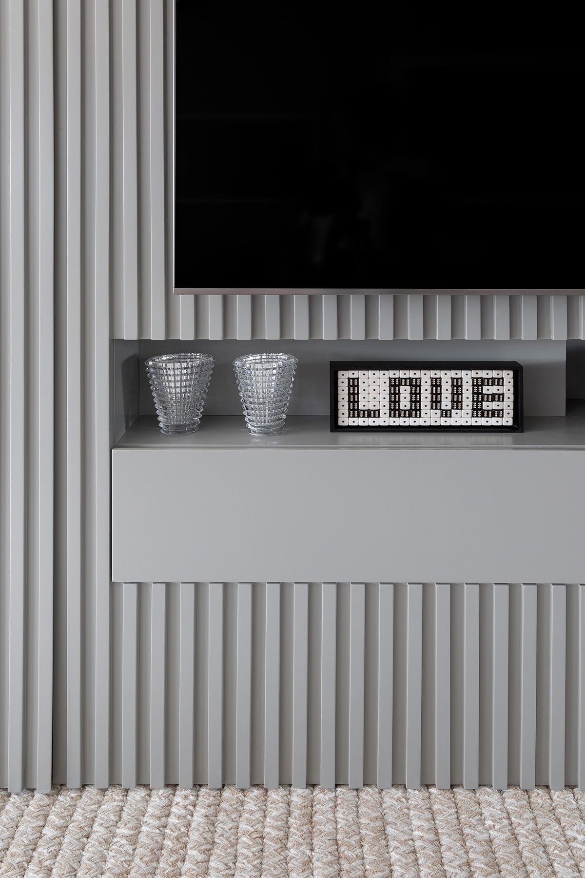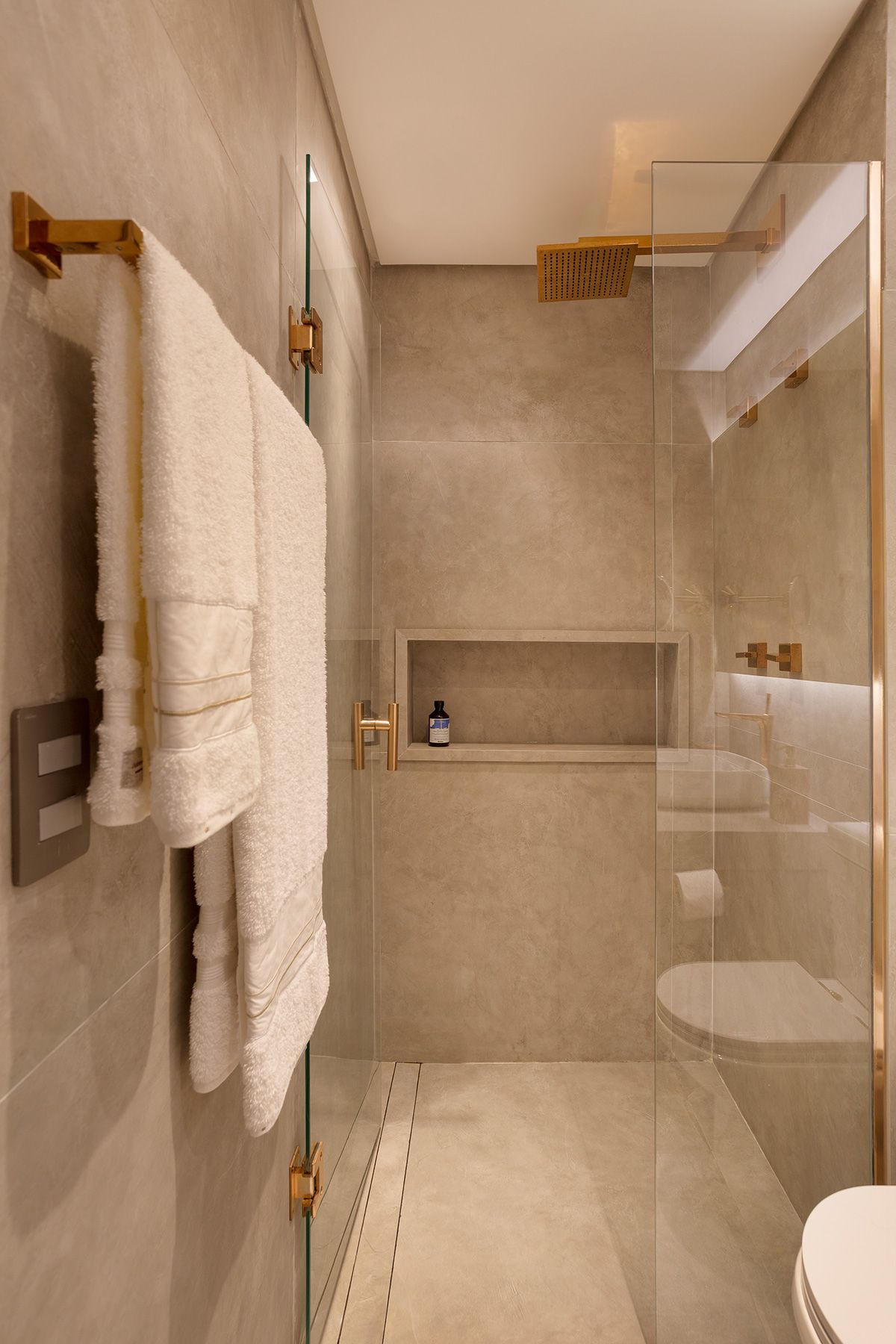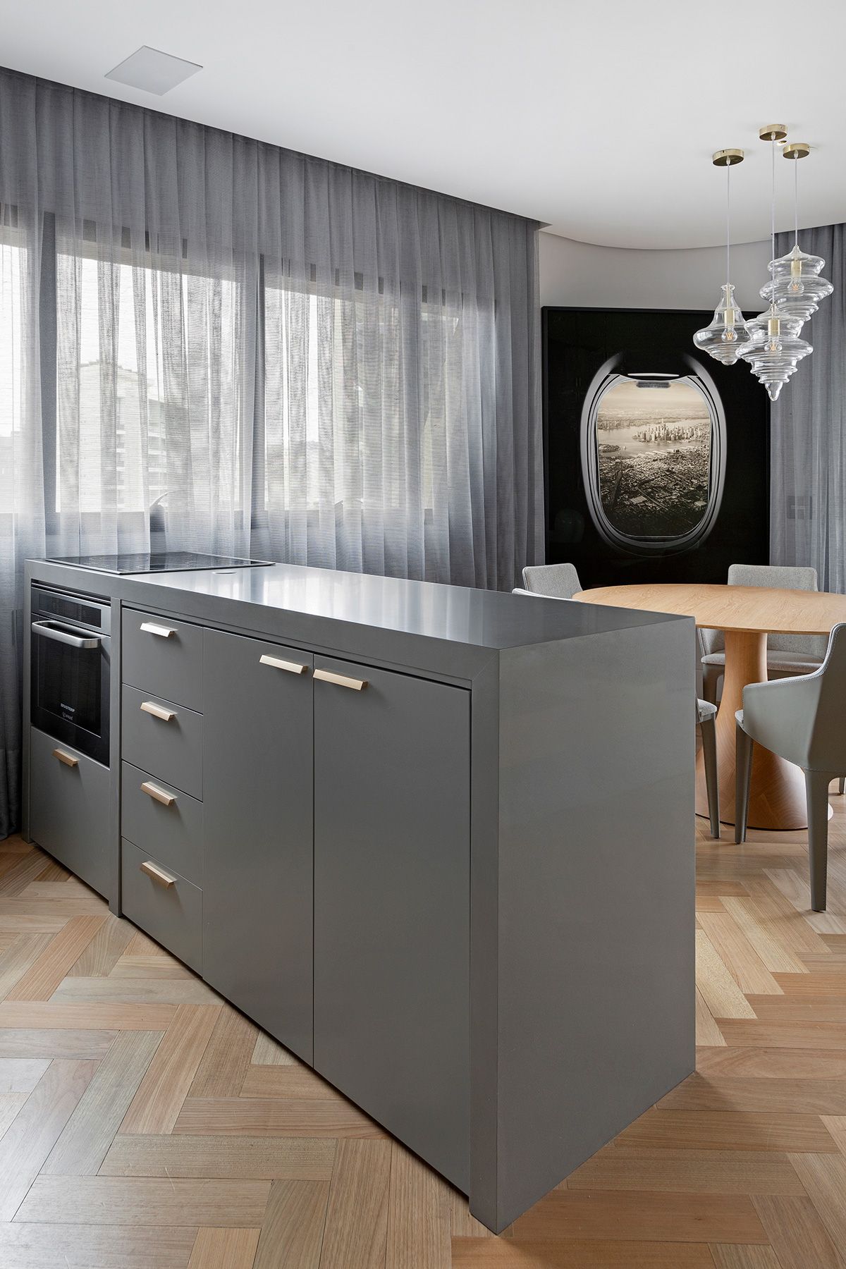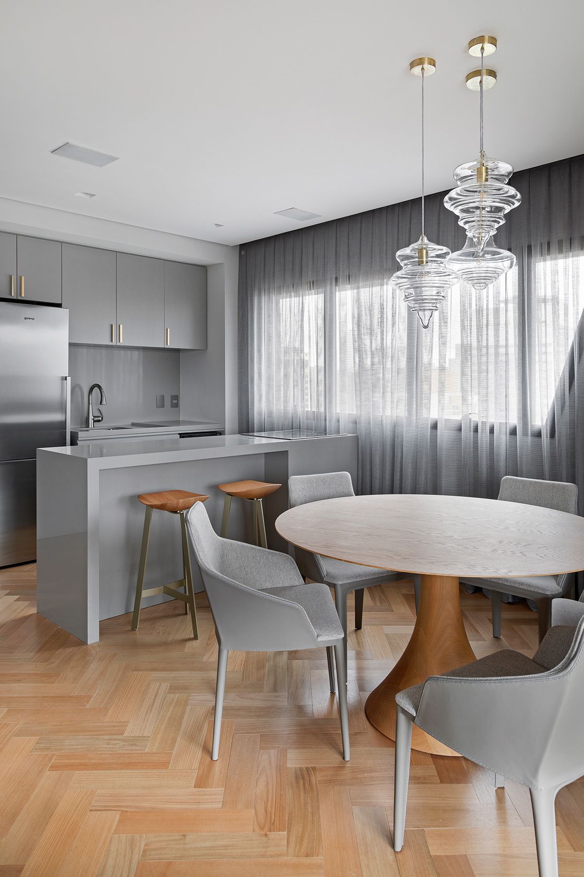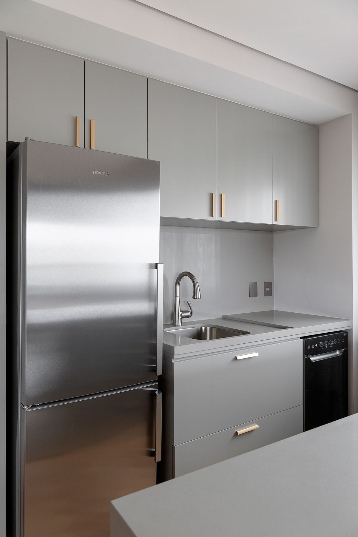 Definimos que toda a área social seria integrada e apenas a suíte seria um ambiente fechado. O principal desafio então, foi atender a necessidade de quantidade de armários da cliente, já que ela estava mudando para um apartamento com a metade da metragem em que vivia.