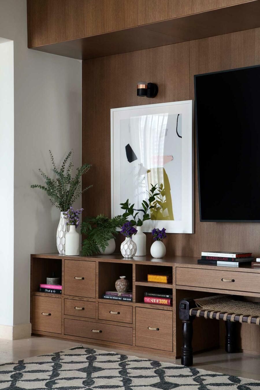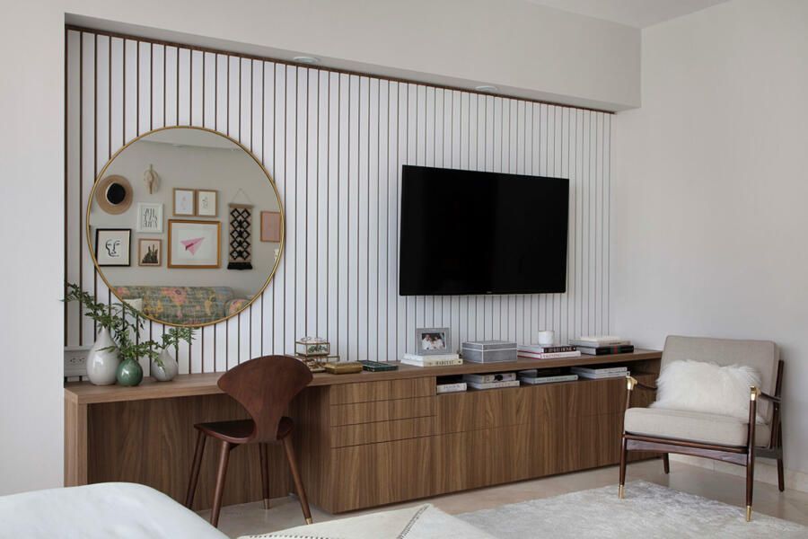 Painéis em madeira carvalho natural desenhados pela designer Daniela se repetem na sala, quarto e home office criando a unificação dos ambientes.