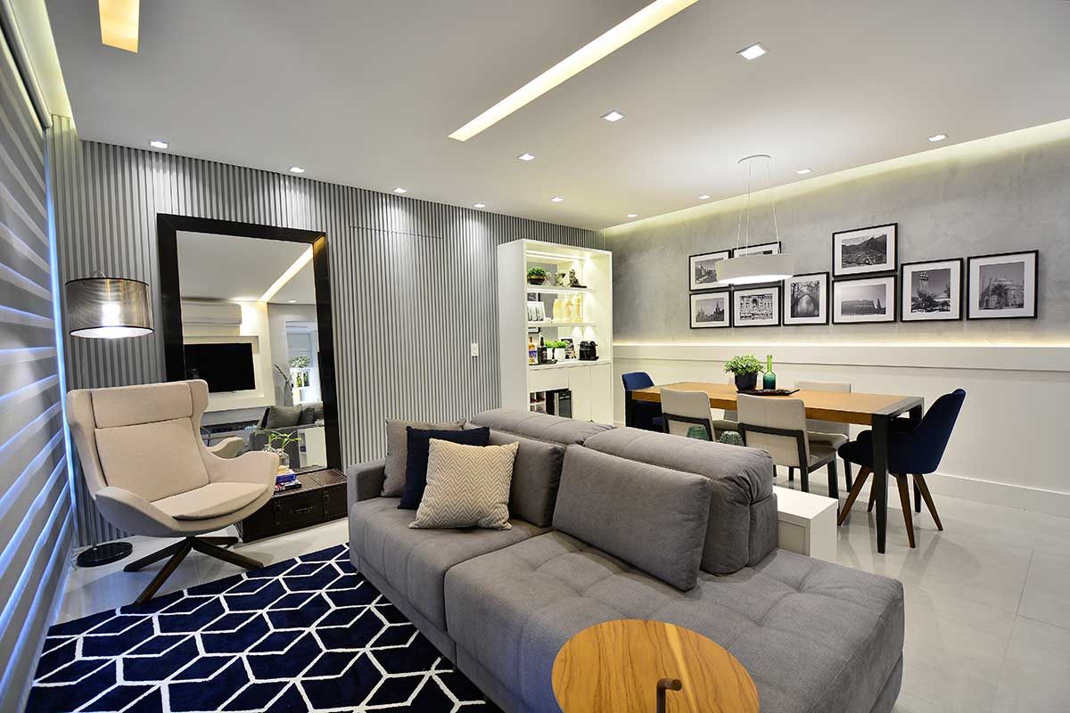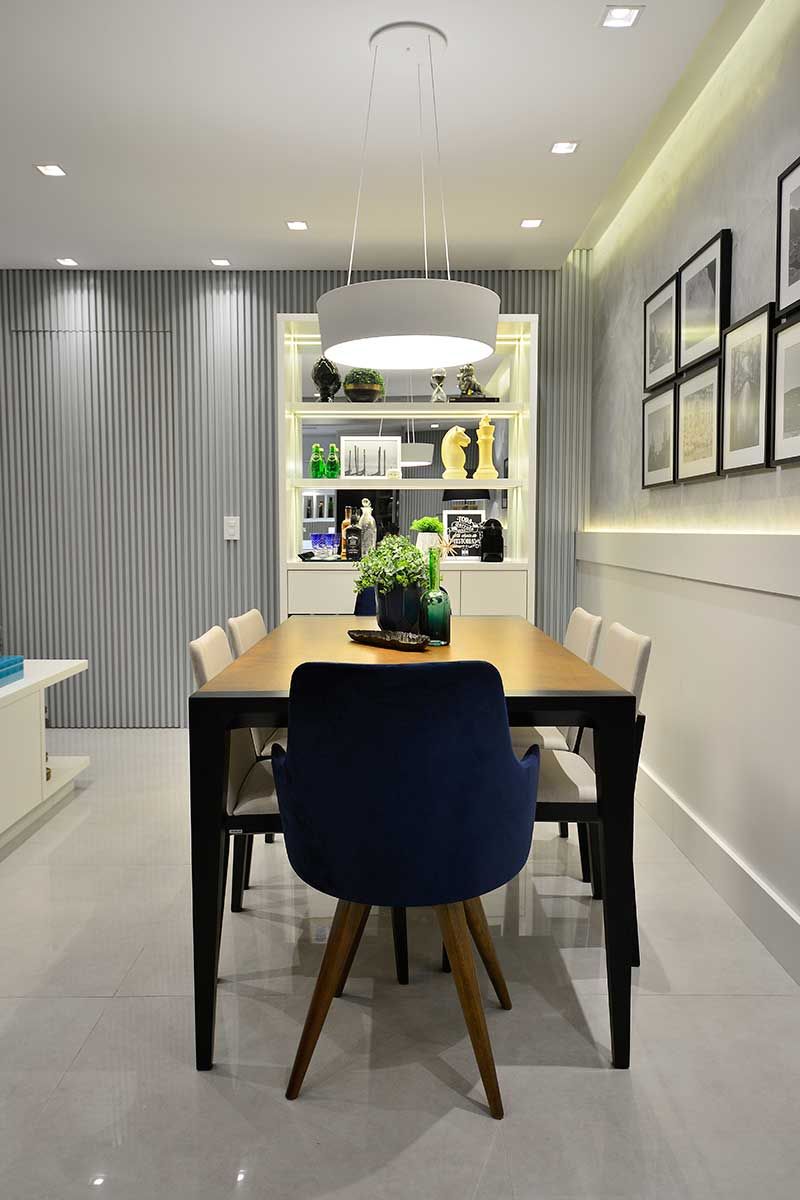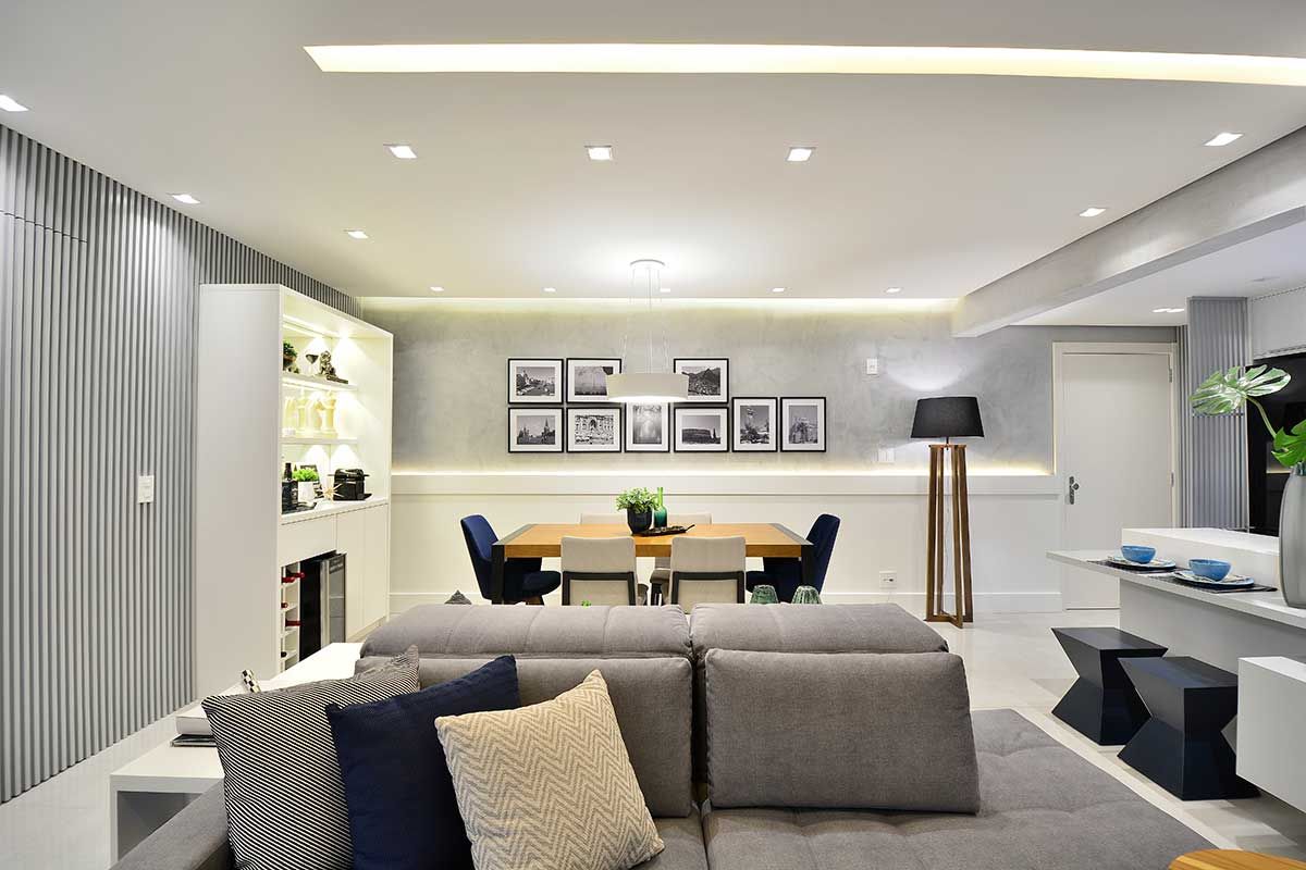 Com a intenção de destacar a área social e ocultar a área íntima, projetamos um painel ripado em toda a extensão da parede, onde o vão de acesso fica encoberto por porta camuflada.