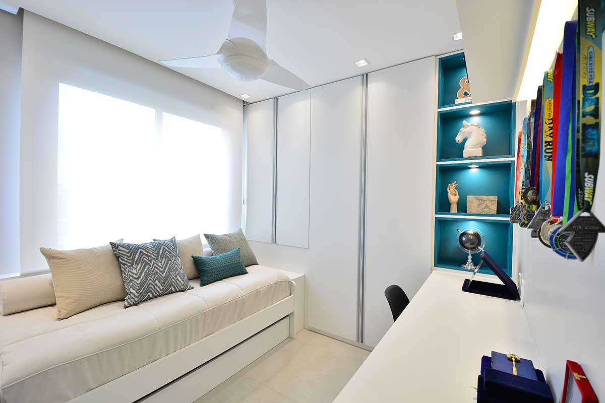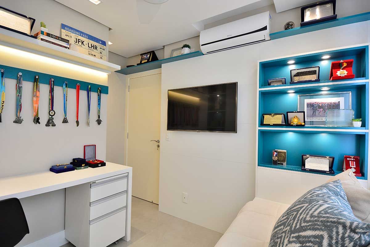 Para abrigar as abundantes medalhas e condecorações do proprietário, o quarto de hóspedes, que tem múltiplas funções, foi idealizado com nichos, prateleiras e elementos de exposição.