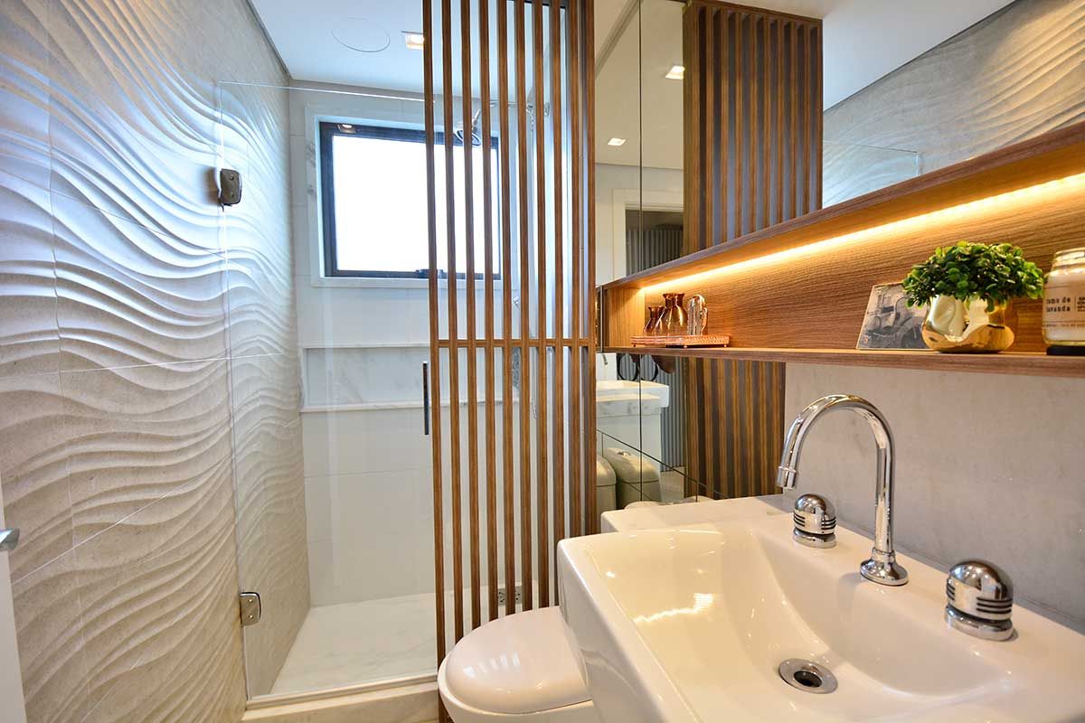 O banheiro social recebeu tratamento mais elaborado nos acabamentos, já que será utilizado com frequência como lavabo e o chuveiro terá uso eventual.