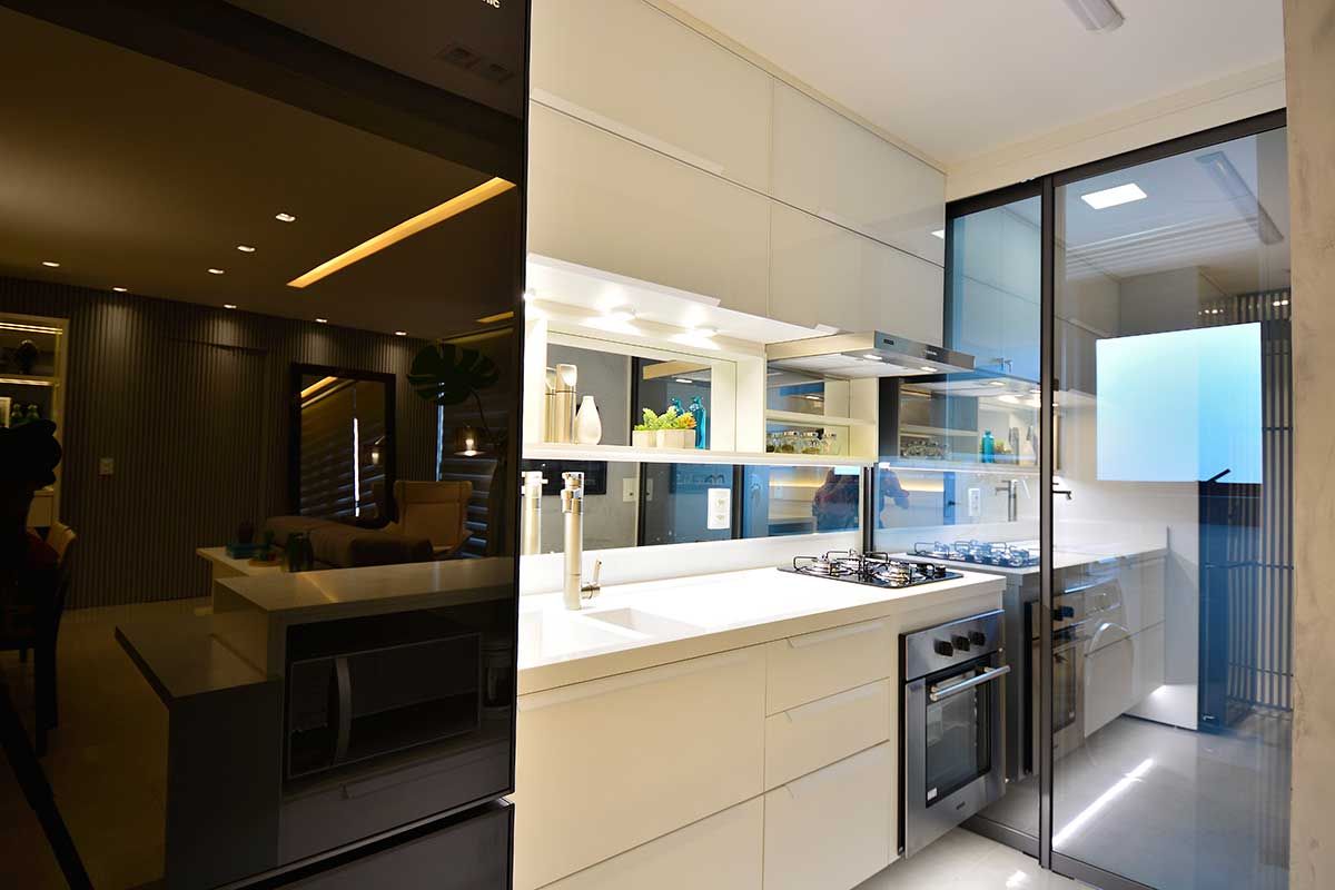 A cozinha, compacta, foi totalmente integrada esteticamente à área social. Com destaque para os espelhos e a iluminação, além da área de serviço que foi separada com uma porta de correr em vidro Reflecta.