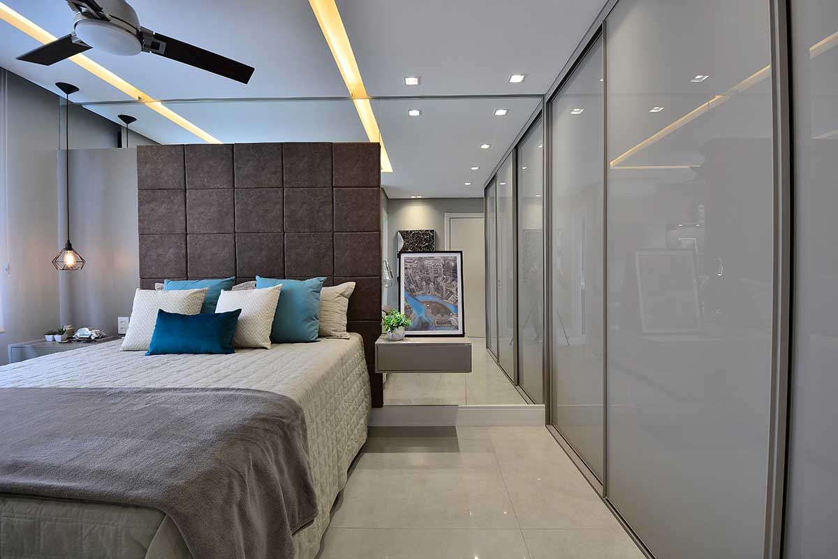 Na suíte, foram escolhidos tons relaxantes e complementares. Devido ao grande armário, que ocupa toda a lateral do ambiente, foram utilizados espelhos como recurso de amplitude próximo à cabeceira.