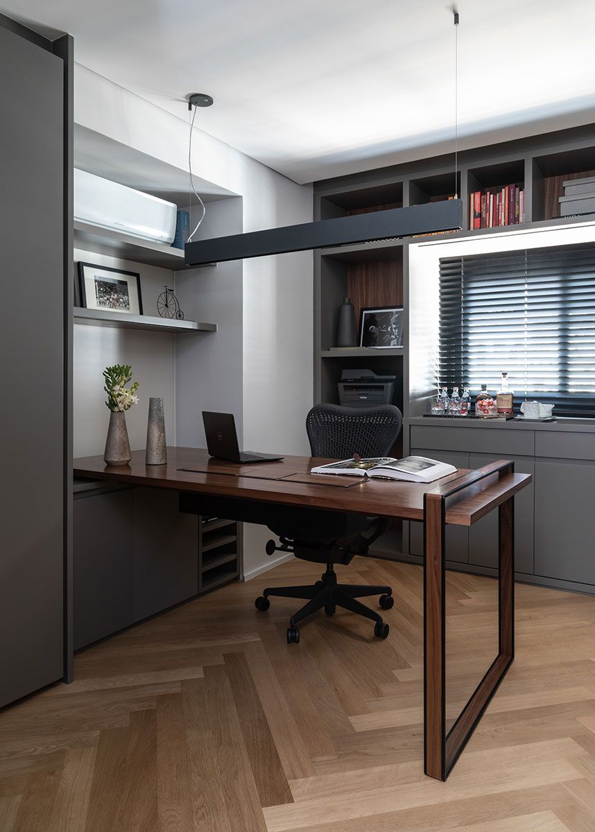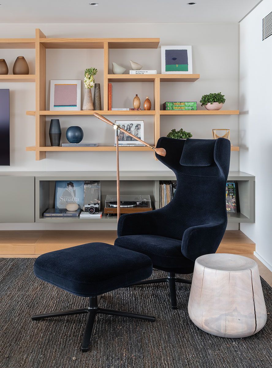 Optamos pela marcenaria desenhada para atender as necessidades do cliente e pela marcenaria iluminada para valorizar.